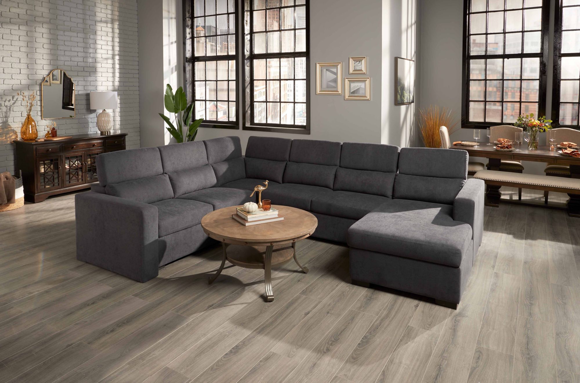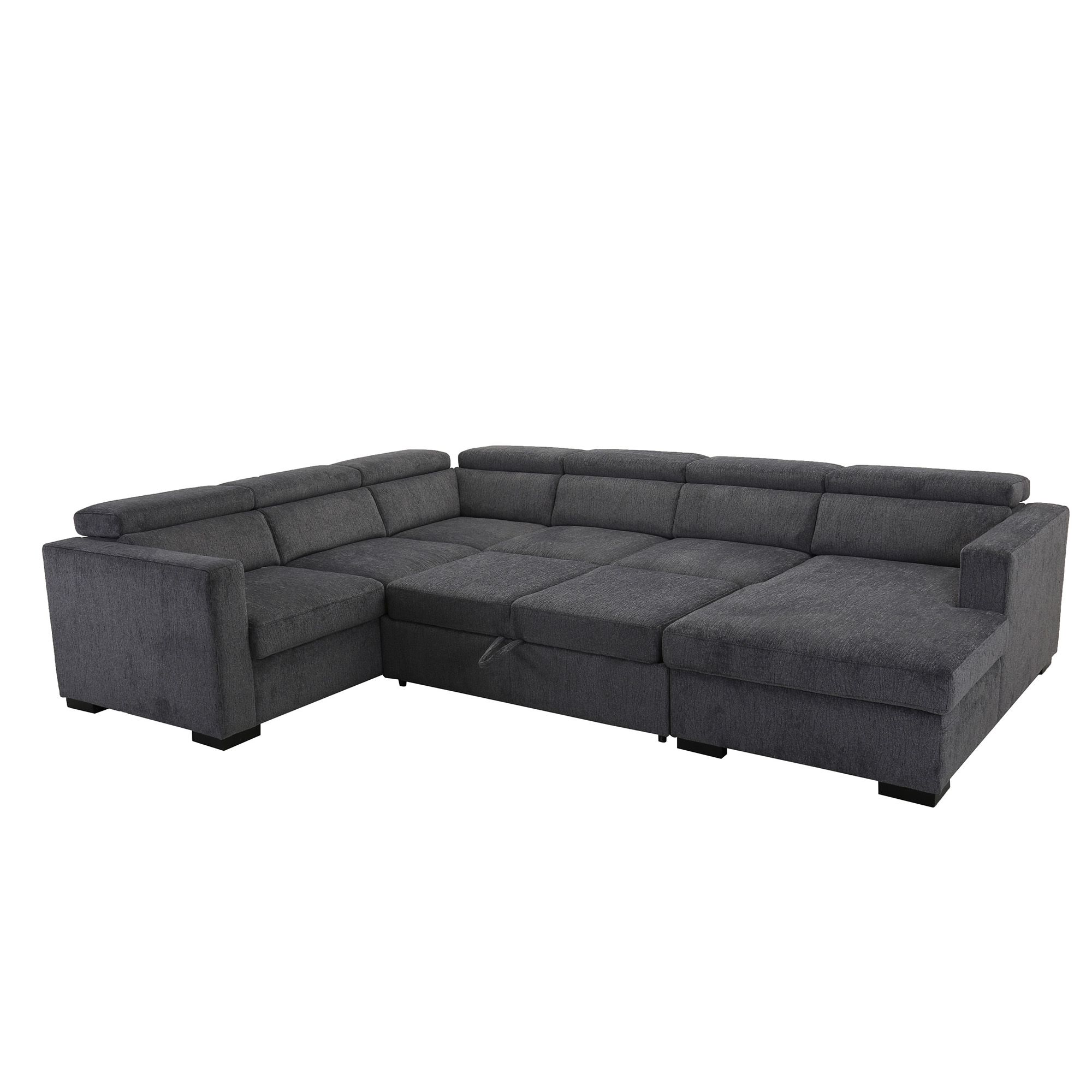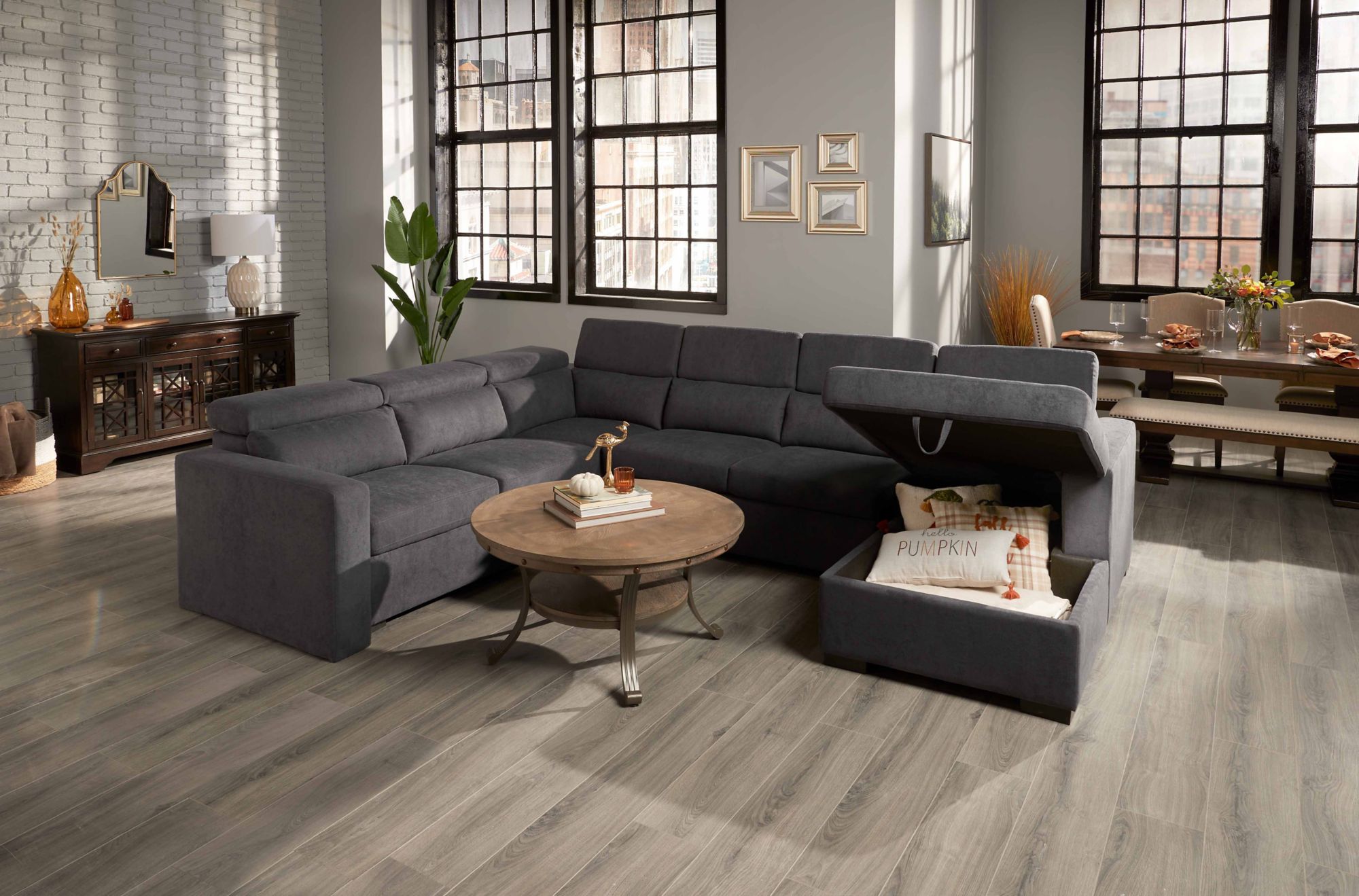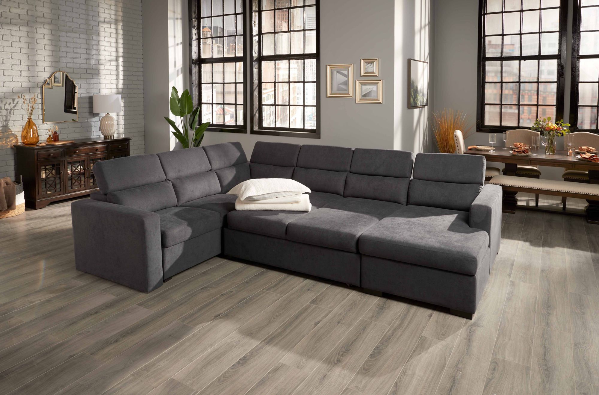 Create a cozy living and lounging space in your home with this 4-pc. stationary sectional sofa set. Wrapped in soft gray fabric and modern, stylish, clean line design not only looks great but also functional. Ratchet-style adjustable headrests provide added comfort and support. The pull-out trundle bed is ideal for additional sleeping arrangements. Chaise lounge flips up to reveal storage for blankets.