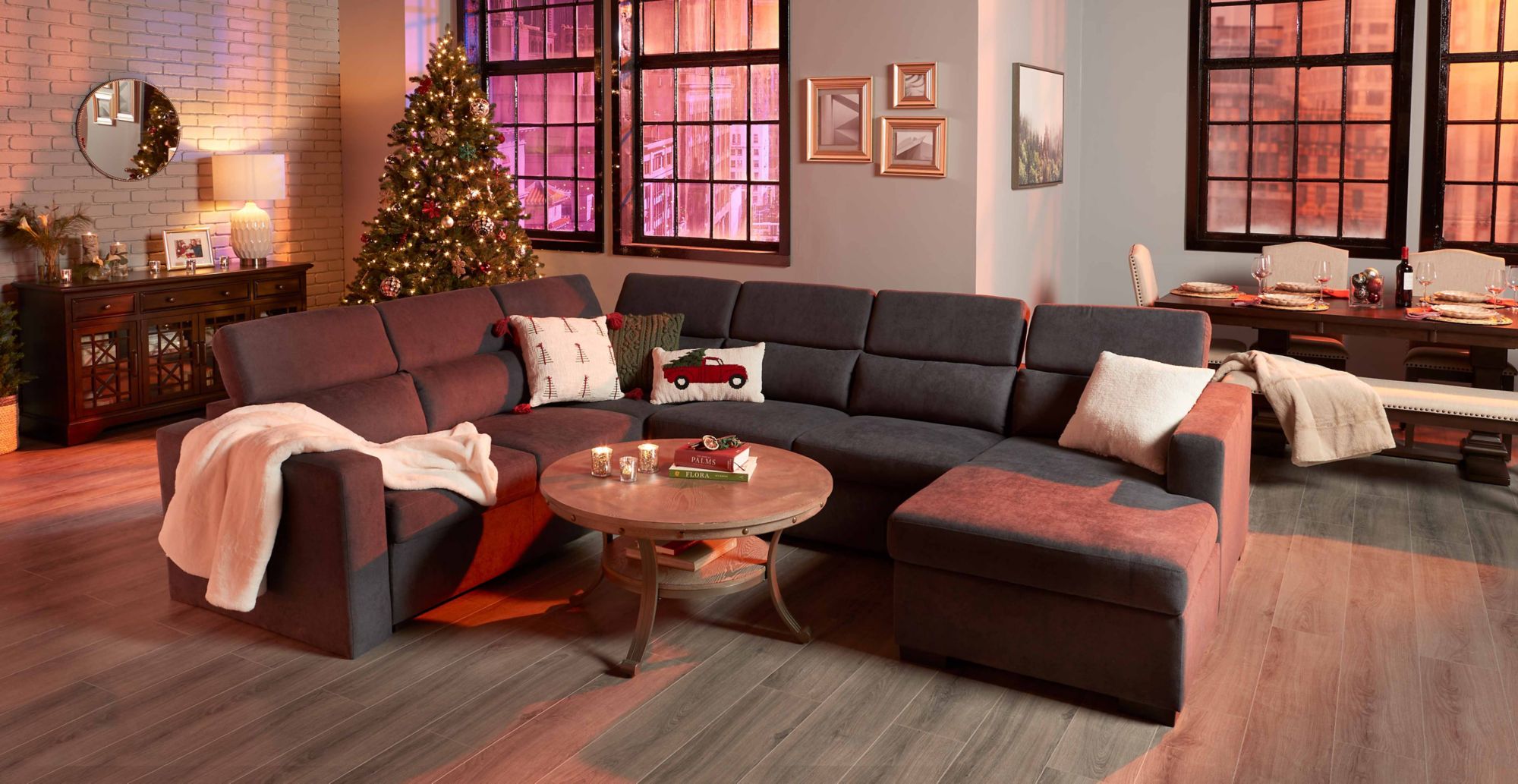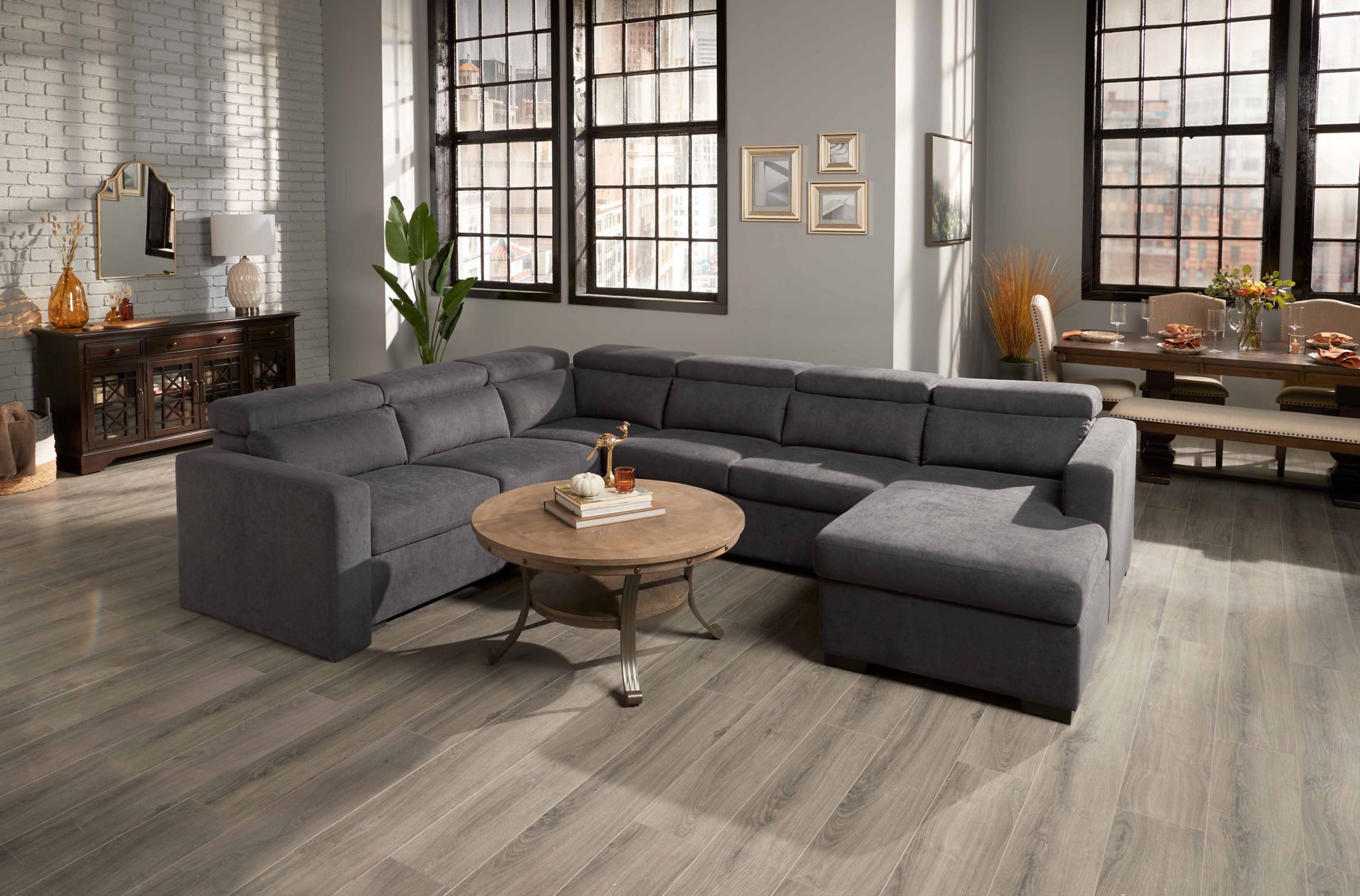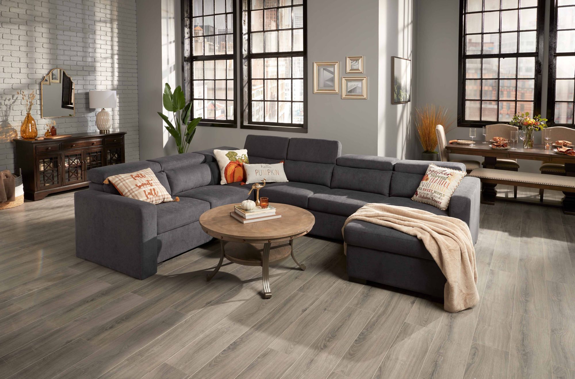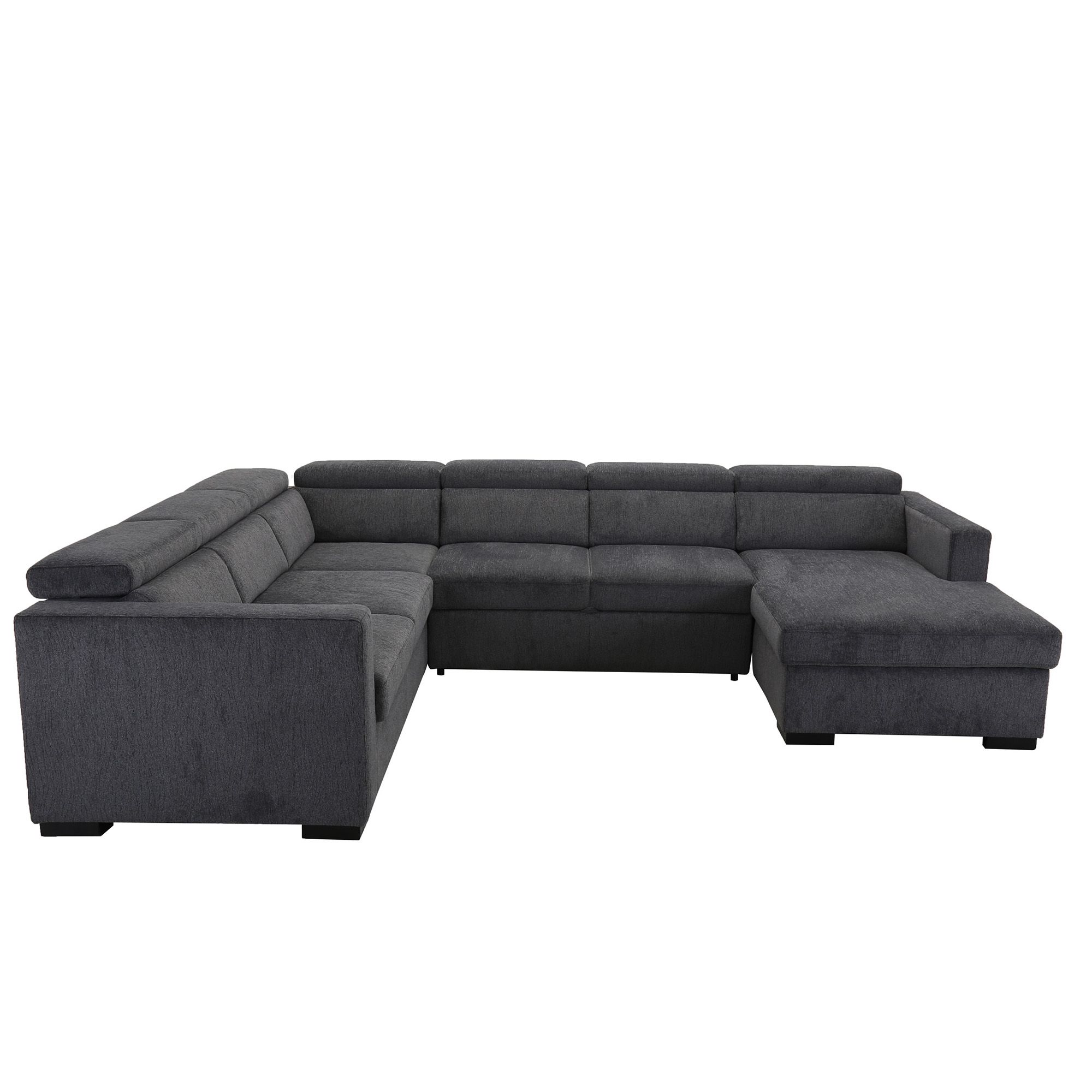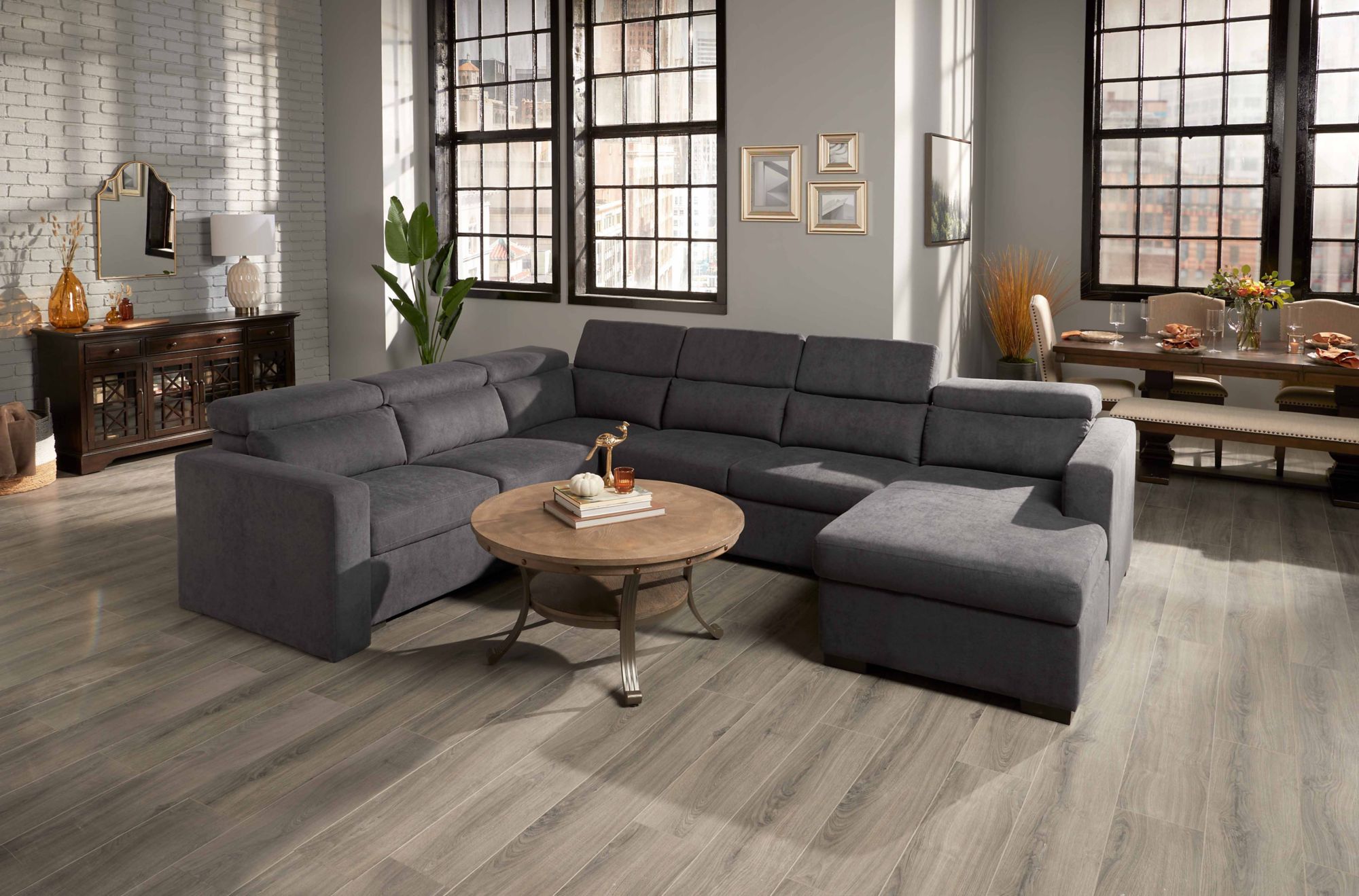Create a cozy living and lounging space in your home with this 4-pc. stationary sectional sofa set. Wrapped in soft gray fabric and modern, stylish, clean line design not only looks great but also functional. Ratchet-style adjustable headrests provide added comfort and support. The pull-out trundle bed is ideal for additional sleeping arrangements. Chaise lounge flips up to reveal storage for blankets.