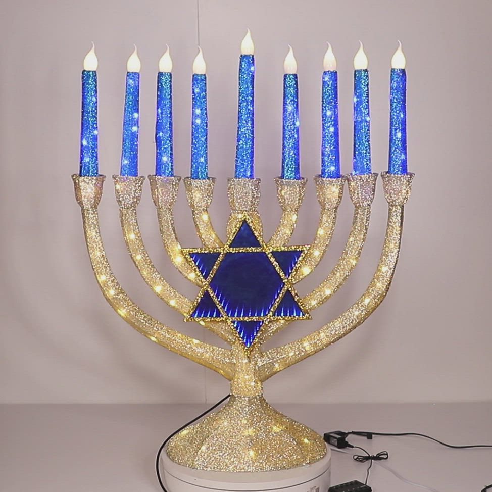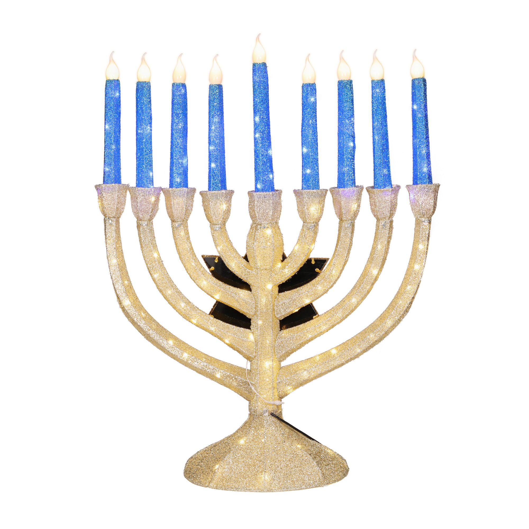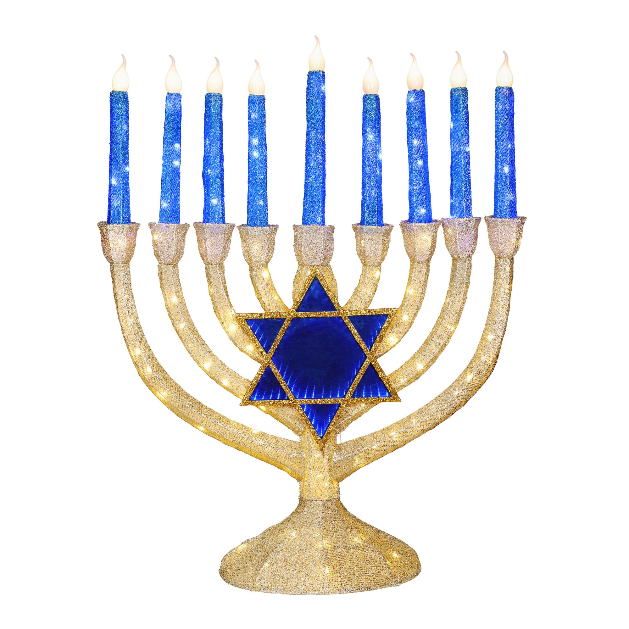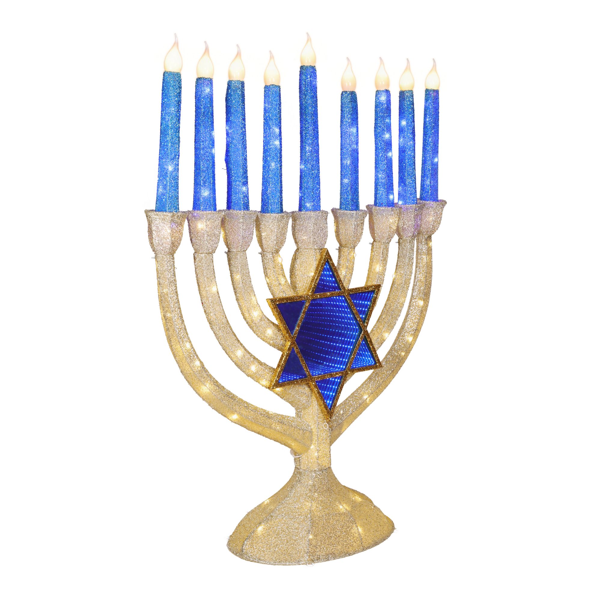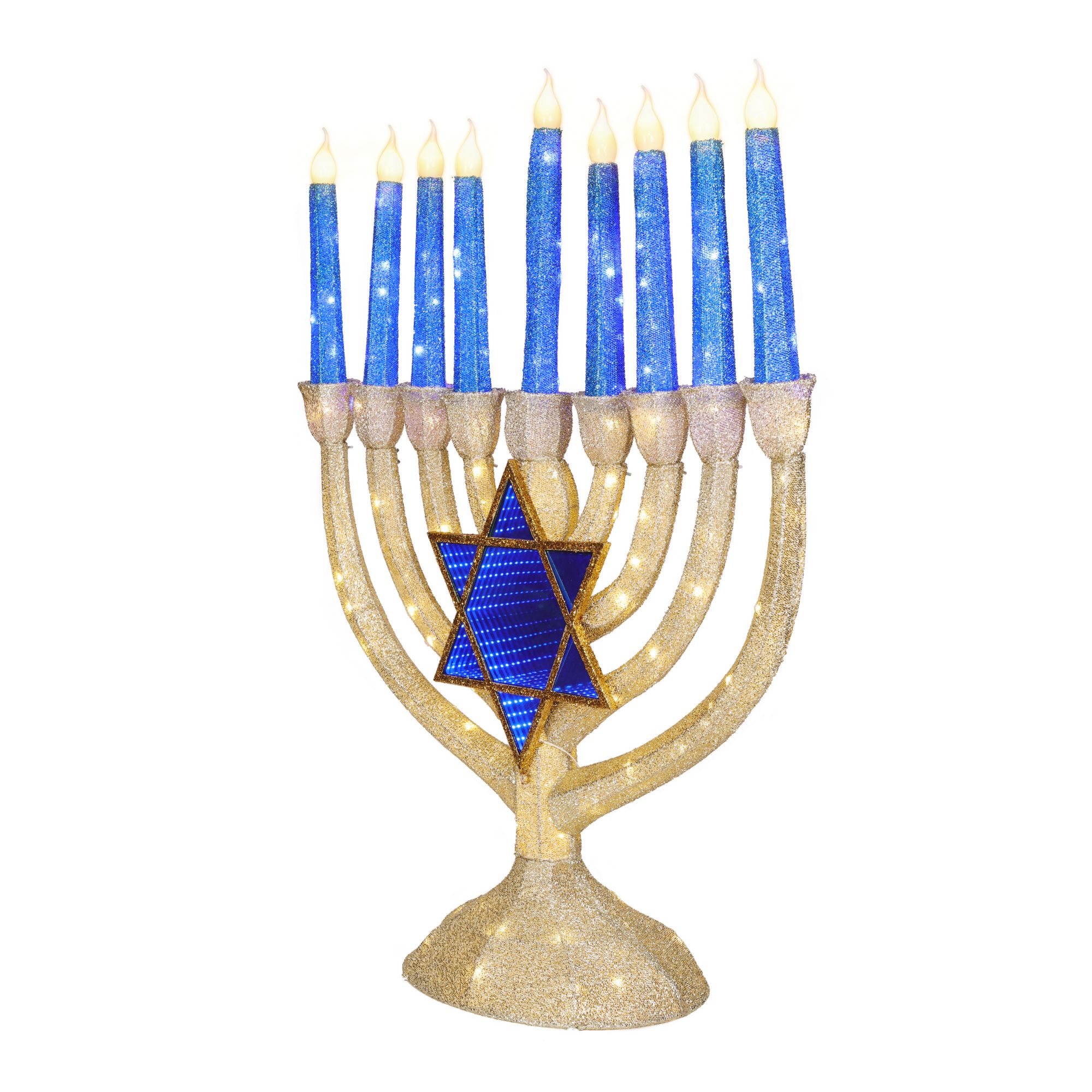 Includes 4' tall indoor/outdoor Menorah, 280-Pc. Blue/warm White twinkling LED lights