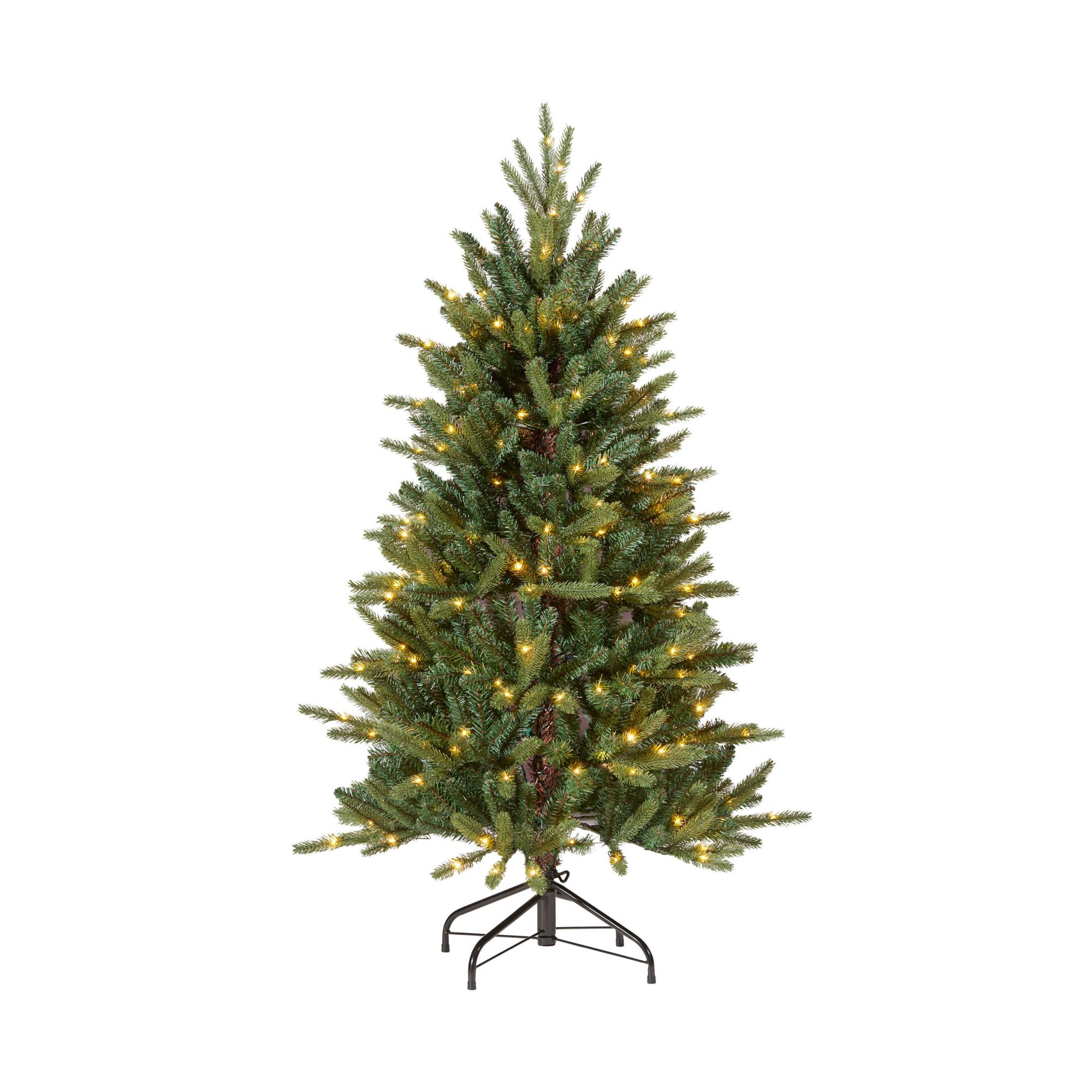 Berkley Jensen 4.5' Williston color-changing LED tree will surely add charm to your Christmas celebration. With state-of-the-art hinged construction, this tree is simple to set up and provides a full natural, and realistic look. This lavish artificial Christmas tree features 550 realistic branch tips, 200 hassle-free pre-strung 8-function warm white/multicolor(R/Y/B/G/P) microdot LED Sylvania lights, a 34" diameter, foot pedal, and a metal stand. This tree will light up any room and create those special holiday memories.