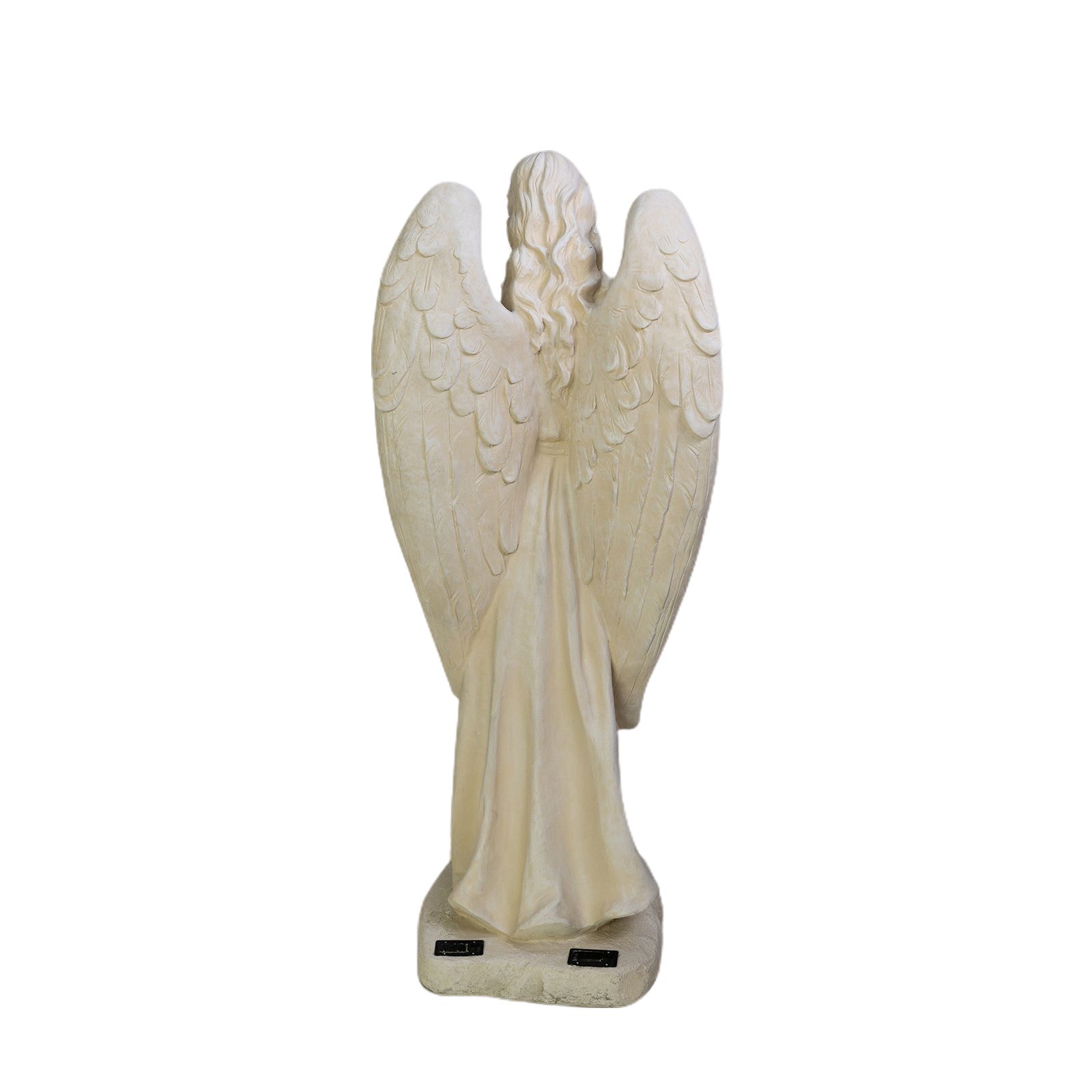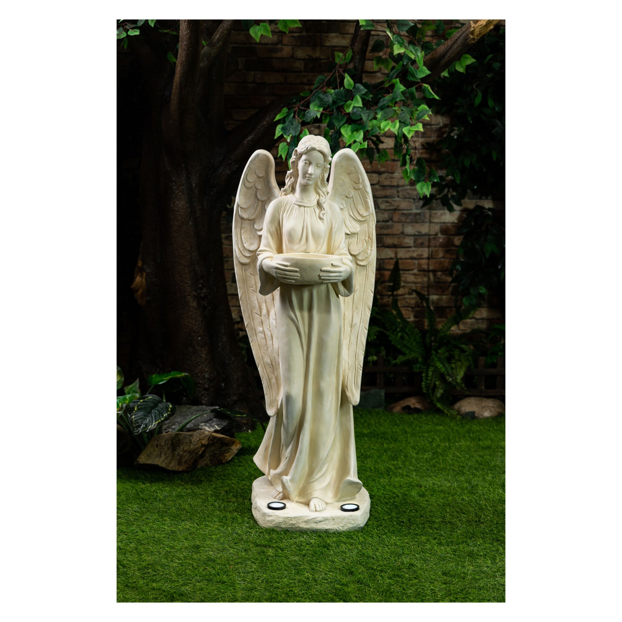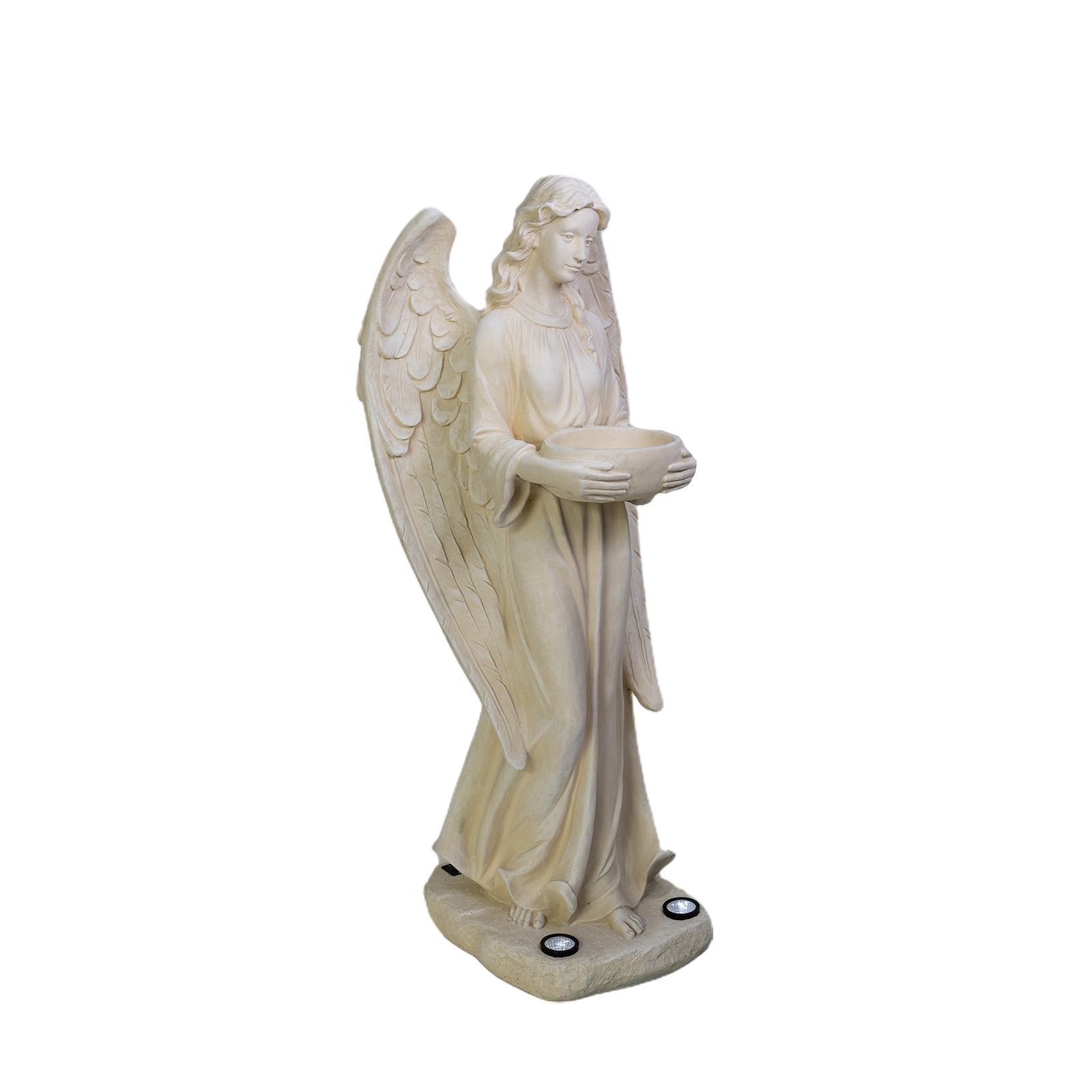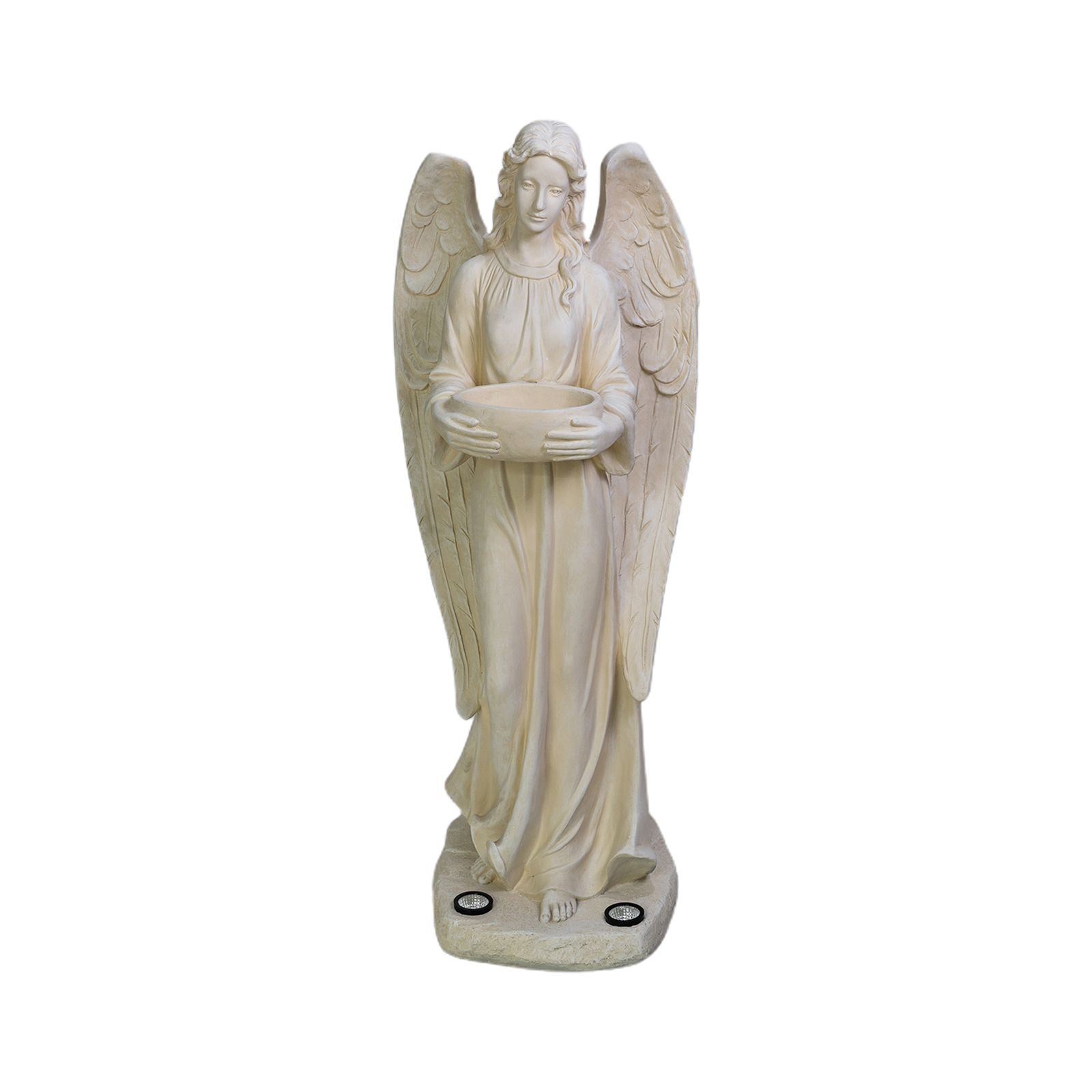 The intricately detailed standing angel outdoor garden statue with bird bath is a beautiful and peaceful addition to your garden or outdoor décor. This tranquil Angel guardian statue will set the mood in a flower bed or a quiet corner of your outdoor living area for meditation or greeting your guests while attracting beautiful birds. Made of reinforced glass fiber cement with a weathered finish, bring the charm of nature and a touch of elegance to your own backyard. Perfect for nature lovers, outdoor enthusiasts, bird watchers, gardeners and more. The shallow basin allows easy access for all bird types and easy cleaning, care, and maintenance. Simply wash clean, and refill when the water gets murky, so birds always have a fresh, sparkling water source when they come to visit. Large enough to accommodate a flock of birds, yet small enough to stay out of the way.