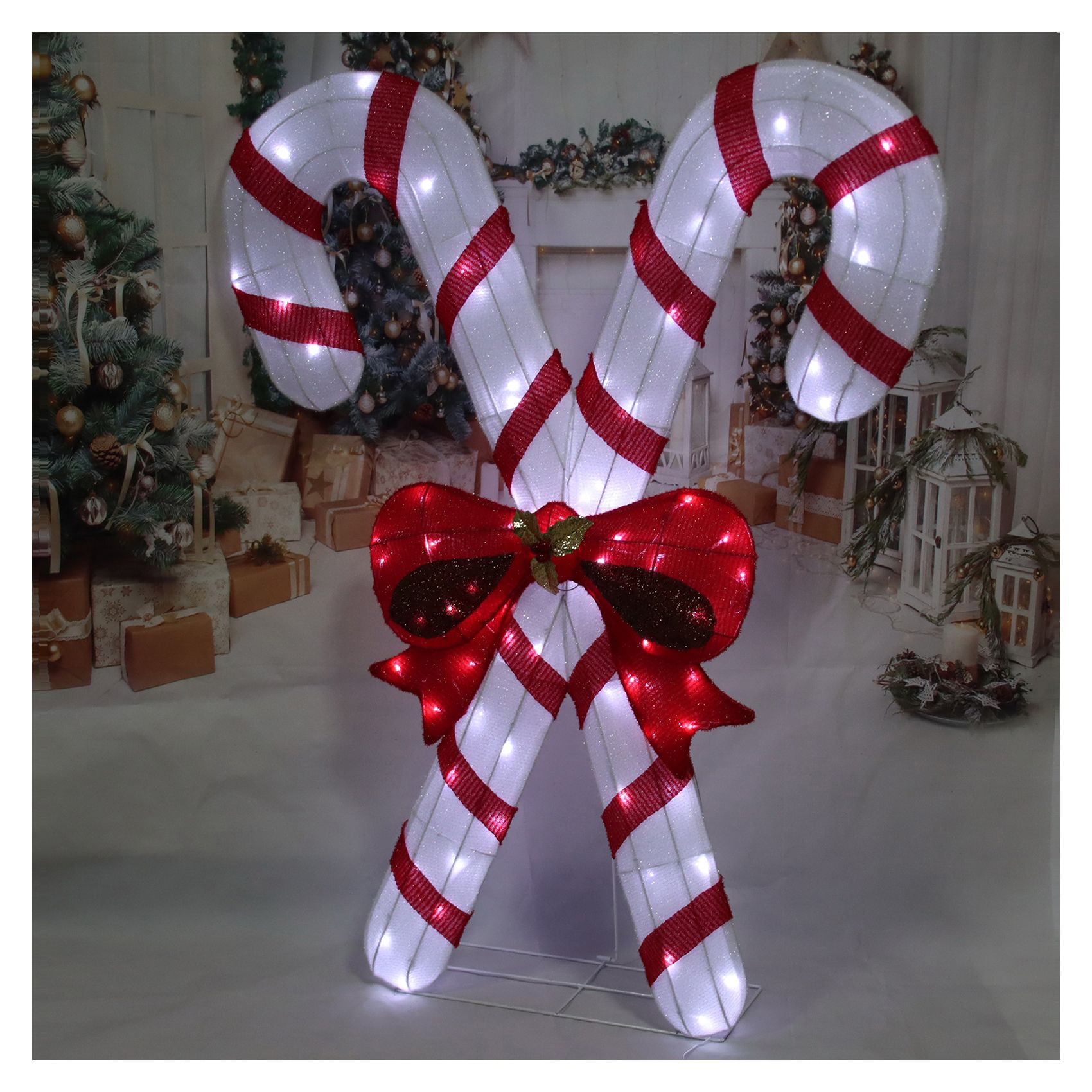 The Berkley Jensen large pre-lit Candy Cane stands 46" tall, is constructed of a sturdy metal frame and covered with sparkly white fabric material. This Christmas yard decoration is meant for indoor or outdoor display. Also included is a 6 hour on / 18 hours off timer with a UL low voltage outdoor adaptor. The decoration is lit up with 90 cool white LED lights that make it sparkle and shine. The long lasting LED works well in rain or frost, allowing it the be used year after year. Let Berkley Jensen help decorate your garden or path to make your house stand out. The simple, but classic, look will bring that festive feel to your home each holiday season.