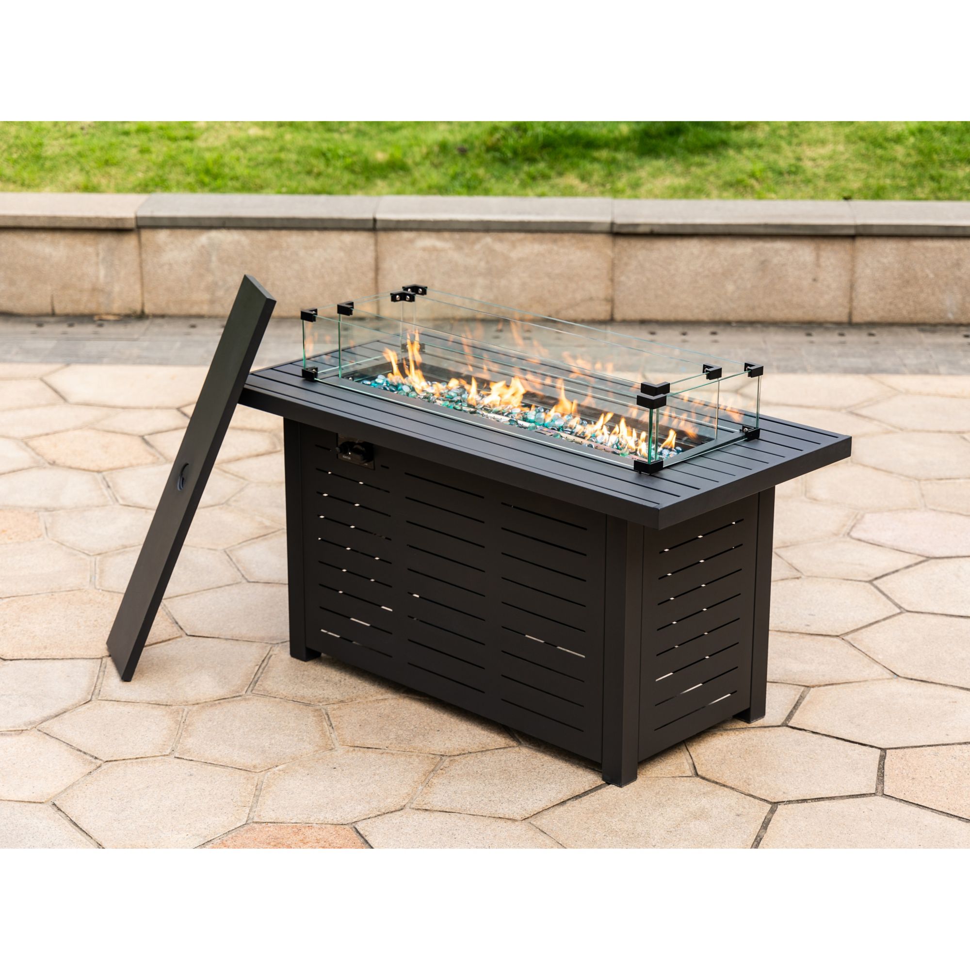 This metal gas fire pit comes with blue glass beads, a metal cover and a PU cover. This is the perfect complement for cool summer evenings with family or friends. Enhance your patio deck or any outdoor living space with this beautifully designed metal fire pit to create a timeless classic décor style. 60,000 BTU heat output from a propane tank (not included) concealed by the decorative side panels uses a pulse ignition start and easy adjustment of flame with simple switch control, the included blue glass beads enhance the feel and look of hot embers glowing in the fire. It is toasty enough to keep you warm well into the chilly fall season. Lighter than a traditional solid brick fireplace, this lovely fire pit can easily be moved to shelter inside during harsh weather using the included PU cover for added protection. Easy to clean and maintain enjoy your fire pit for years to come.