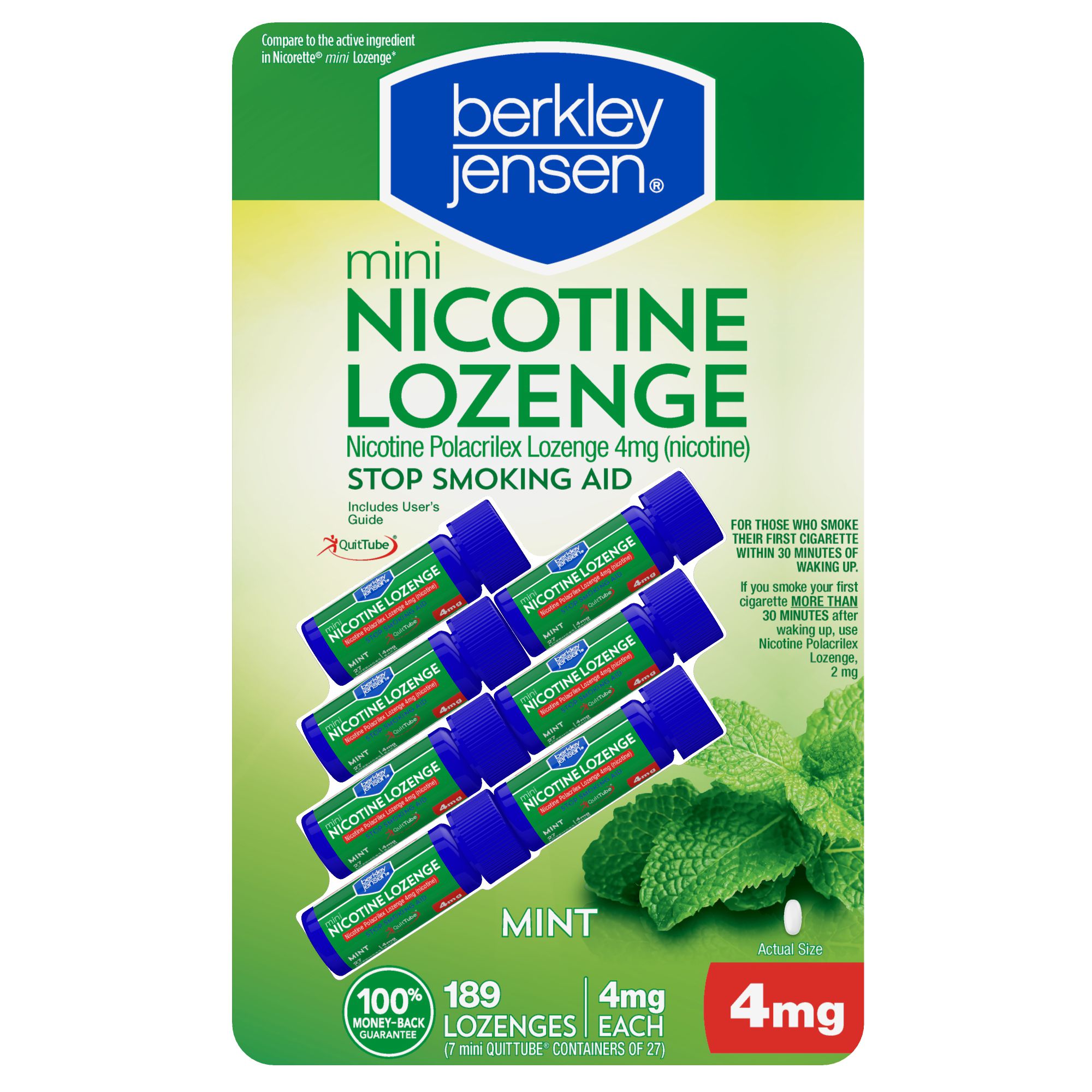 Double your chance to successfully quit smoking with Mini Nicotine Polacrilex Lozenge, 4 mg (when used as directed with a support program. Many people require several quit attempts to stop smoking). Mini Nicotine Polacrilex Lozenge, 4 mg (nicotine), Mint Flavor is a stop smoking aid for those who smoke their first cigarette within 30 minutes of waking up. This product is part of a Nicotine Replacement Therapy, which is designed to wean your body off cigarettes. It helps to regulate, control and gradually reduce your body's nicotine cravings. Smoking has two addictive components, a physical and a mental need for the nicotine in tobacco. Nicotine lozenge addresses the physical need to smoke by reducing withdrawal symptoms, including nicotine cravings. American Cancer Society (ACS) supports nicotine replacement therapy to help people on their journey towards a smoke-free lifestyle. Compare to Nicorette mini Lozenge active ingredient.