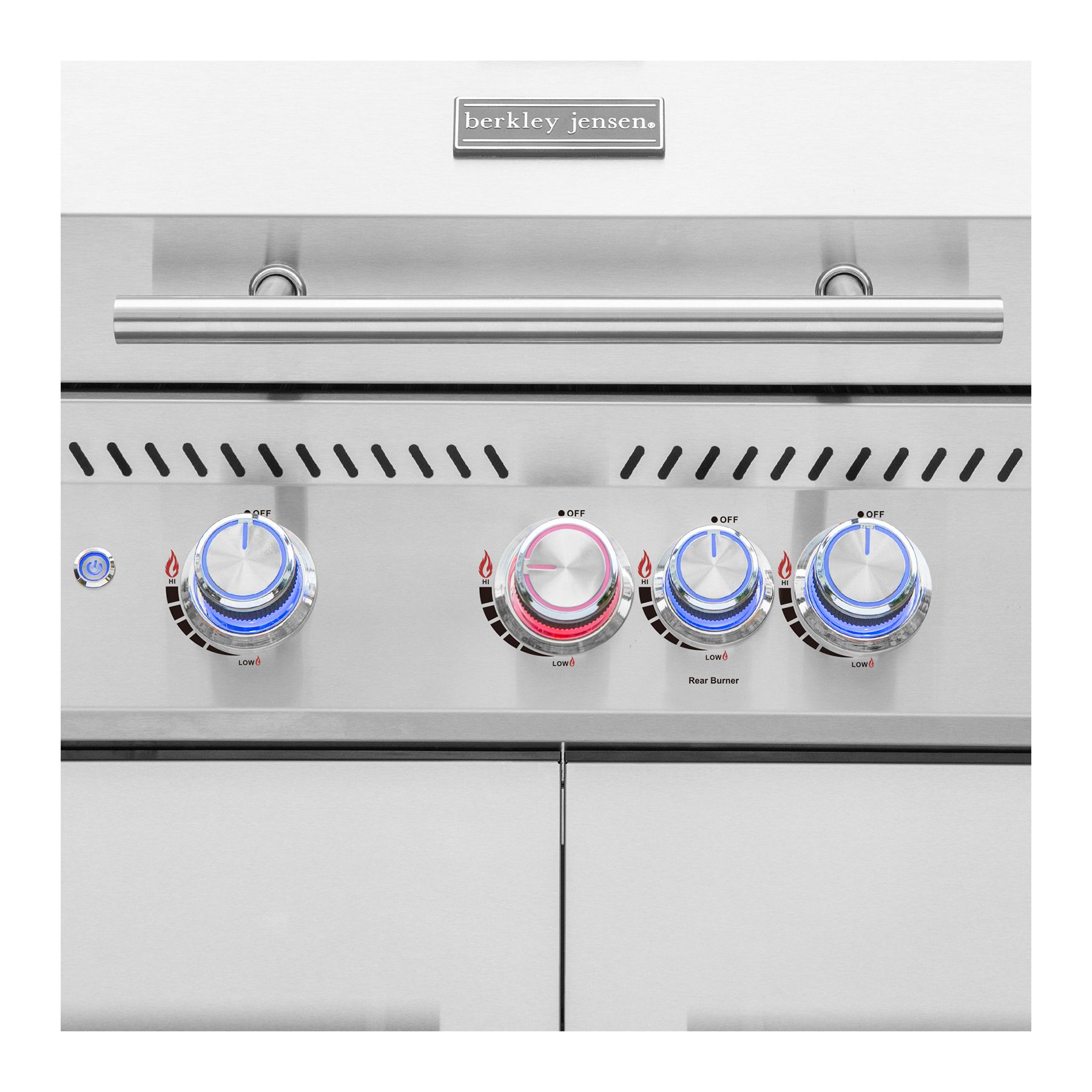 Searing steaks or cooking vegetables, melting cheese, or smoking salmon, our Berkley Jensen 5-Burner Gas Grill will help you to get perfect flavors. With 376-sq.-in. of total cooking space, four main burners, a sear burner, a side burner and a rear burner generate a total of 80,000 BTU cooking power, it fulfills a large party to entertain friends or just have a free time barbecue at will with families. The rectangular temperature gauge and safety-grip LED control knobs help regulate the temperature meanwhile provides a modern look. Breezily transport it around your house with four universal casters.