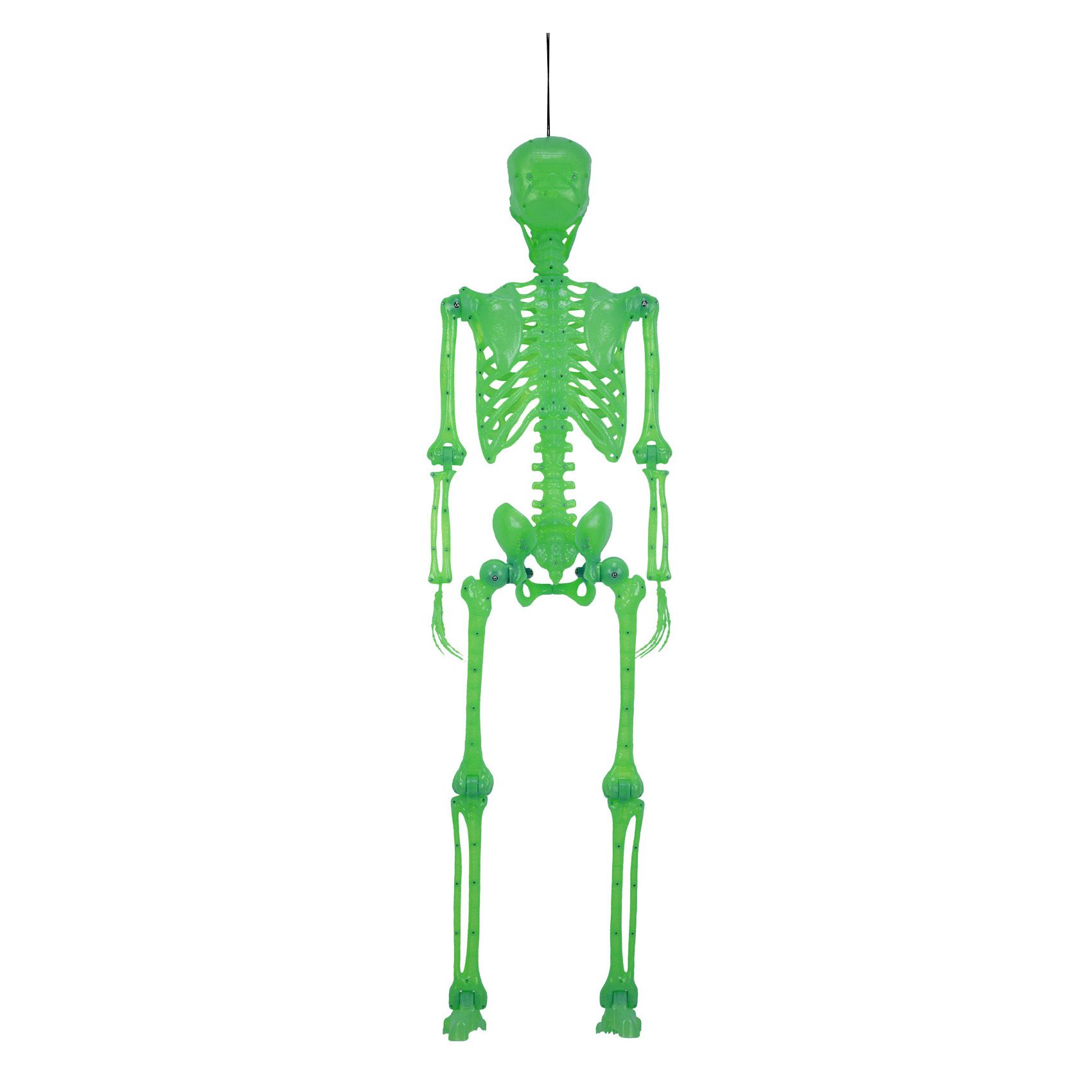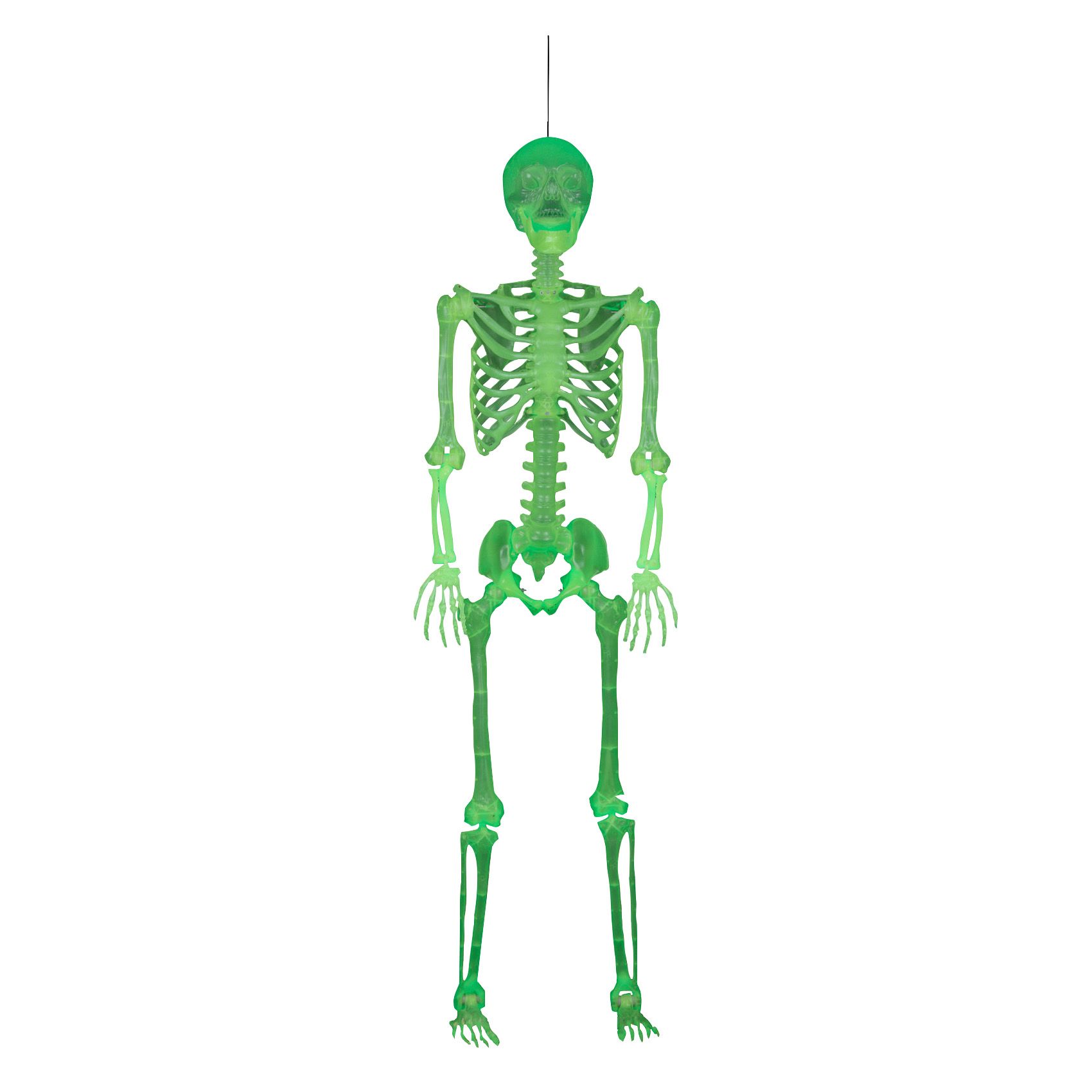 No bones about it. Finished with a glow-in-the-dark exterior, this realistic skeleton makes a bone-chilling addition to your indoor Halloween decorations. Pose your skeleton in a chair, on a table, or wherever you need an extra spooky touch. Includes a built-in loop for hanging.