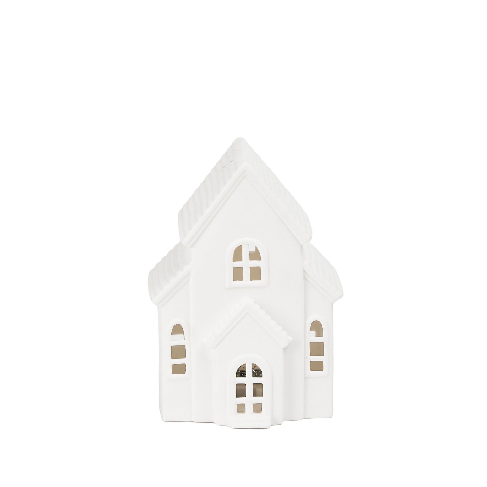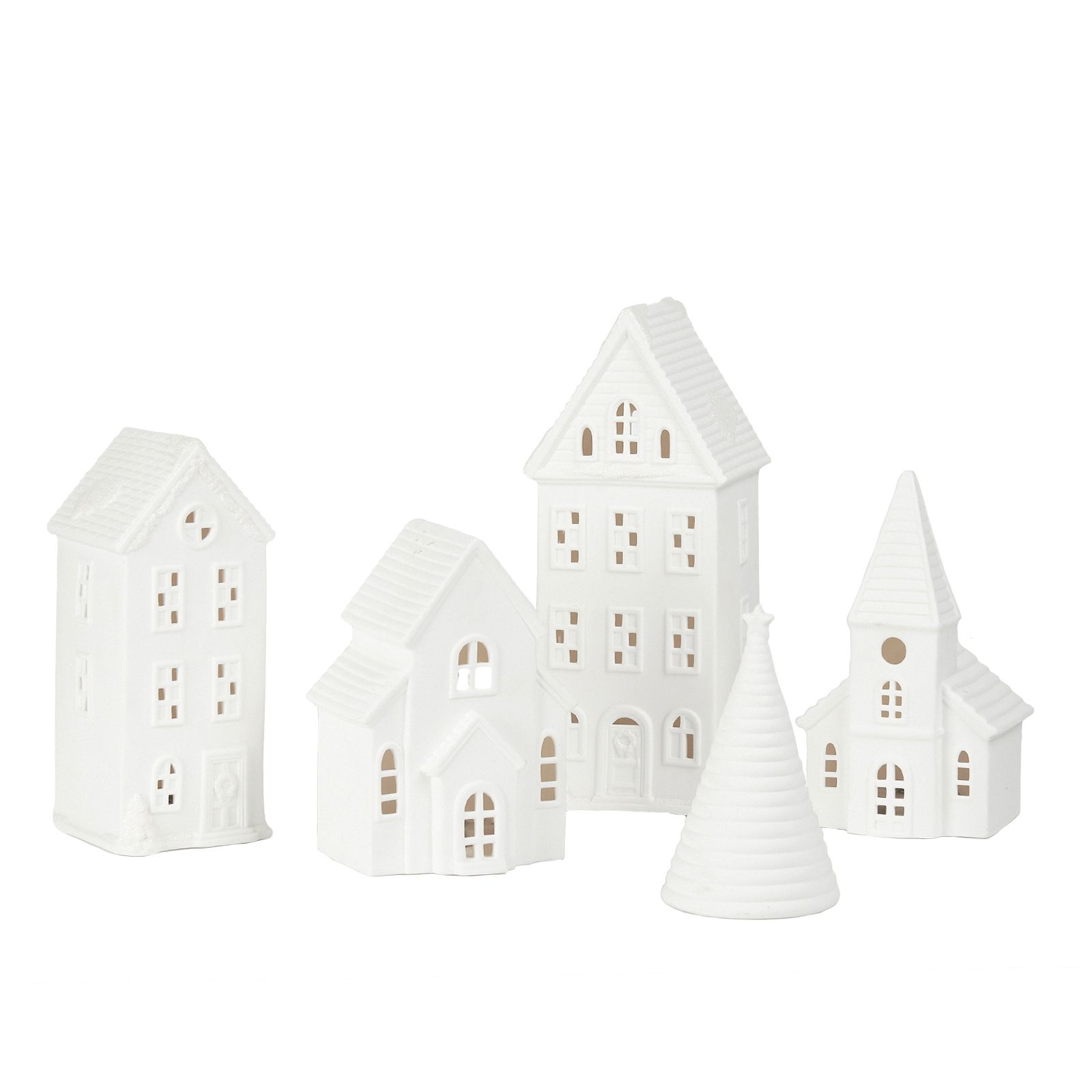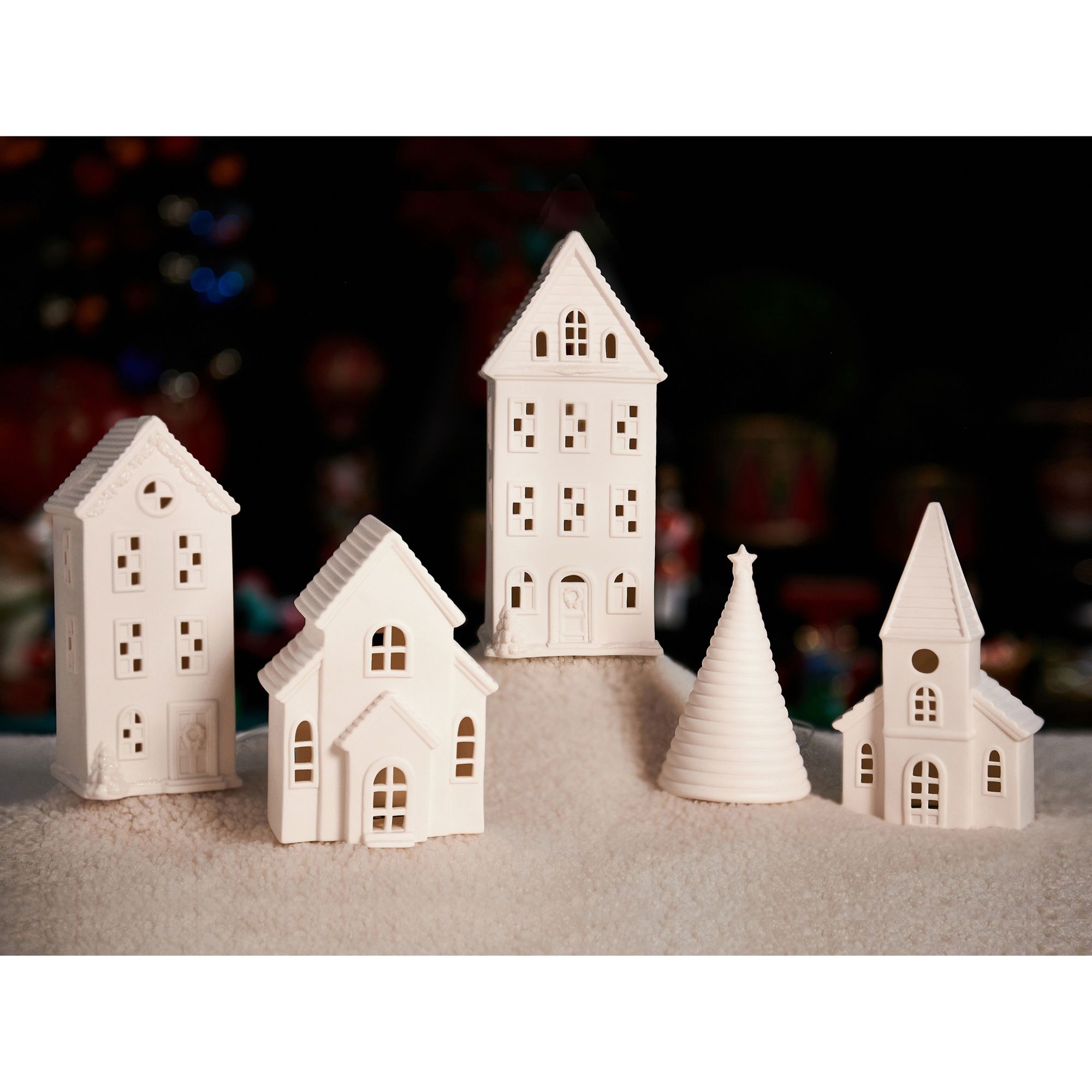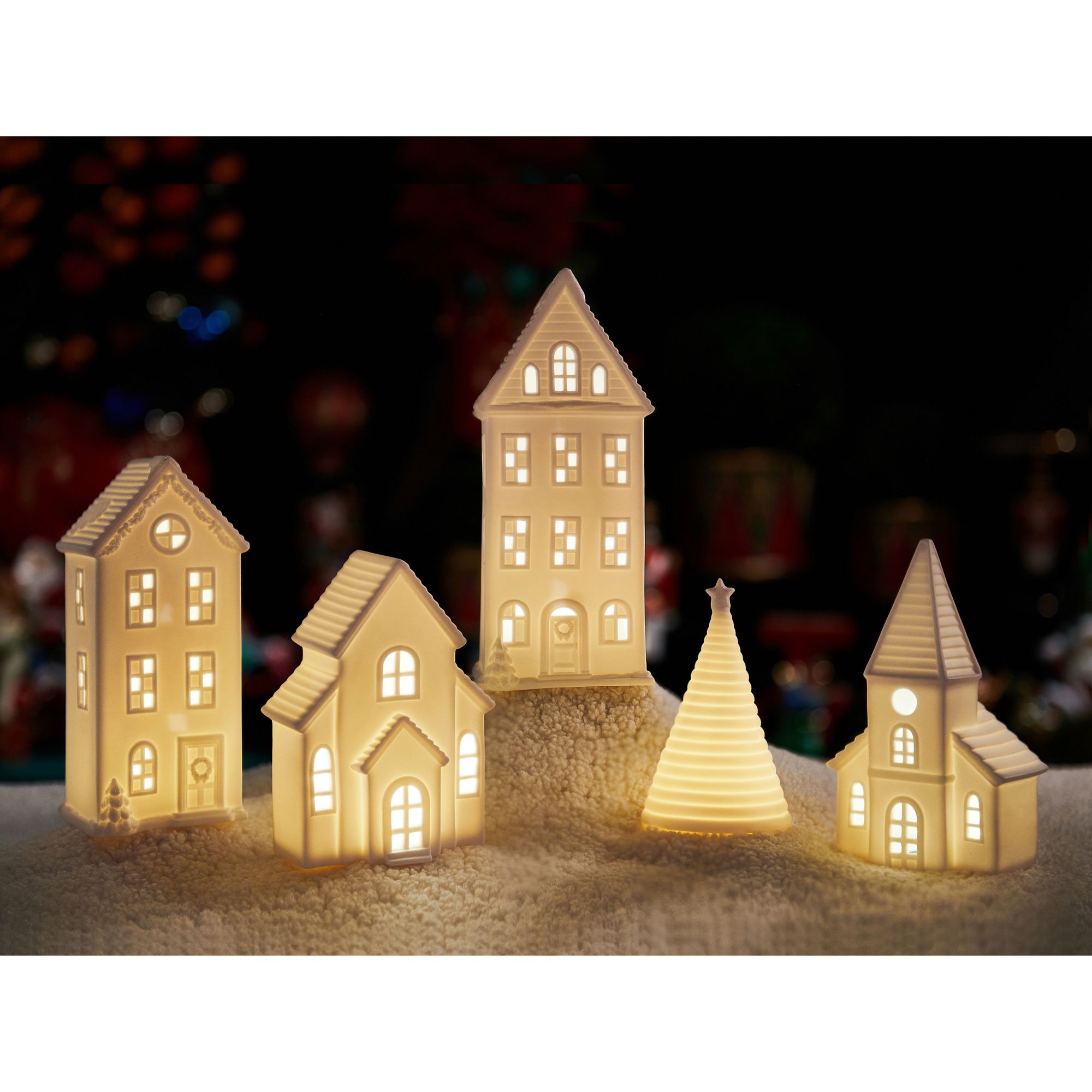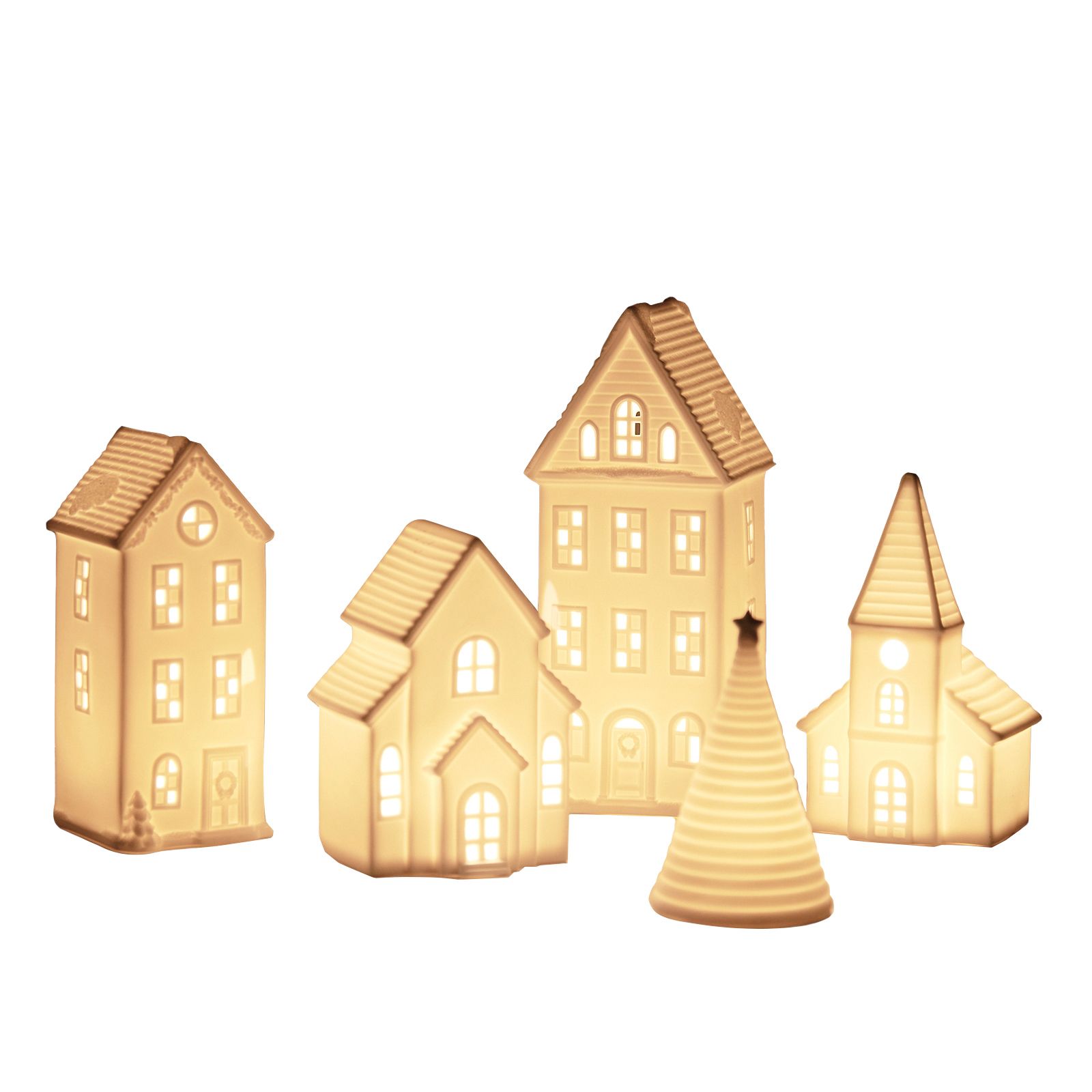 Includes four ceramic Christmas houses and a Christmas tree with LED