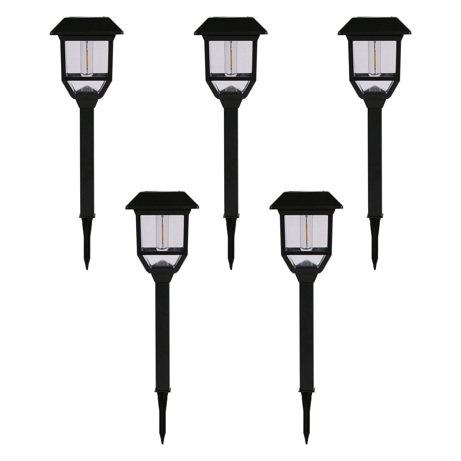 - Includes five solar top hats, five glass lenses, five filament LED bulbs, five posts, five ground stakes, five Ni-MH rechargeable batteries, instruction manual