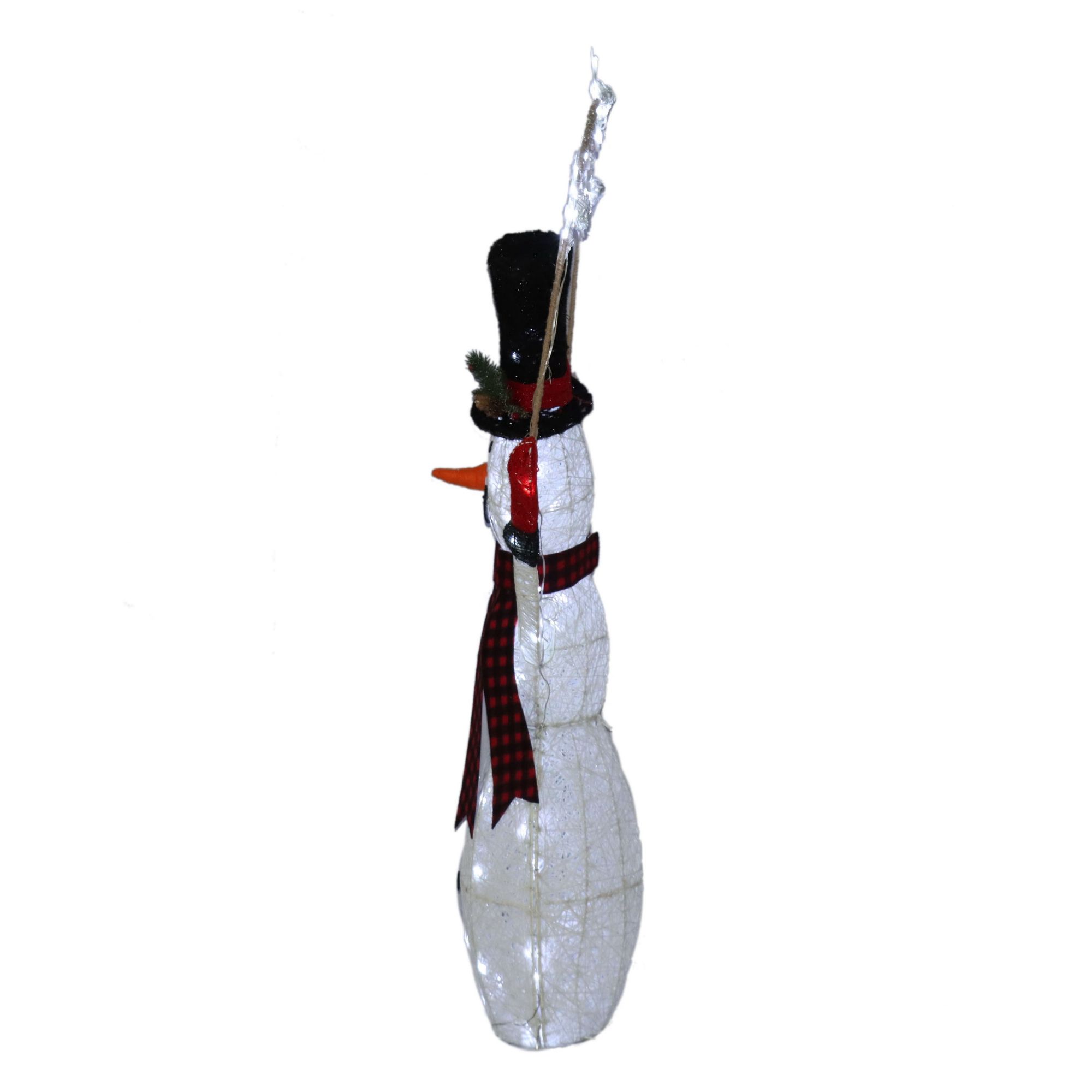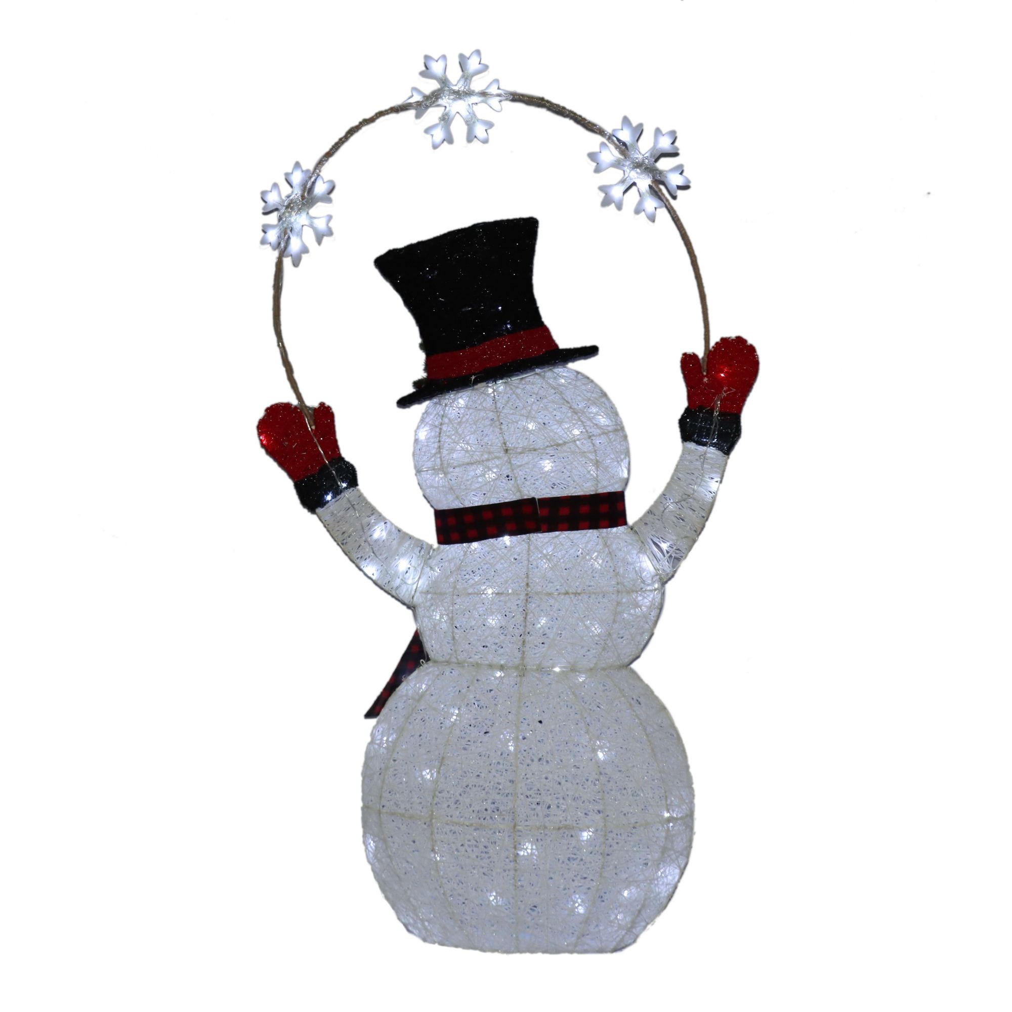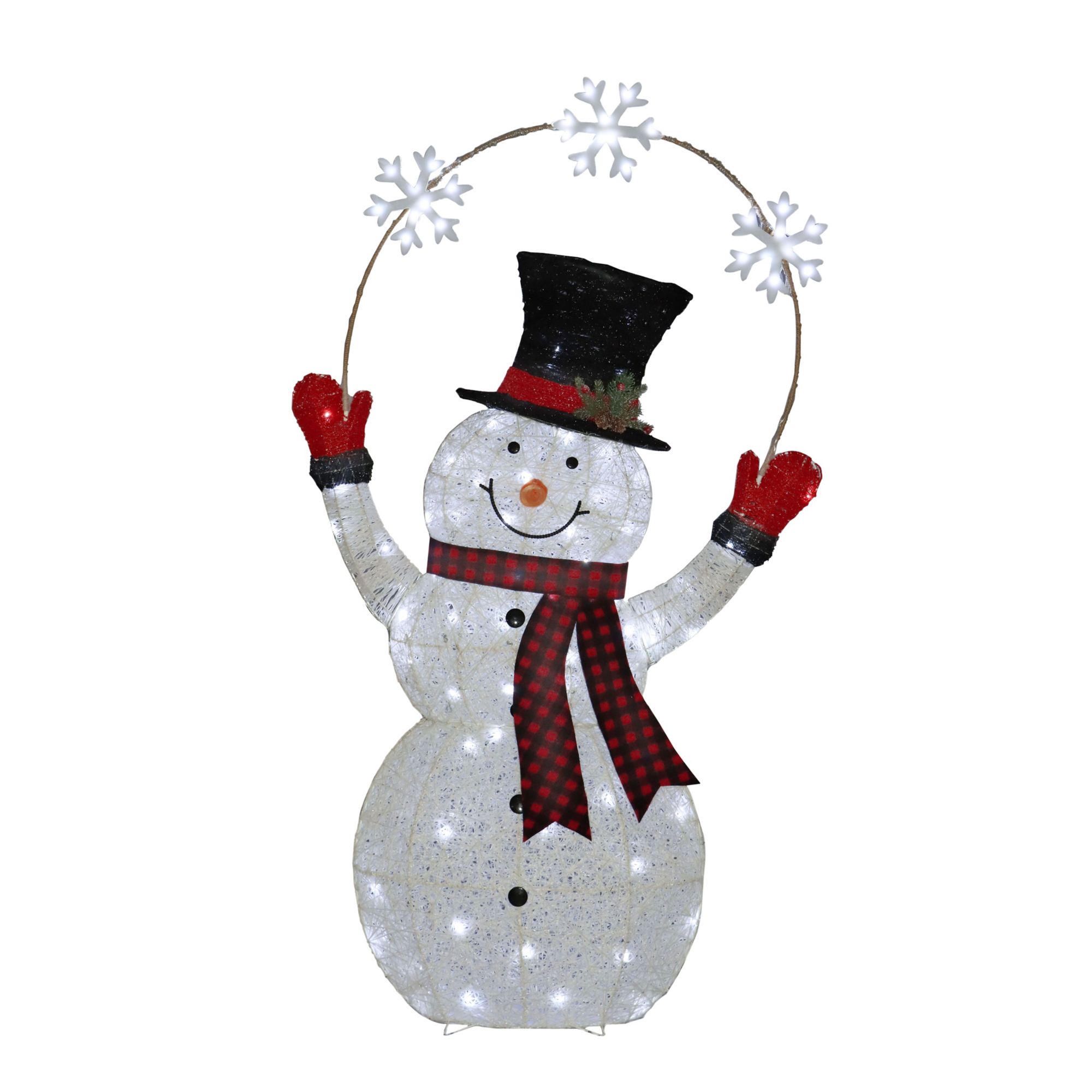 57" pre-lit snowman, for indoor or outdoor use Pre-lit with 100 cool white LED lights UL listed outdoor adaptor with 5' cord Includes 6-hours on / 18 hours timer with easy assembly Safe low voltage transformer for indoor or outdoor use Ideal for the house, porch or garden as part of your Christmas display 31.5"L x 11"W x 57"H to snowflake (approximate) Includes 57" pre-lit snowman, 100 cool white LED lights, and UL listed outdoor adaptor with 5' cord
