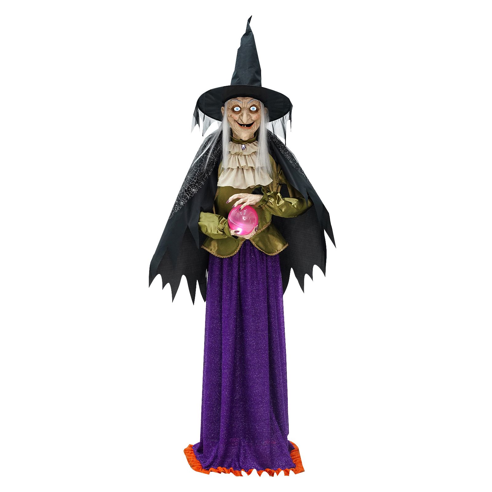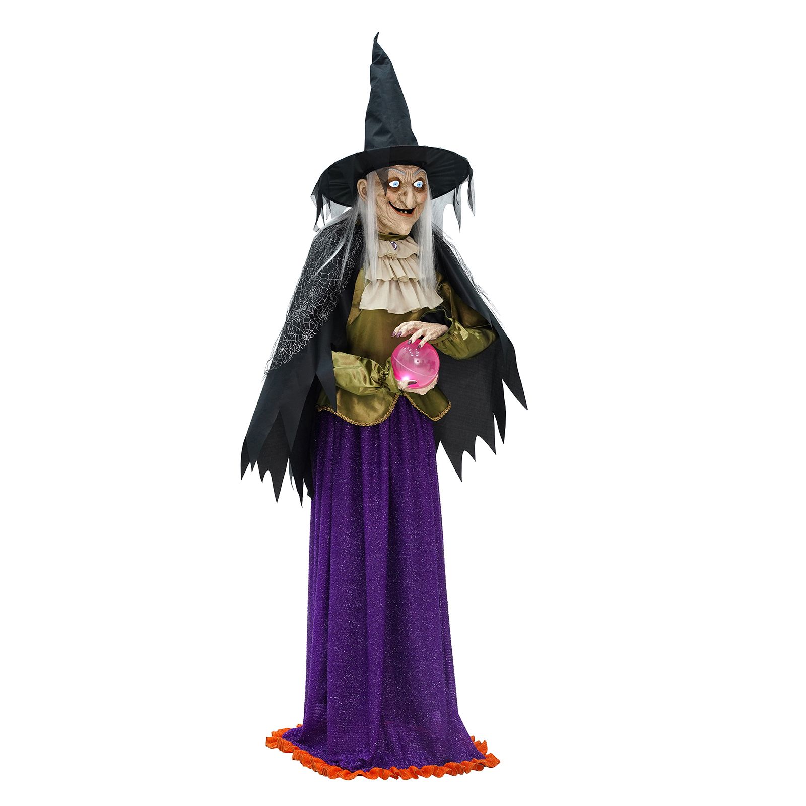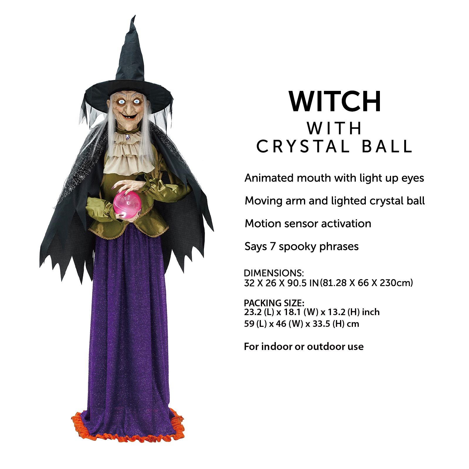 Our Curious Witch will be a great addition to your Spooky Halloween! Standing at 6' tall, with a bright colored and accented costume. She speaks seven bubbly phrases. With light-up eyes and a moving mouth, with arms that sway and hover over her Crystal Orb. She has three function settings- ON, which continually operates until the setting is changed, OFF/TRY ME, turns off the items but a try me step pad, can be use which will operate the function for one activity cycle for each trigger of the try me pad, and lastly is the SENSOR mode, our Curios Witch is equipped with a motion/IR sensor that will operate the function for one activity cycle each time the sensor is triggered.