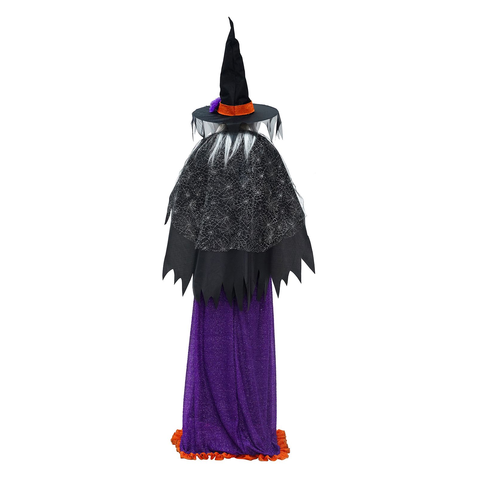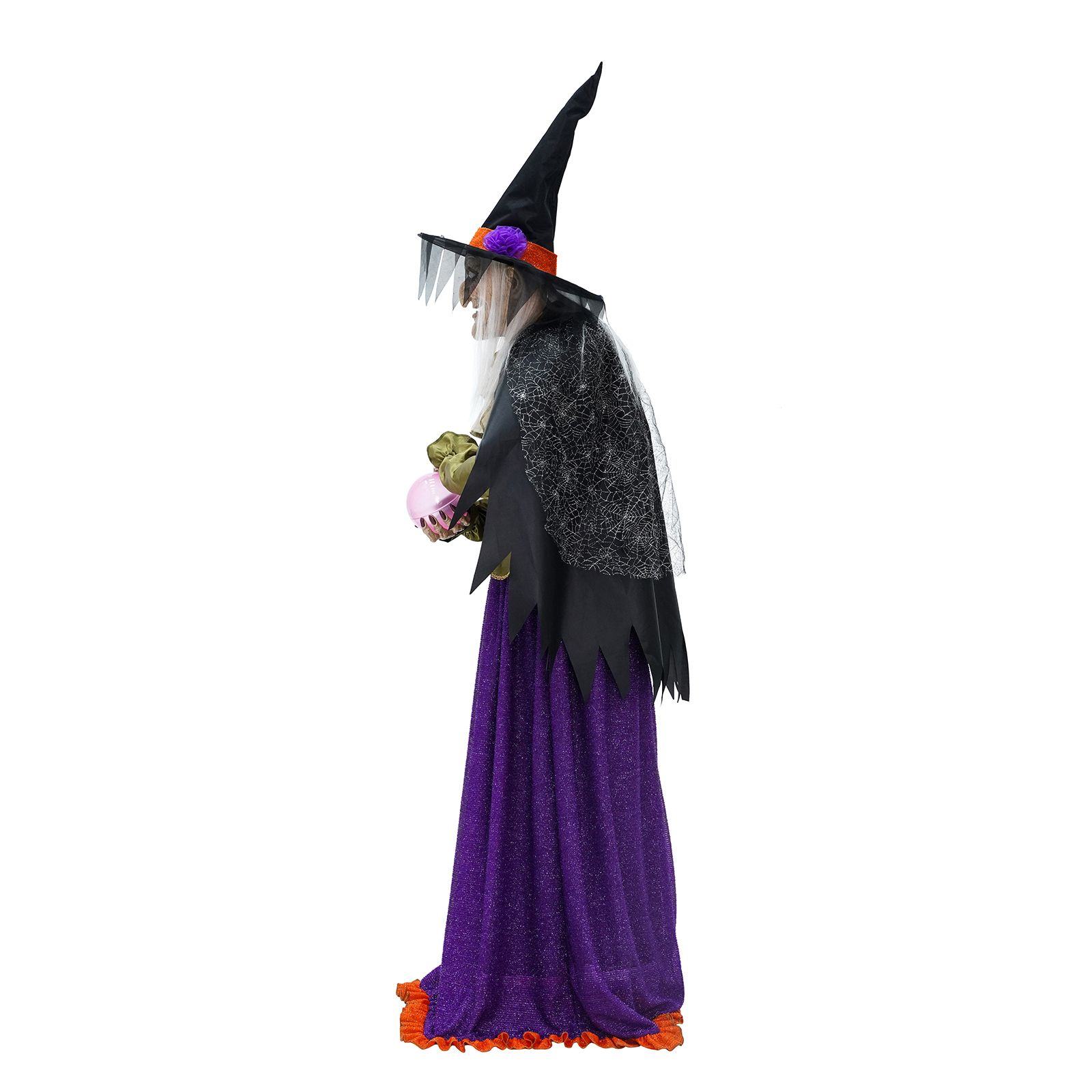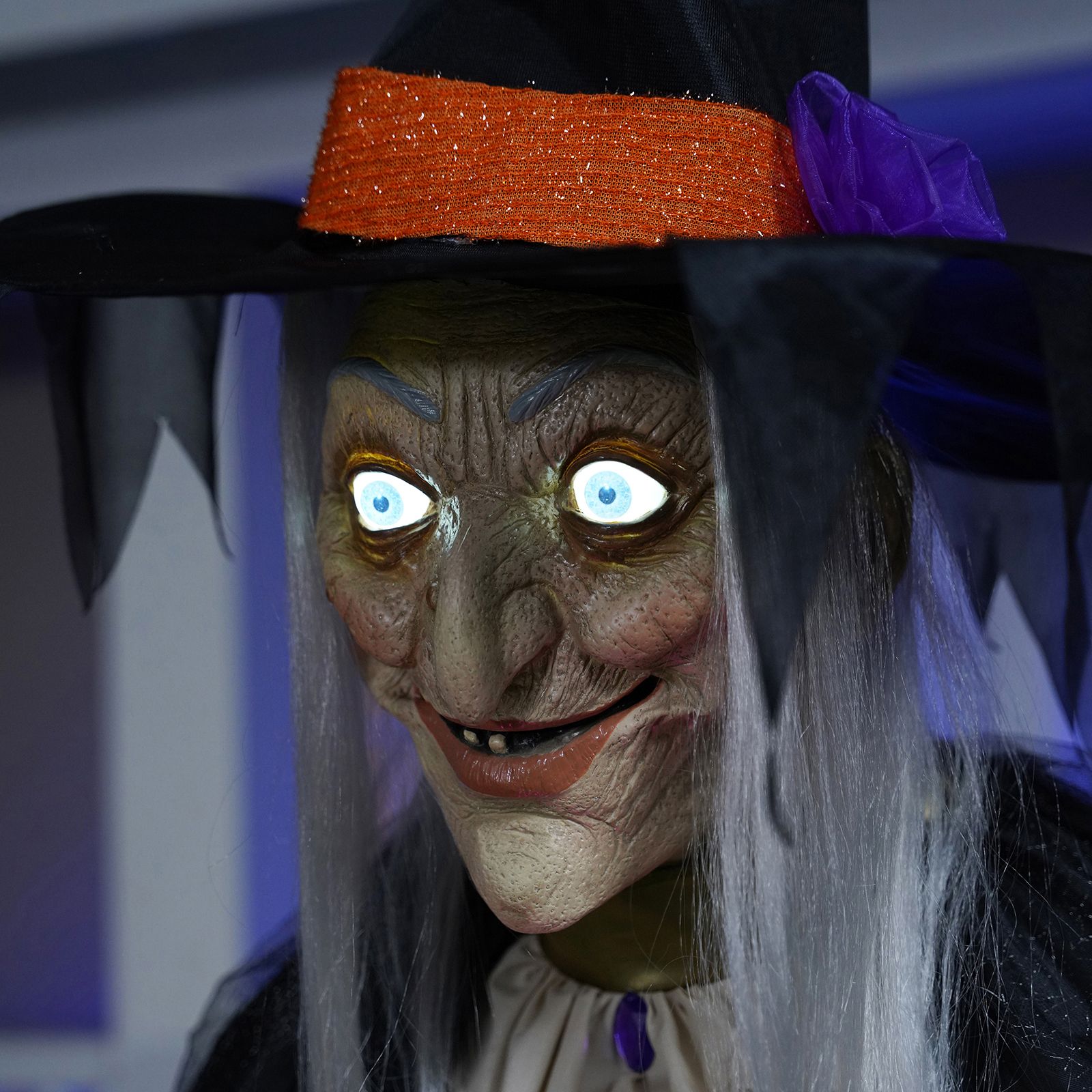 Our Curious Witch will be a great addition to your Spooky Halloween! Standing at 6' tall, with a bright colored and accented costume. She speaks seven bubbly phrases. With light-up eyes and a moving mouth, with arms that sway and hover over her Crystal Orb. She has three function settings- ON, which continually operates until the setting is changed, OFF/TRY ME, turns off the items but a try me step pad, can be use which will operate the function for one activity cycle for each trigger of the try me pad, and lastly is the SENSOR mode, our Curios Witch is equipped with a motion/IR sensor that will operate the function for one activity cycle each time the sensor is triggered.
