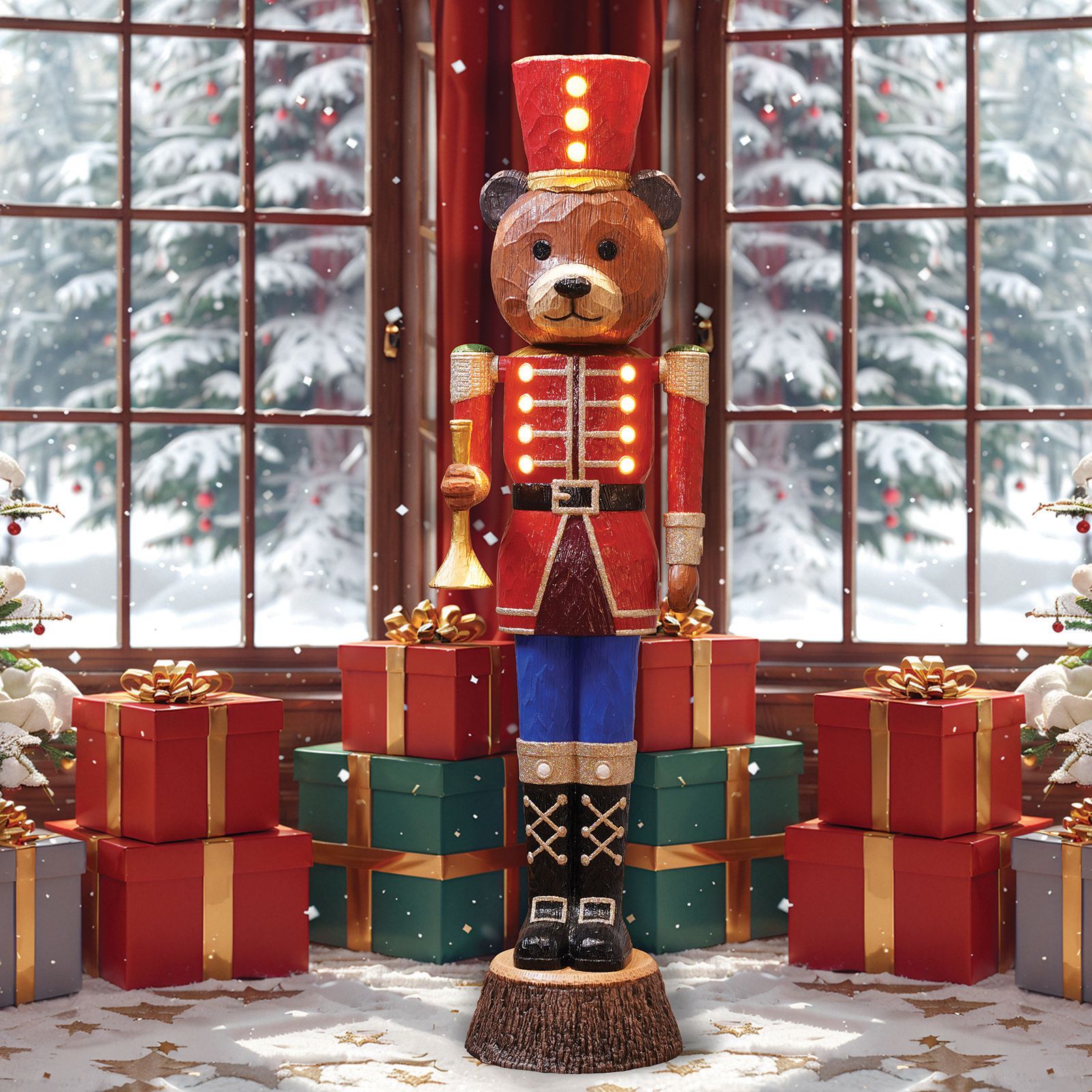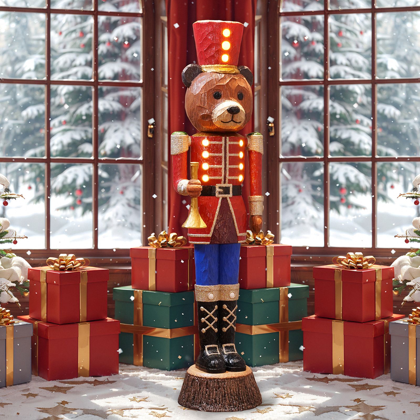 A twist on the classic nutcracker, this adorable bear is standing to attention, ready to guard the presents from curious eyes. Standing at an impressive 72" tall, featured with lights, chiseled-wood details and accents of glitters, this bear is looking smart in his red and gold uniform, with his hat perfectly placed upon his head.