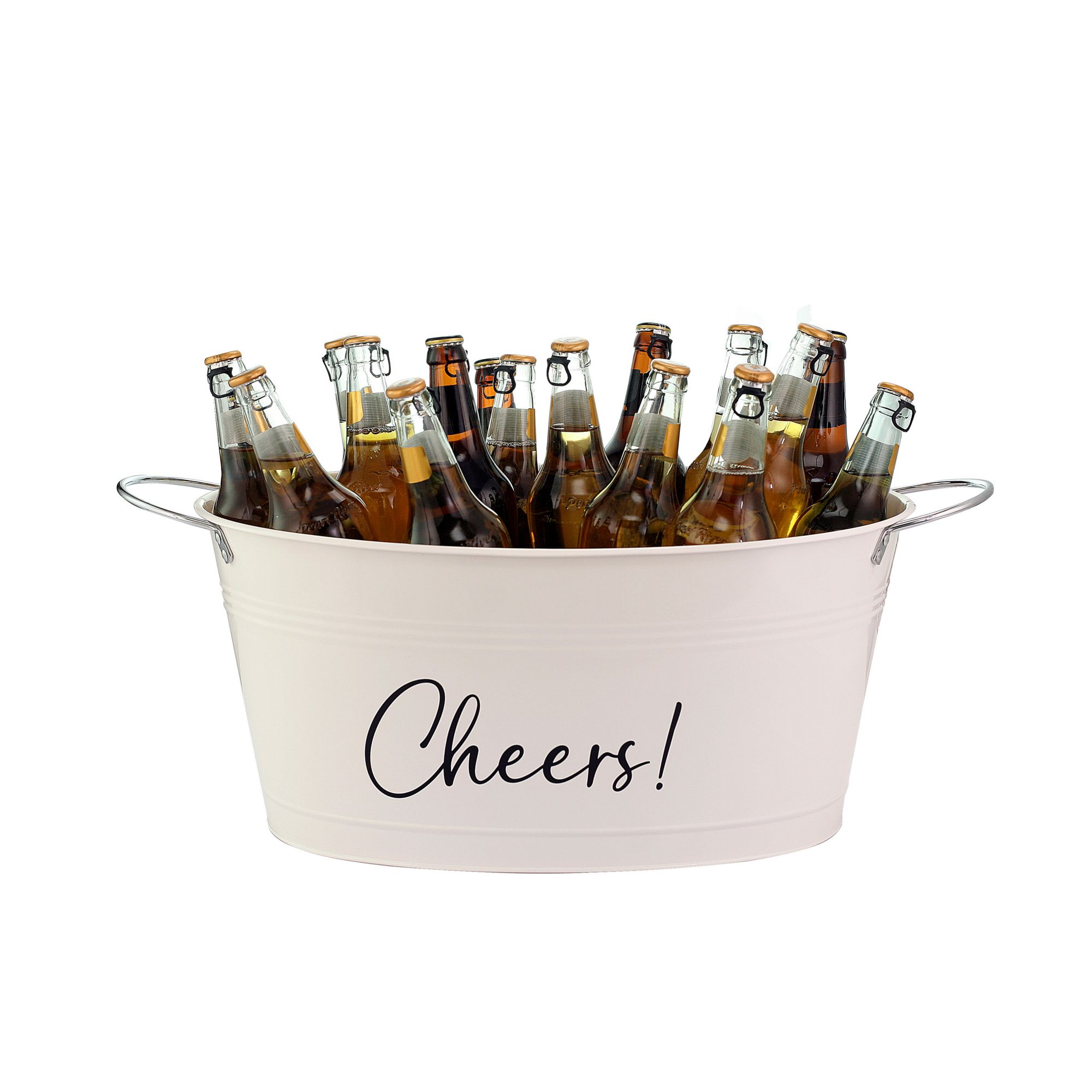This large galvanized heavy-duty metal beverage tub keeps all of your favorite beverages chilled with ice. A unique farmhouse look with the word “CHEERS" on the front fits in beautifully on your countertop or a backyard BBQ patio party. Chrome-plated sturdy handles allow for easy transportation. Perfect for parties and any indoor and outdoor activities.