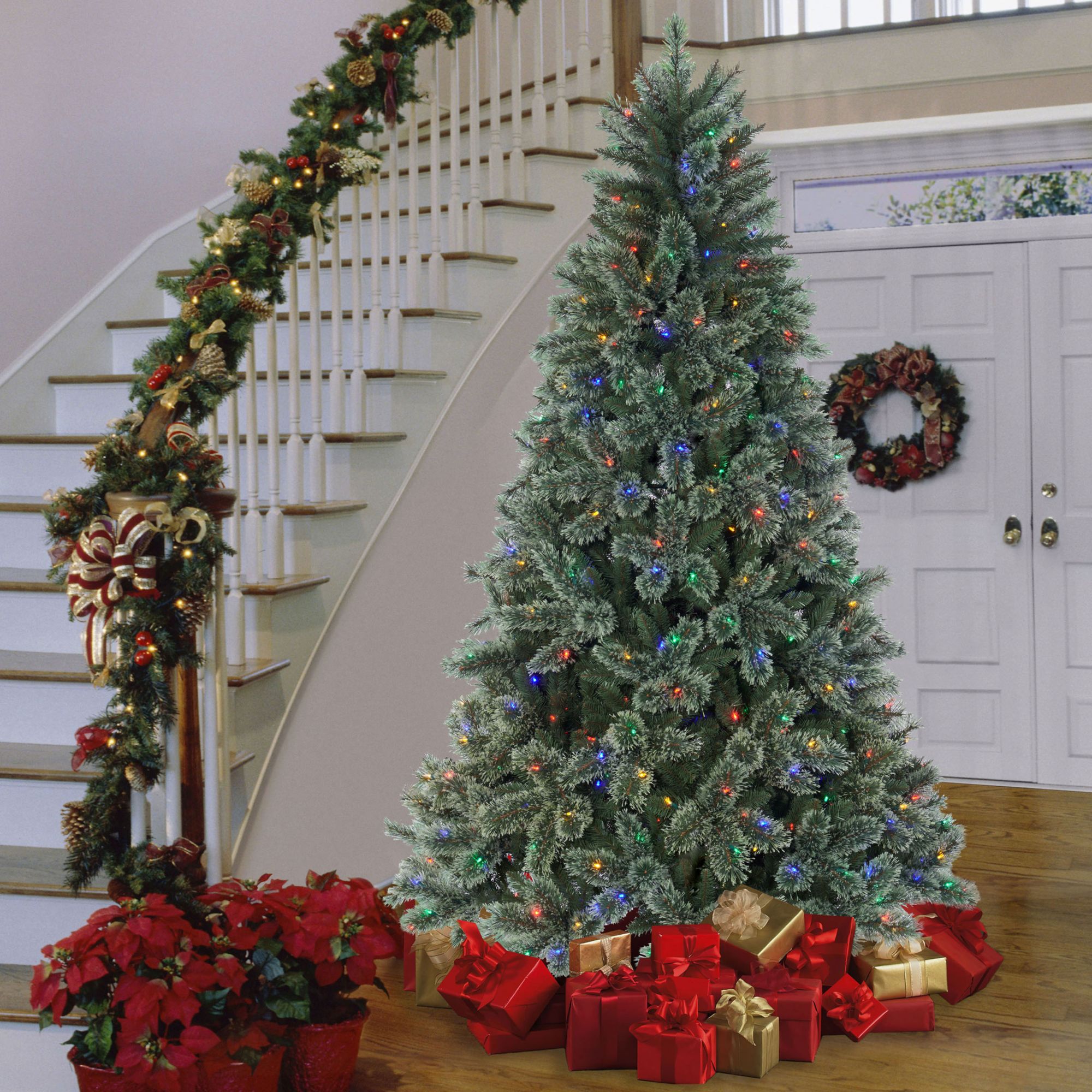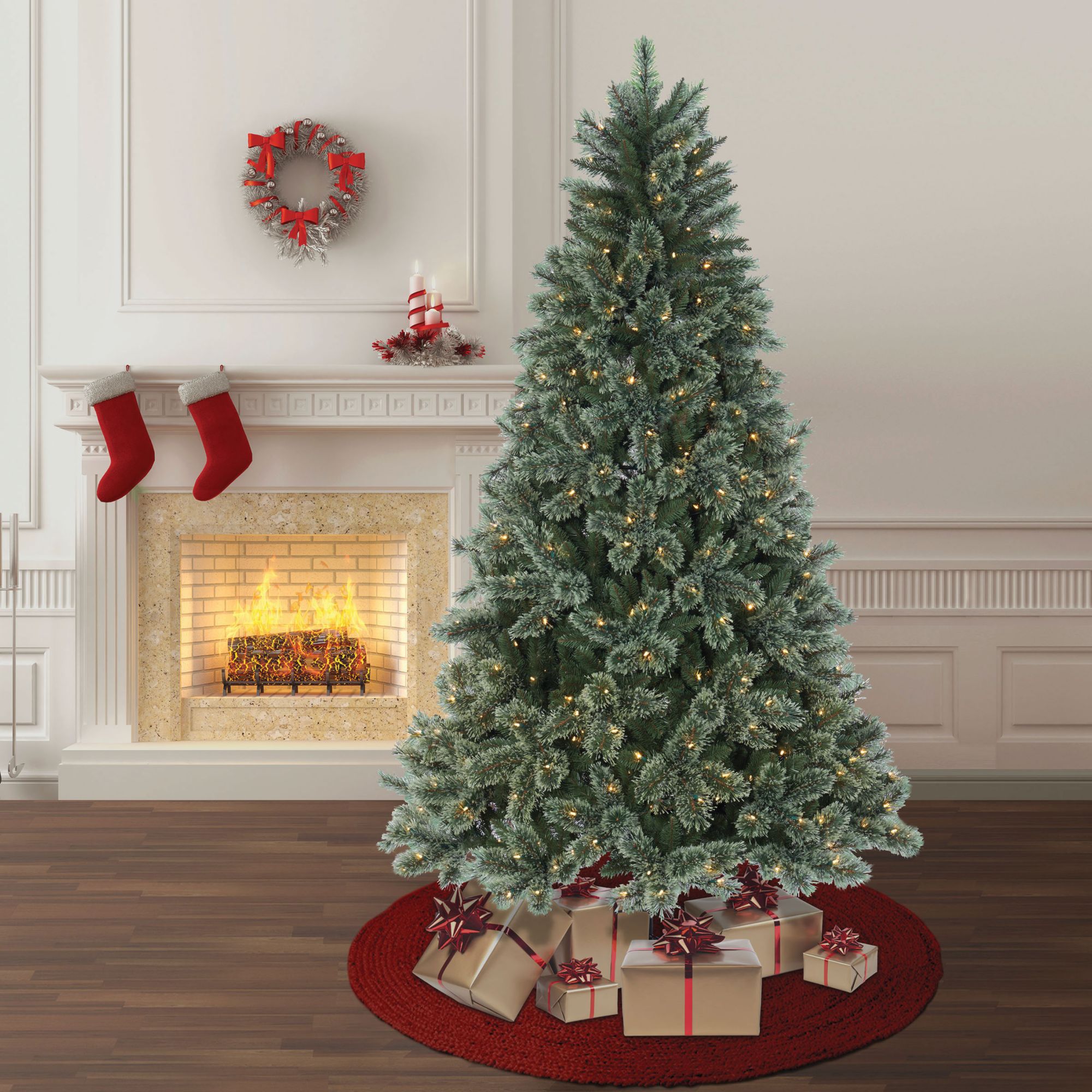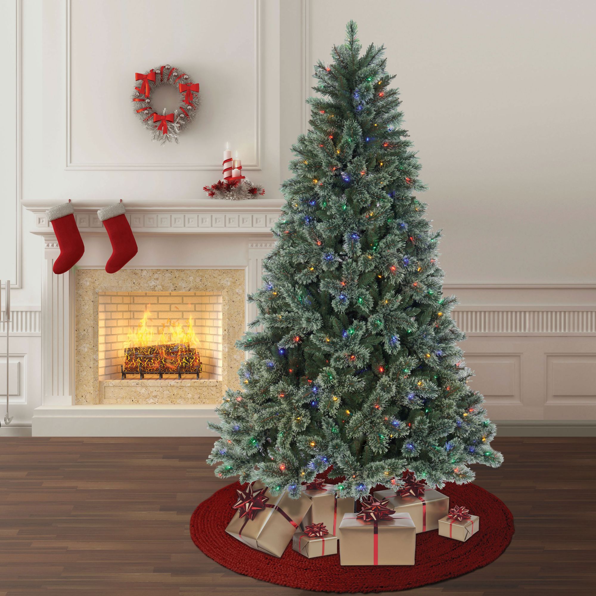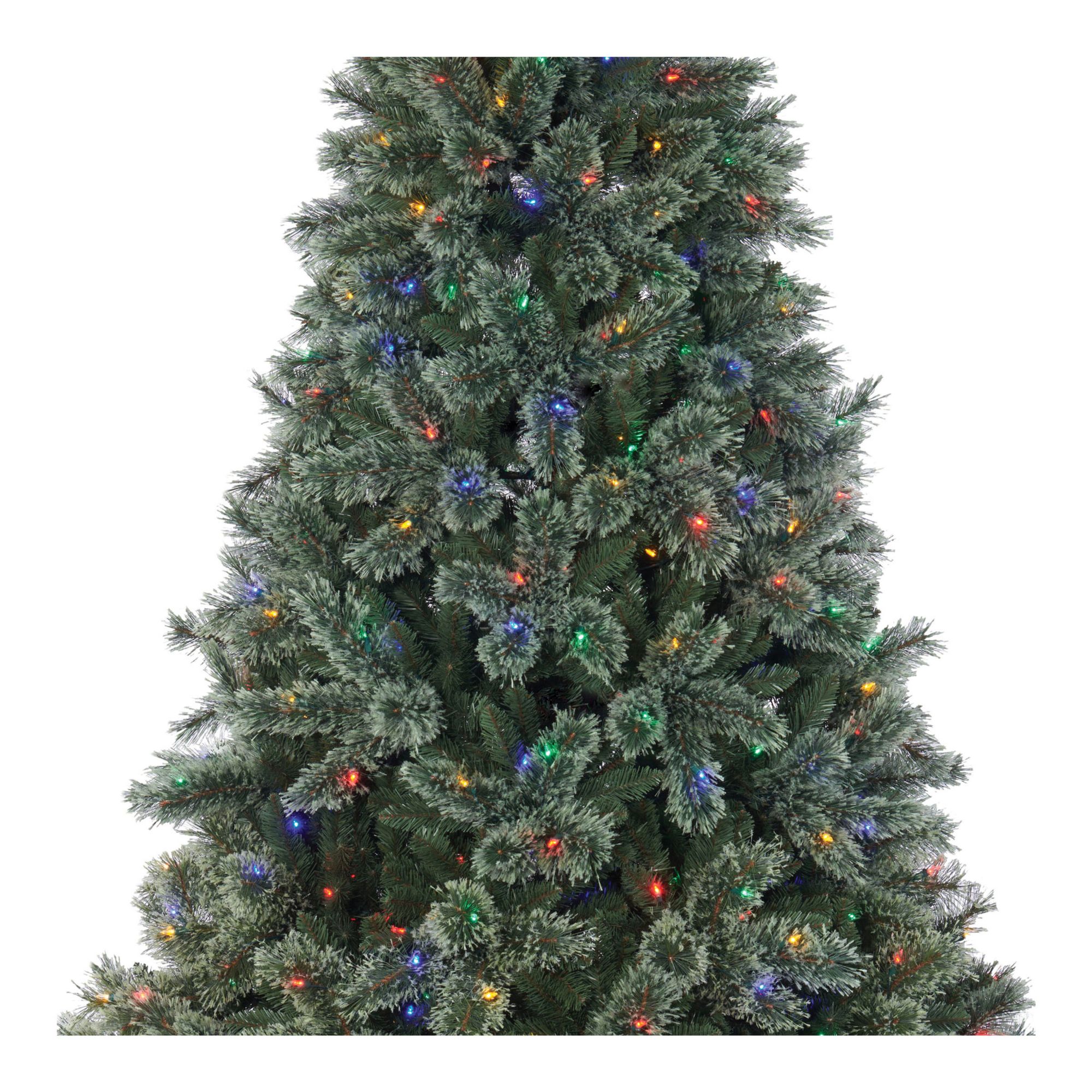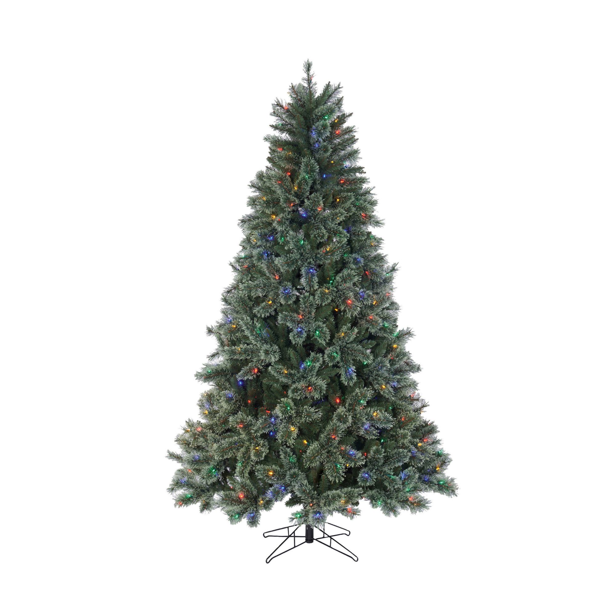 Berkley Jensen 7.5' Rochester LED cashmere tree creates beautiful sights in your holiday home. This luxurious artificial Christmas tree features 1,266 branch tips, 500 hassle-free pre-strung 8-function warm White/multicolor(R/Y/B/G) LED Sylvania lights, one-plug quick connect technology for easy setup, a convenient on/off foot pedal, and includes a metal tree stand. The tree's pre-lit innovative LED lights allow you to create and control eight different lighting functions. With its impressive green color and split-end needles to create a full and hearty finish, this tree perfectly captures the charm of a Cashmere Christmas tree. You will love how festive your interior space can become with this charming tree.