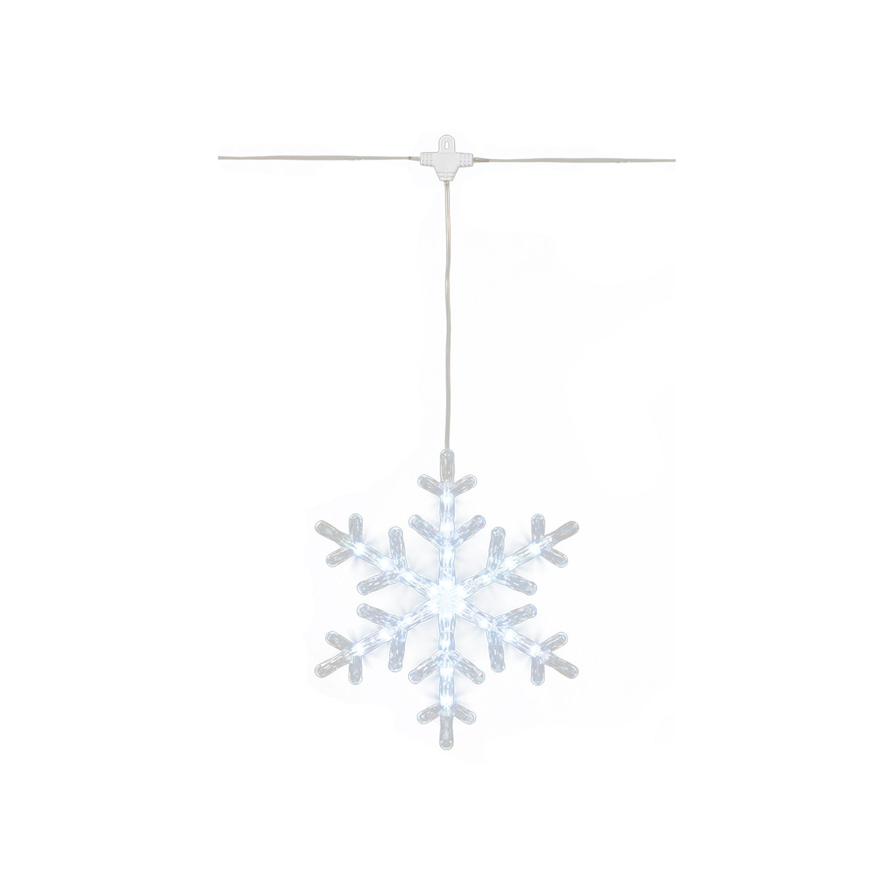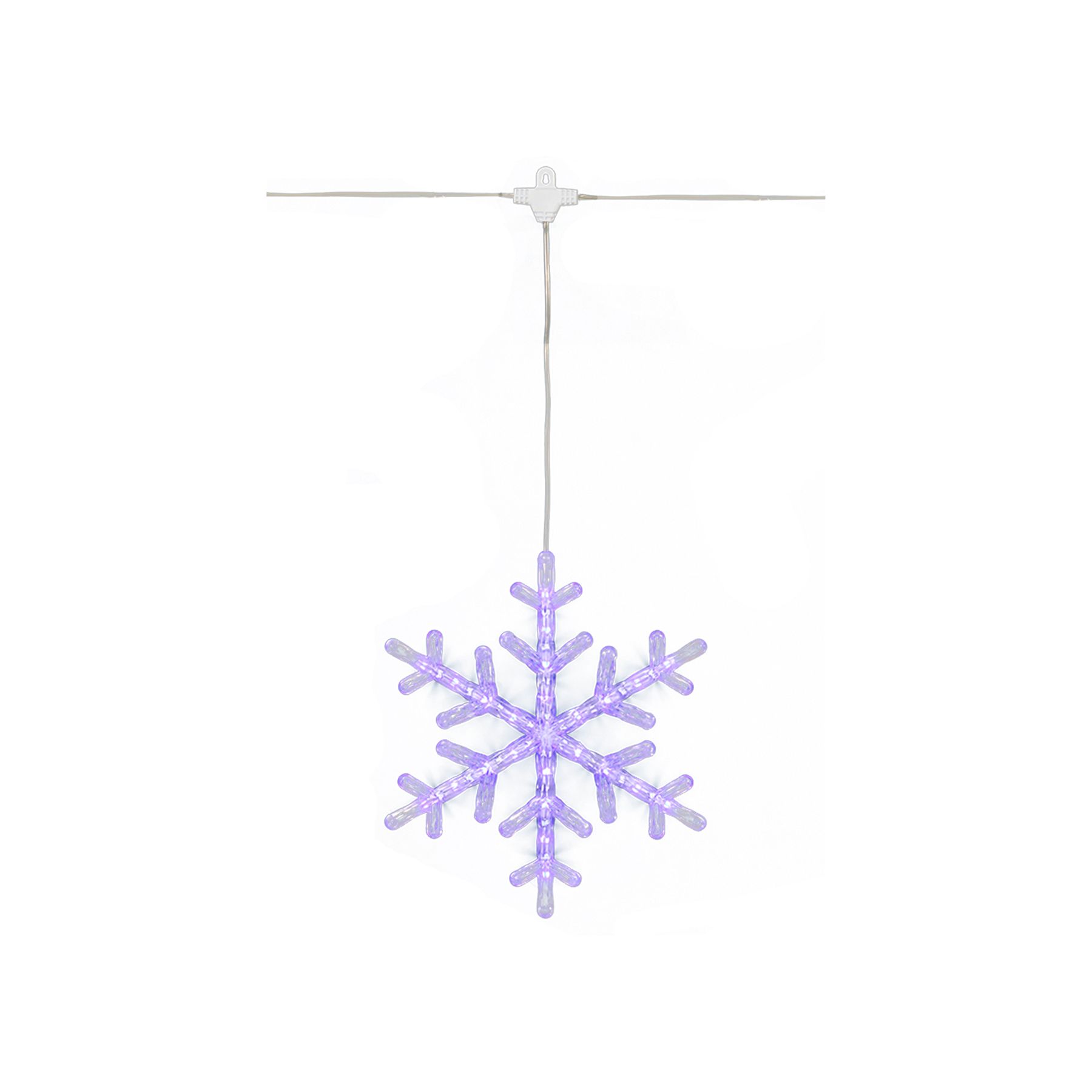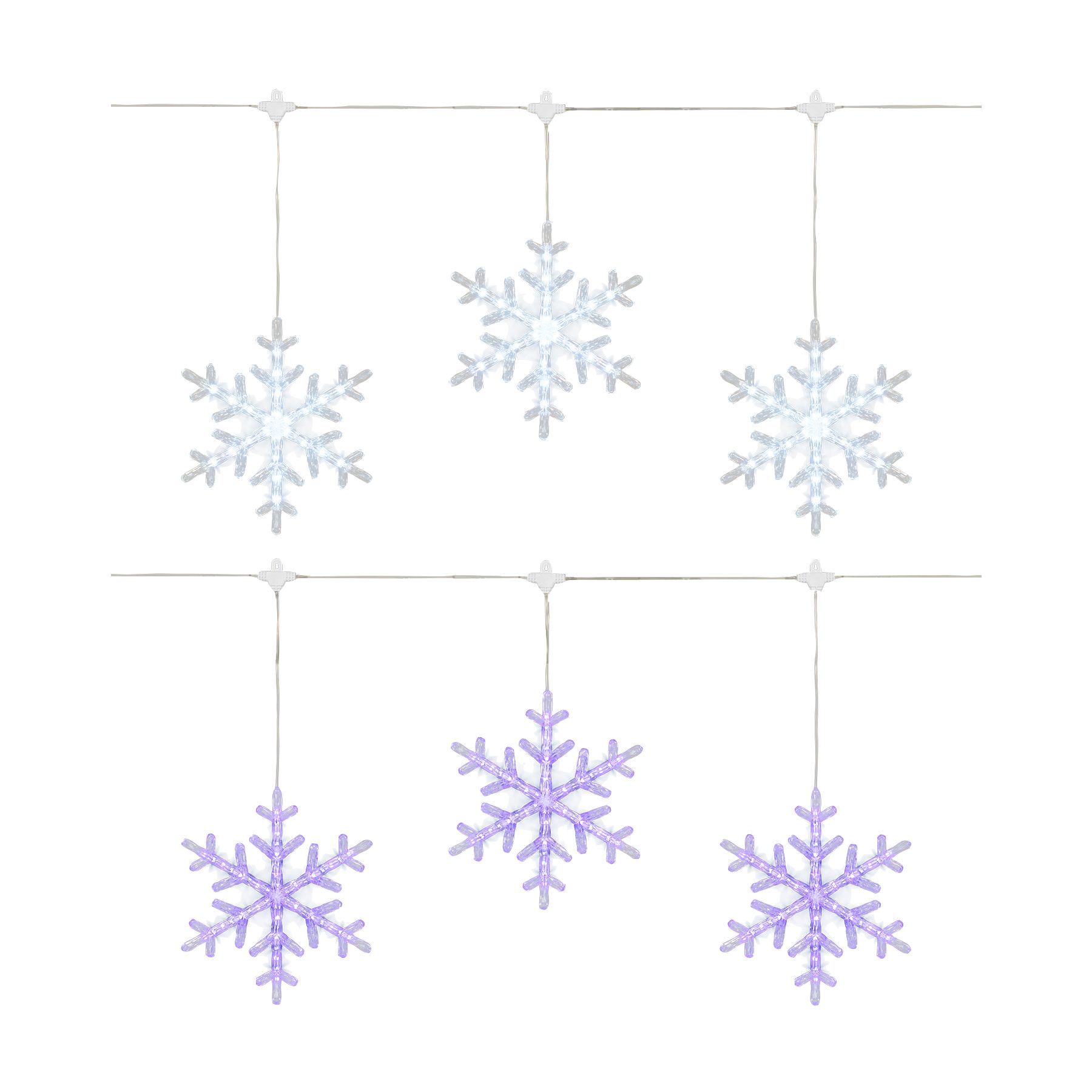 Introducing our stunning 9' Color Changing LED Snowflake Lights, designed to bring a magical touch to your indoor and outdoor spaces. These lights feature five dynamic functions with memory settings, allowing you to customize your display with ease. The UL-approved adaptor ensures safety and reliability, while the 5' transparent wire with 27" strand spacing allows for versatile installation. This item is perfect for holiday decorations, special events, or creating an enchanting atmosphere at home. These lights are a must-have for any occasion. Enhance your festive décor with our captivating LED snowflake lights and enjoy the brilliance they bring to any setting.