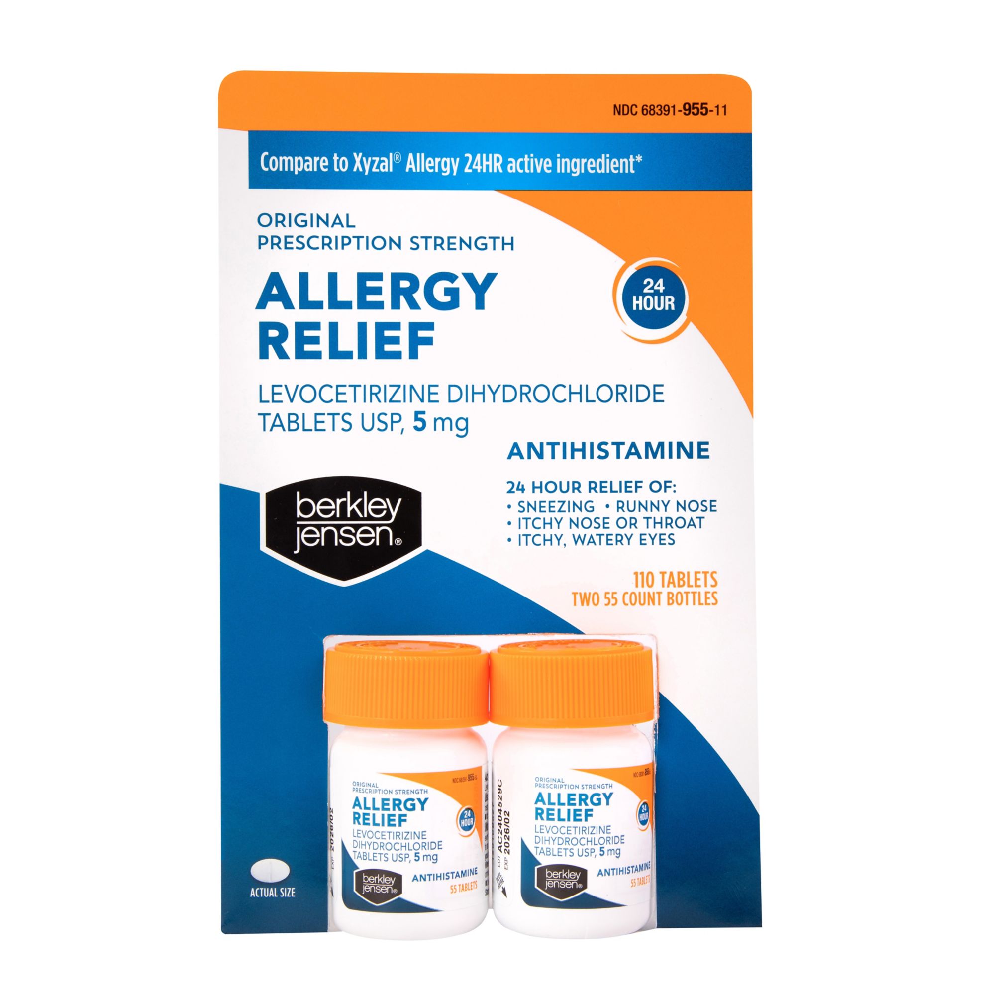 Berkley Jensen Allergy Relief Levocetirizine Dihydrochloride Tablets provide 24 hour relief of: sneezing, runny nose, itchy nose or throat, itchy, watery eyes. Compare to Xyzal Allergy 24HR active ingredient*.