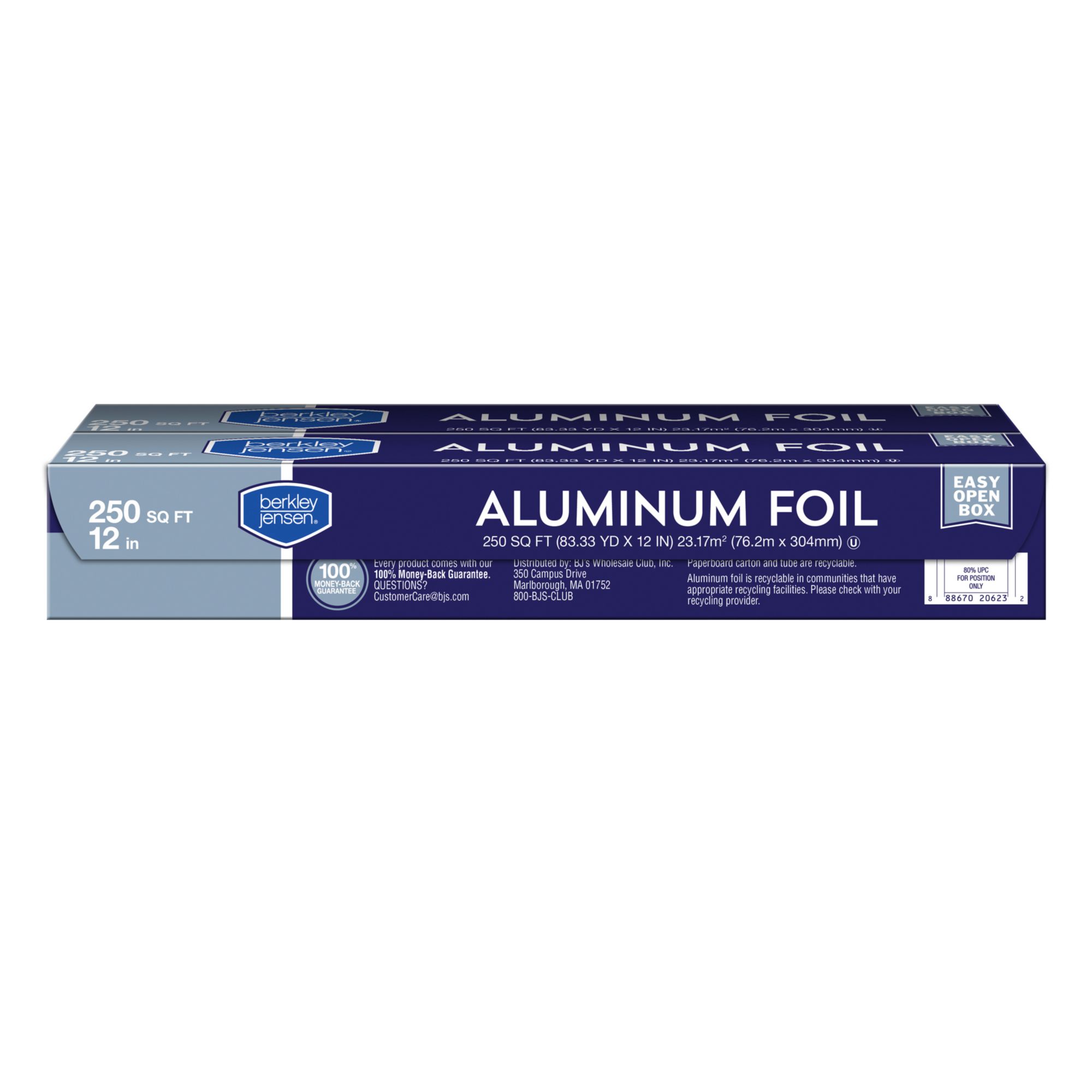 Keep your food fresh in both the fridge and the freezer with Berkley Jensen 250 sq. ft. aluminum foil. It can even be used to line pans before baking for easy cleanup or to cover dishes to prevent splatters. At the end of the day, this aluminum foil is recyclable for green usage.
