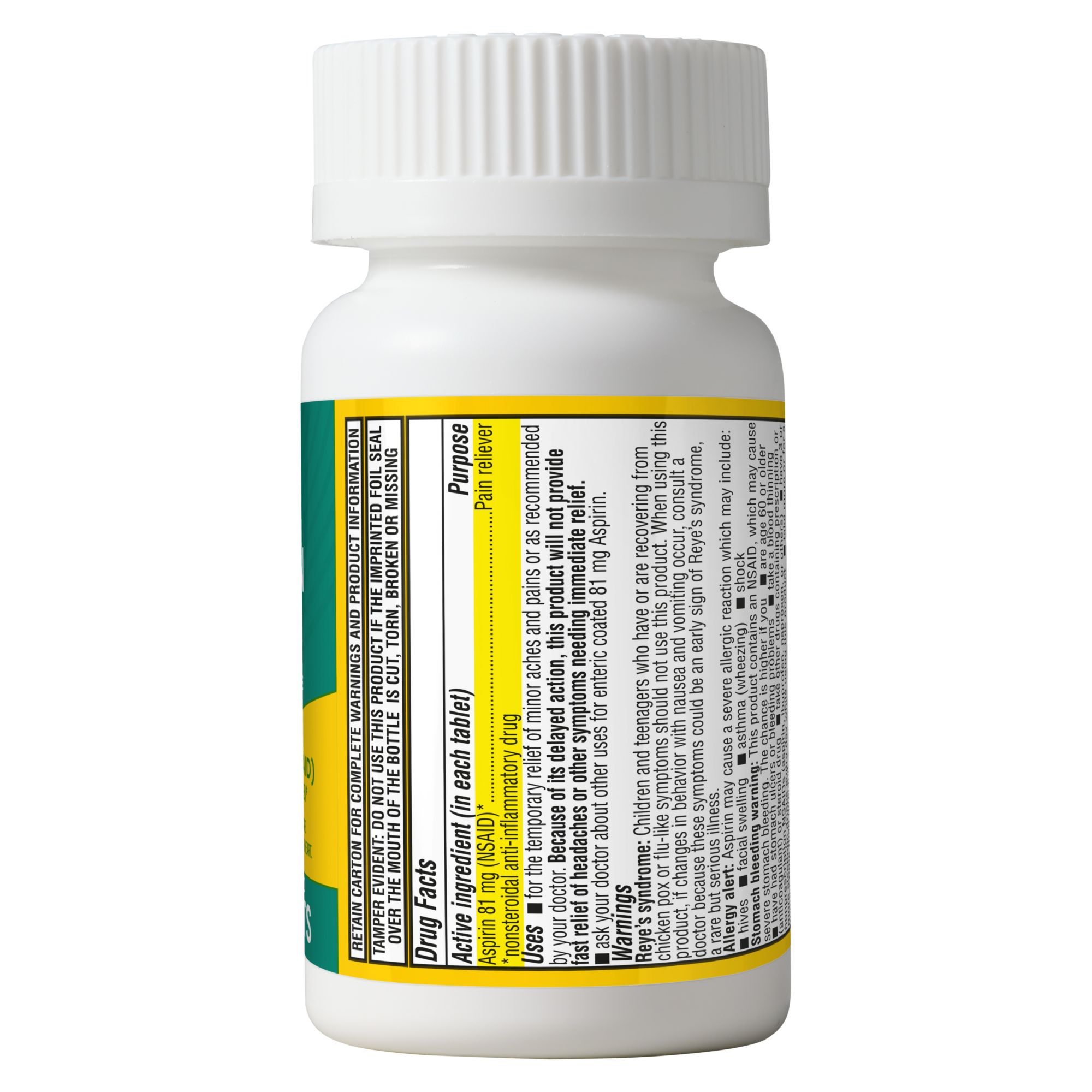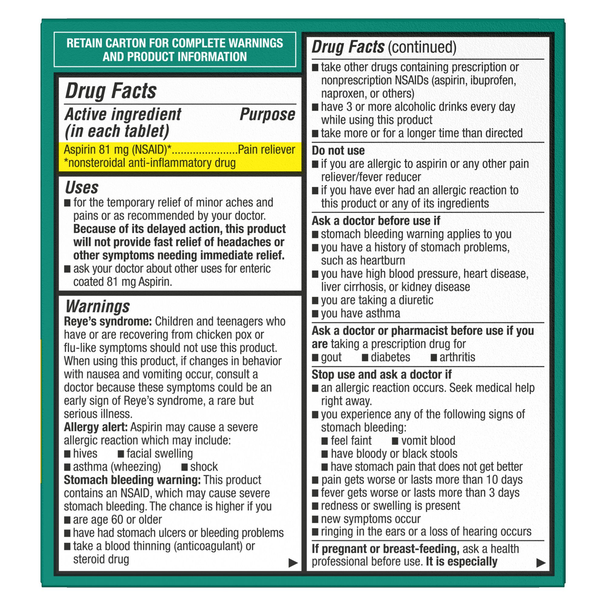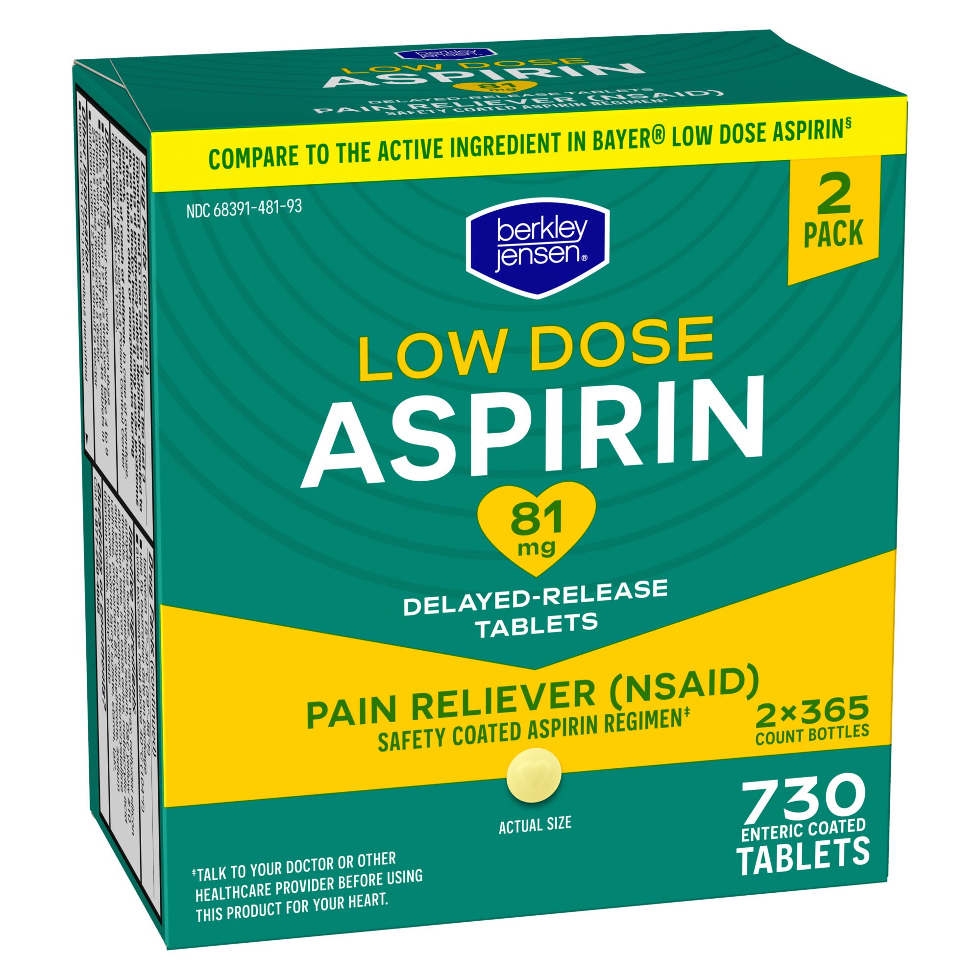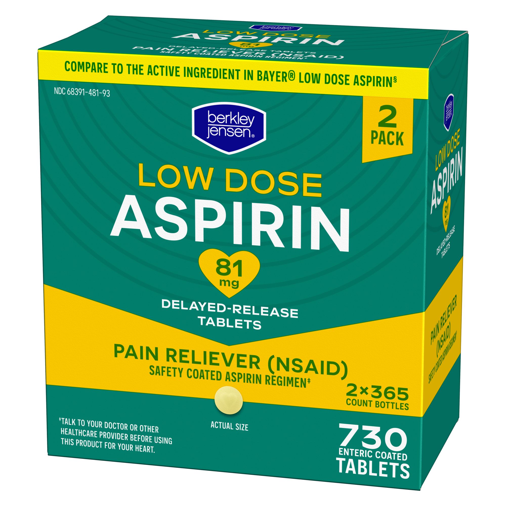 Berkley Jensen Aspirin 81mg Tablets are used for the temporary relief of minor aches and pains. These tablets contain the active ingredient Aspirin 81 mg, which compares to the active ingredient in Bayer Low Dose Aspirin. Safety-coated aspirin regimen. Two bottles of 365 tablets - a total of 730 tablets.