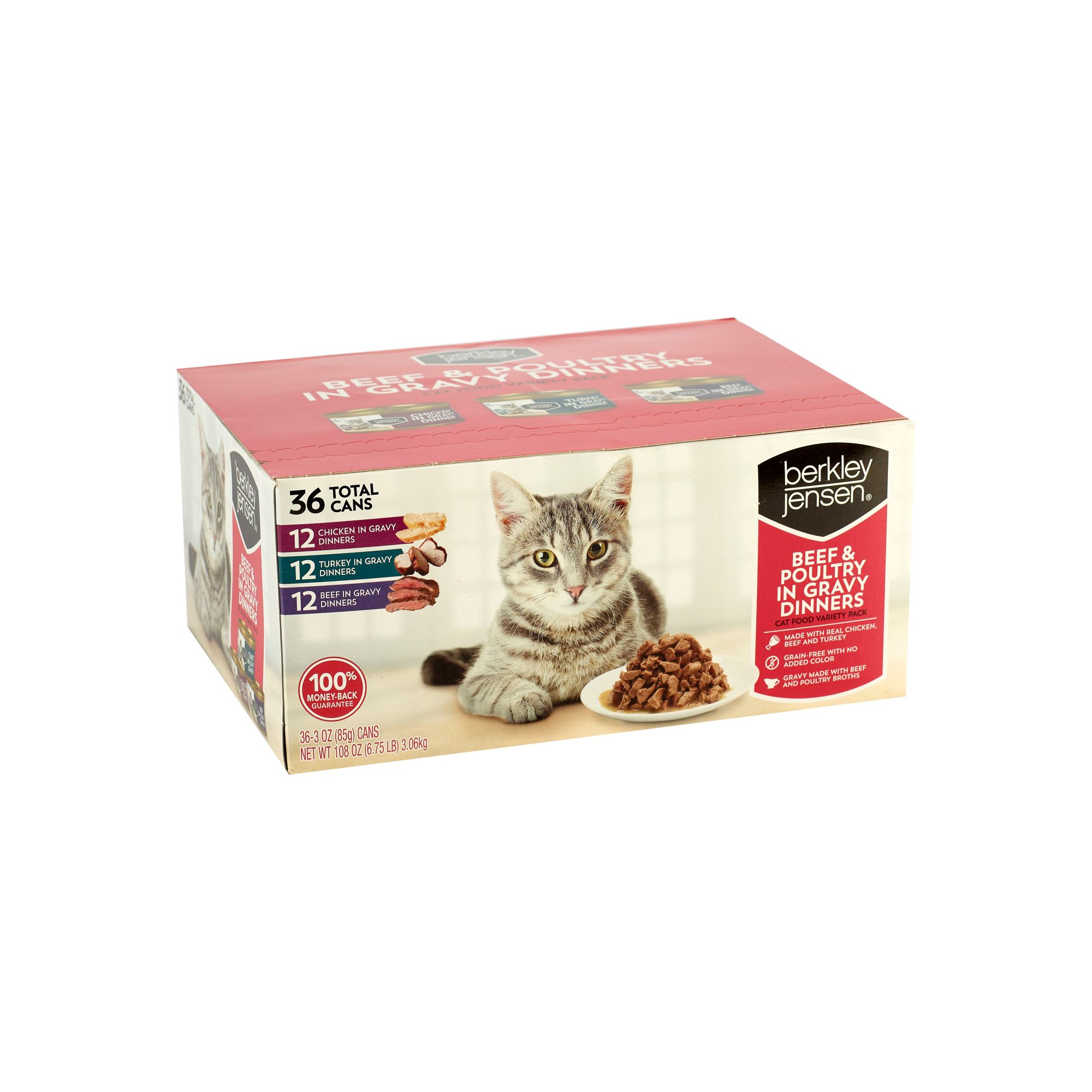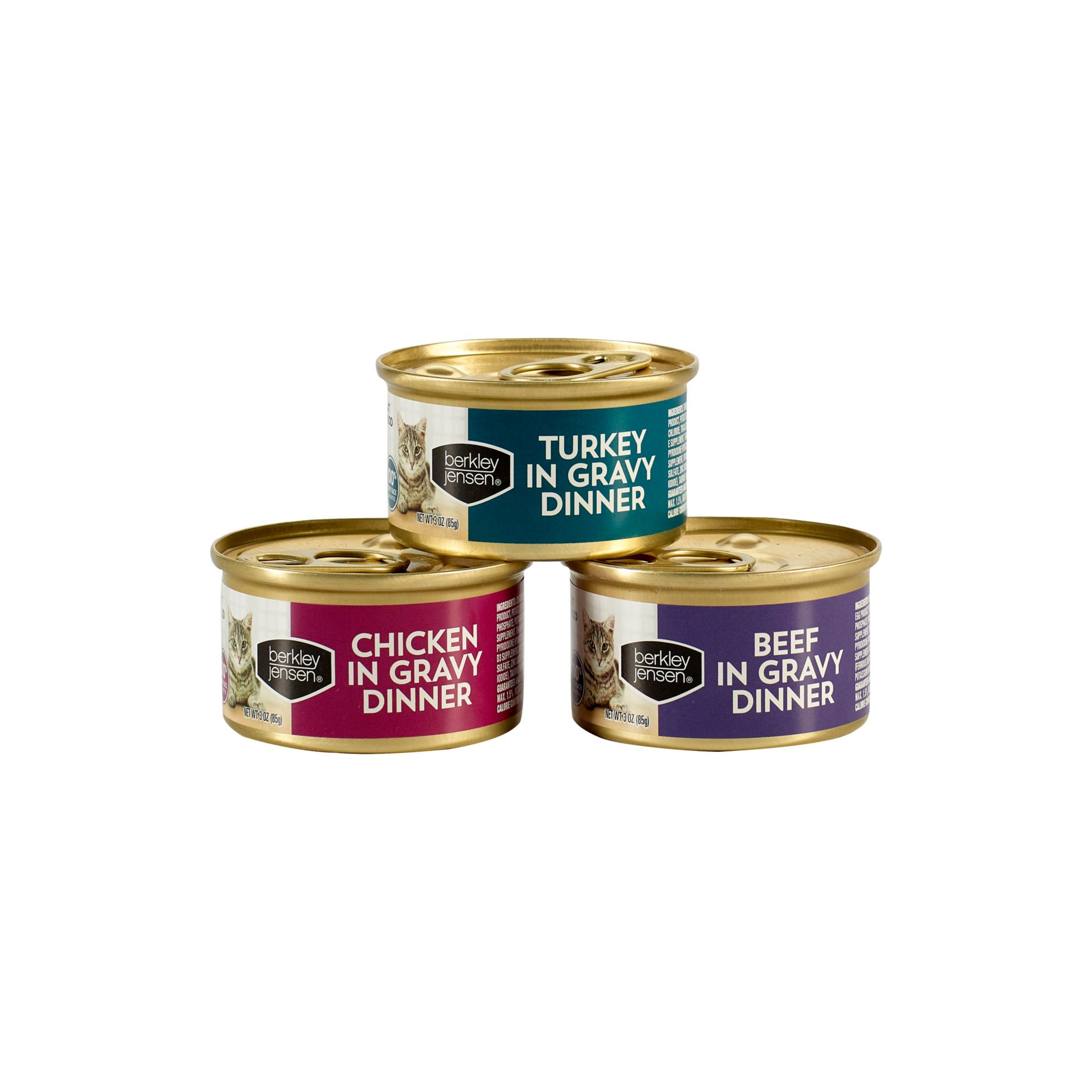 Your cat will appreciate the tasty nutrition of the Berkley Jensen Beef & Poultry in Gravy Dinners Variety Pack. Each recipe contains real chicken, turkey or beef to provide the key protein cats need to thrive. The cuts mixed with savory broth ensures each recipe has the fresh beef and poultry taste cats can't resist.