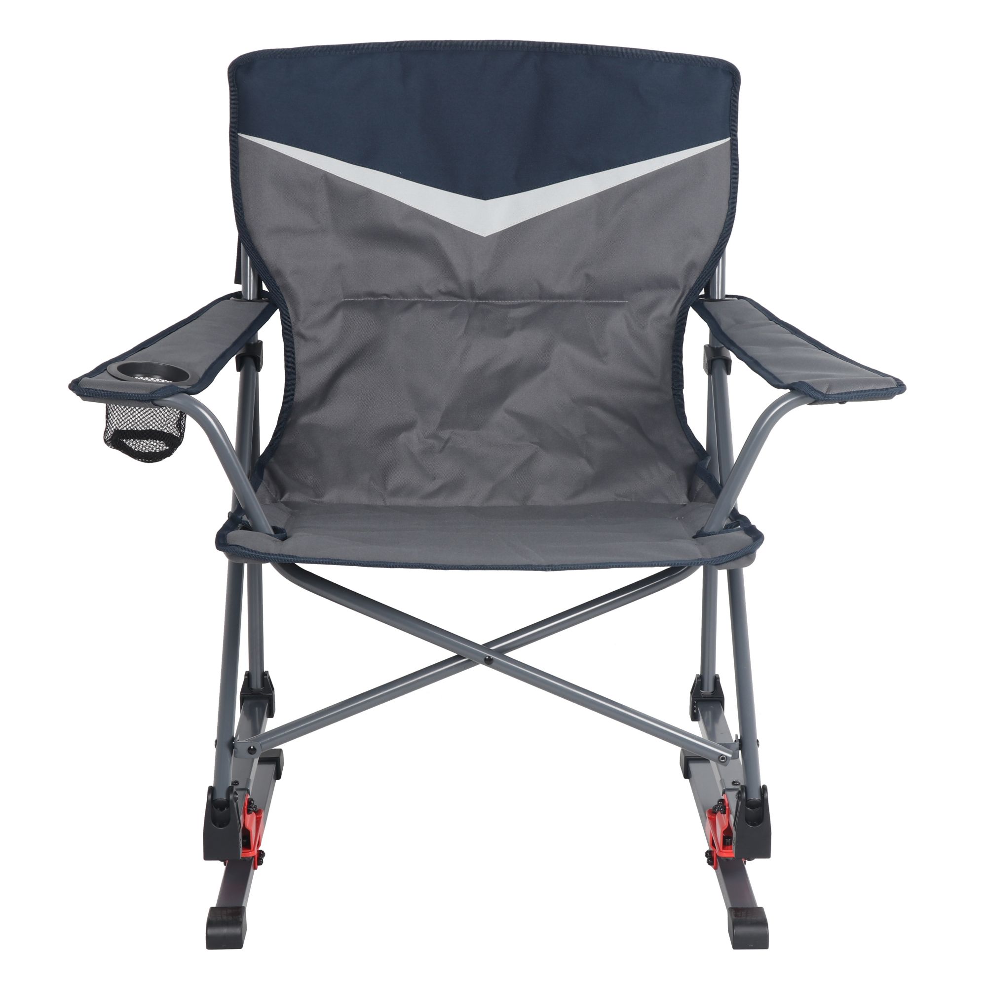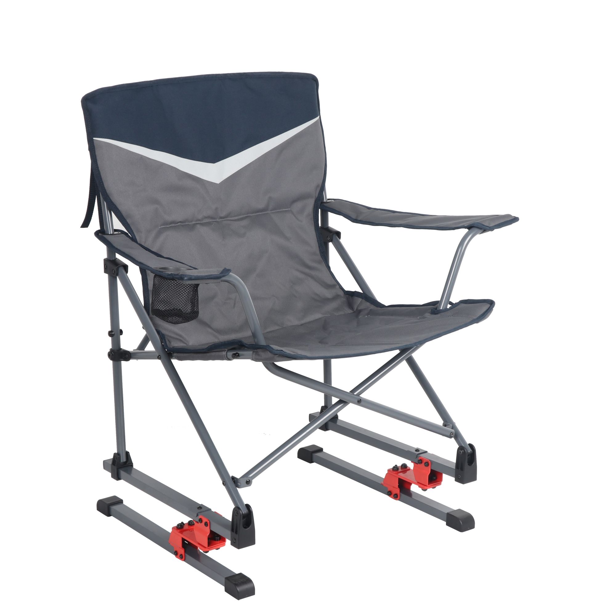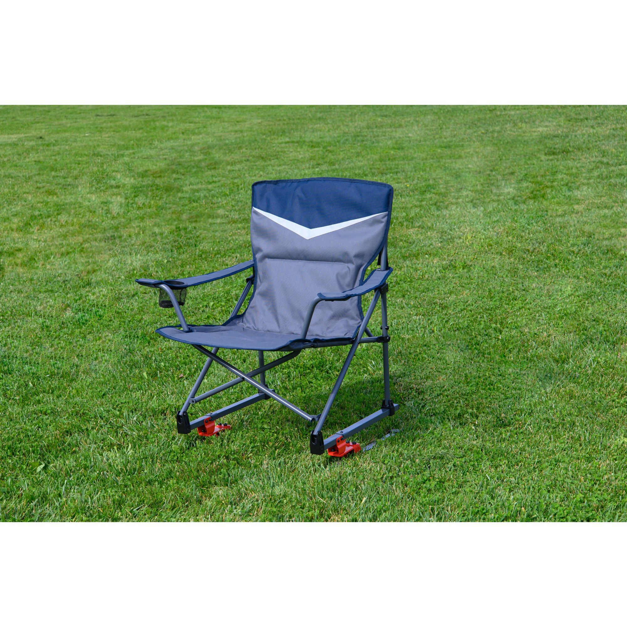 Unpack on-the-go comfort with this folding rocking chair. It packs up like normal quad-folding chair, but the patented spring action design allows for a light rocking motion for added comfort and to ease leg fatigue. Features a drink holder in the arm and is great for camping, sporting events and backyard functions.