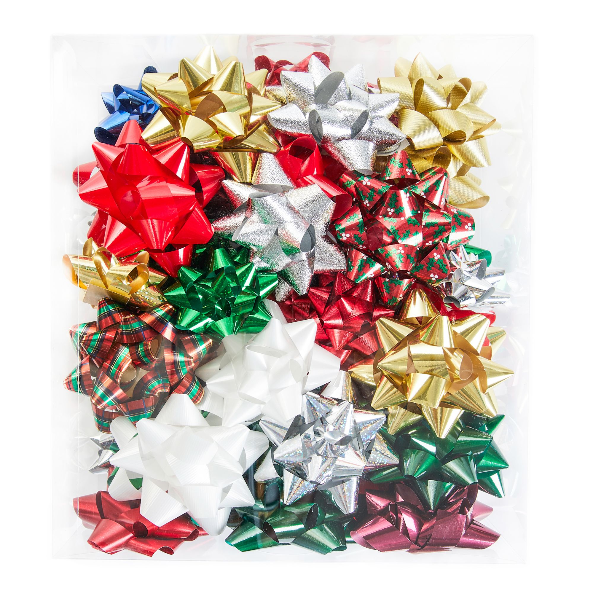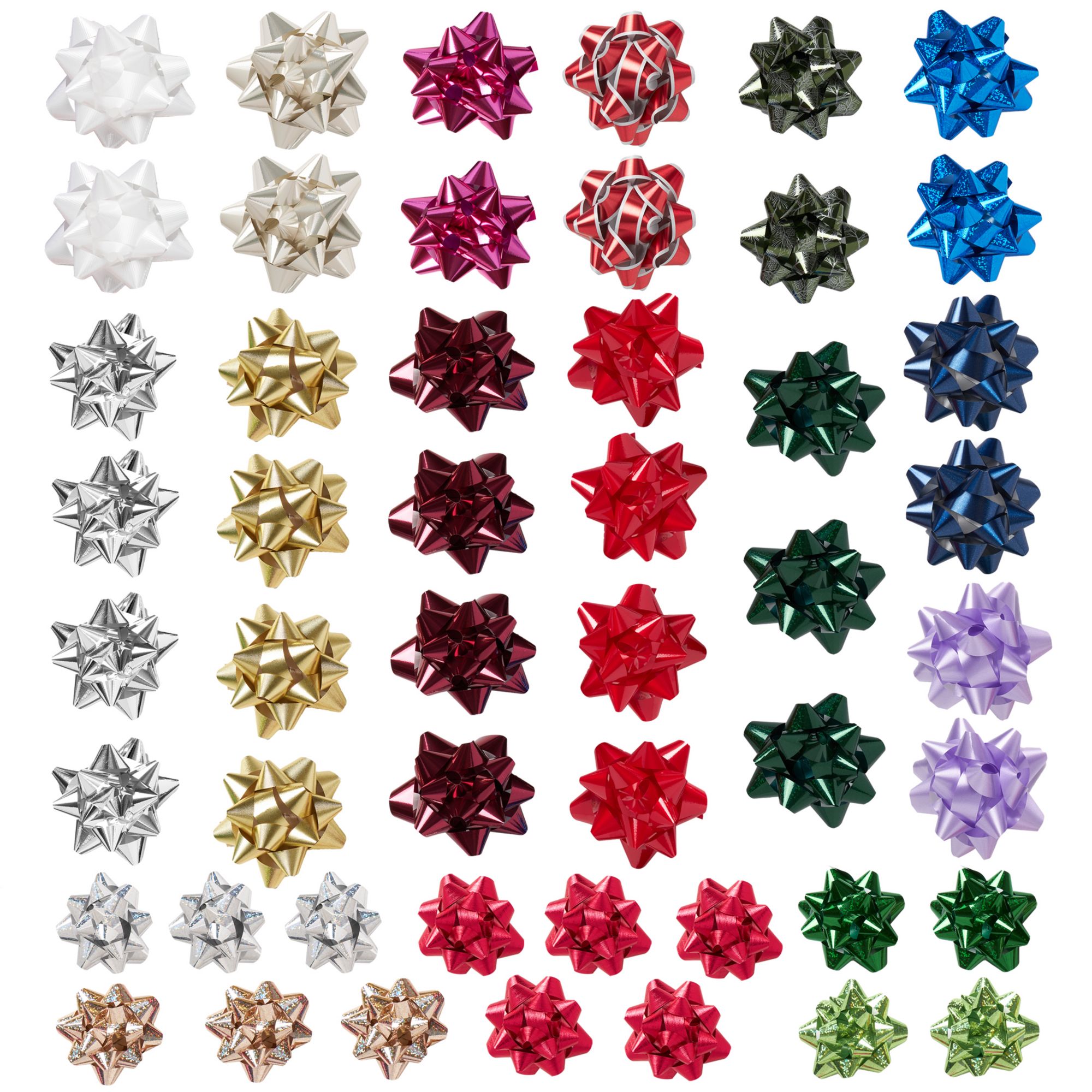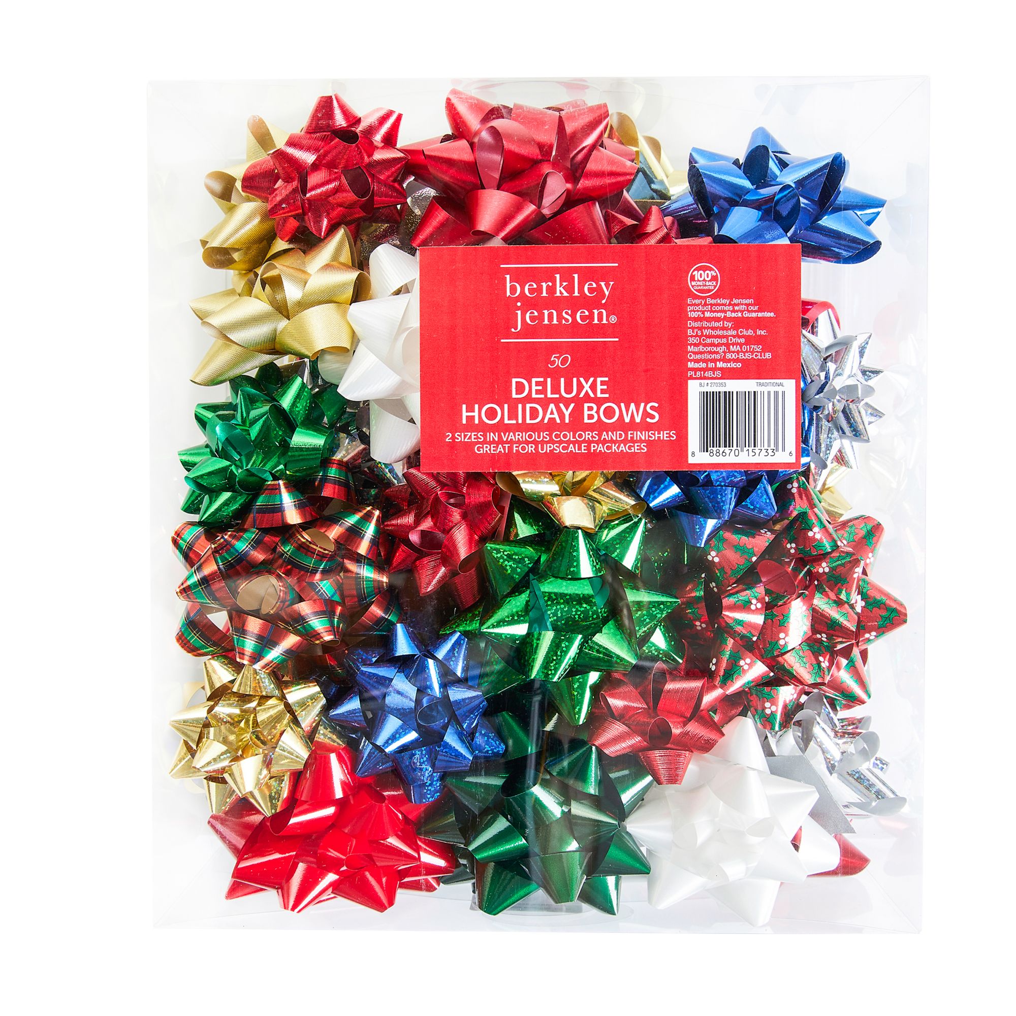 This package contains fifty deluxe holiday bows in two different sizes. The bows are in various colors and finishes that will be great for upscale package decorating. Christmas bows are a beautiful addition to your wrapped package. The packaging can be used as a storage container to keep the bows in shape.