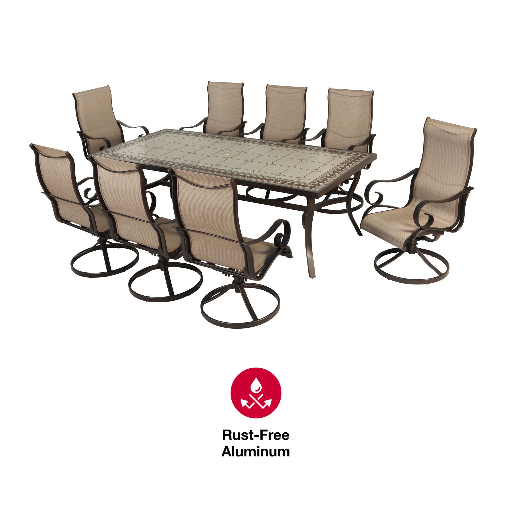 The Brookfield nine-piece dining set is sure to turn your patio into your favorite gathering place. This set includes eight sling swivel chairs and a rectangular dining table with a faux stone table top.