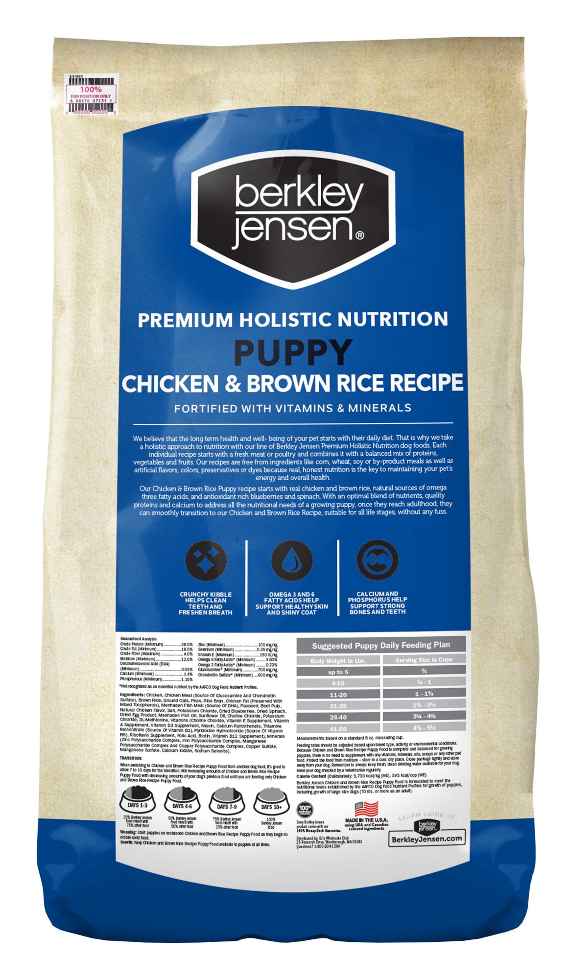 Berkley Jensen Chicken and Brown Rice Dry Dog Food For Puppies recipe starts with real chicken and brown rice, natural sources of omega three fatty acids, and antioxidant-rich blueberries and spinach. With an optimal blend of nutrients, quality proteins and calcium to address all the nutritional needs of a growing puppy, once they reach adulthood, they can smoothly transition to this Chicken and Brown Rice Recipe, suitable for all life stages.
