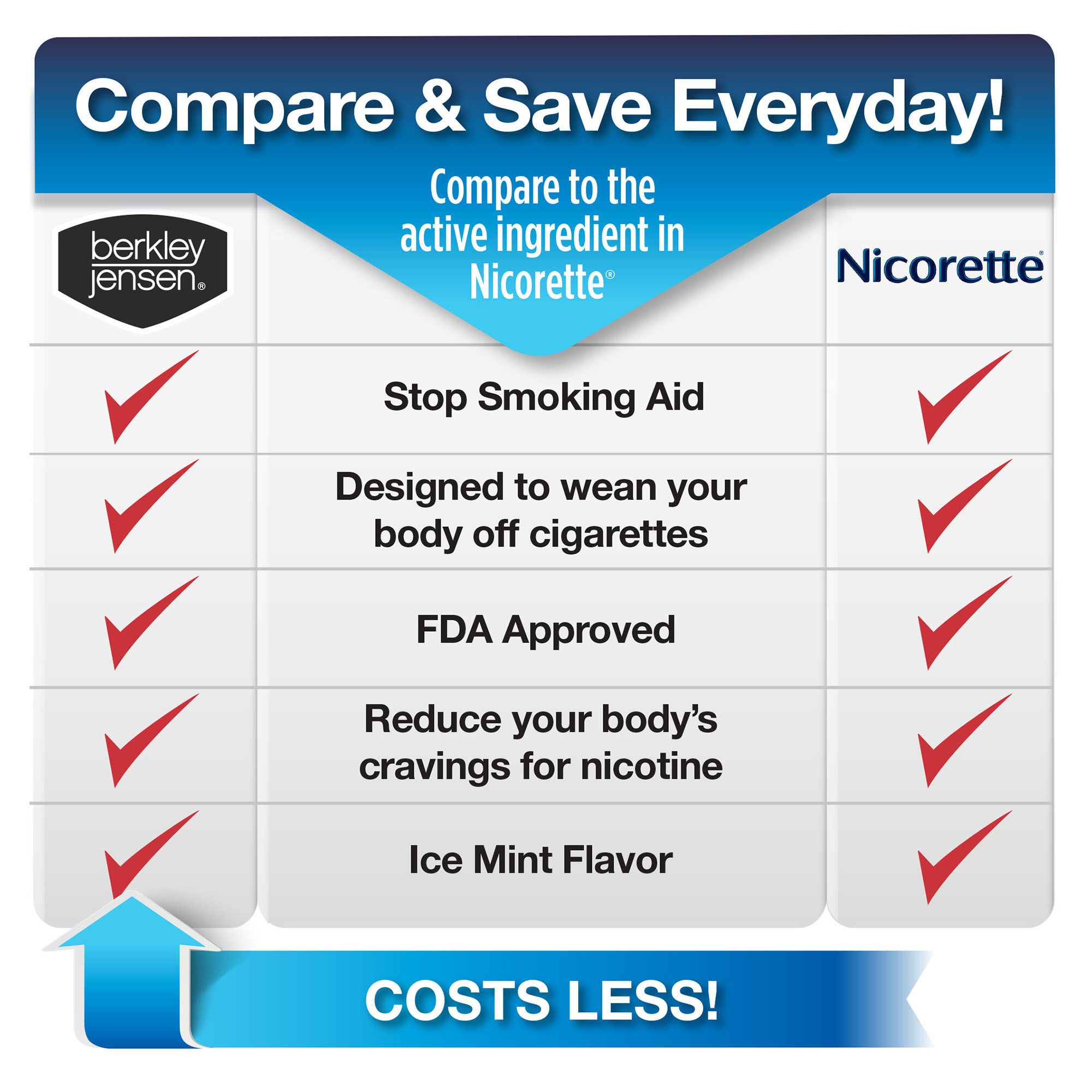 Double your chance to successfully quit smoking with Nicotine Polacrilex Coated Gum, 4 mg (when used as directed with a support program. Many people require several quit attempts to stop smoking). Nicotine Polacrilex Coated Gum, 4 mg (nicotine), Ice Mint Flavor, is a stop smoking aid for those who smoke their first cigarette within 30 minutes of waking up. This product is part of a Nicotine Replacement Therapy, which is designed to wean your body off cigarettes. It helps to regulate, control and gradually reduce your body's nicotine cravings. Smoking has two addictive components, a physical and a mental need for the nicotine in tobacco. Nicotine gum addresses the physical need to smoke by reducing withdrawal symptoms, including nicotine cravings. American Cancer Society (ACS) supports nicotine replacement therapy to help people on their journey towards a smoke-free lifestyle. Compare to Nicorette Gum active ingredient.