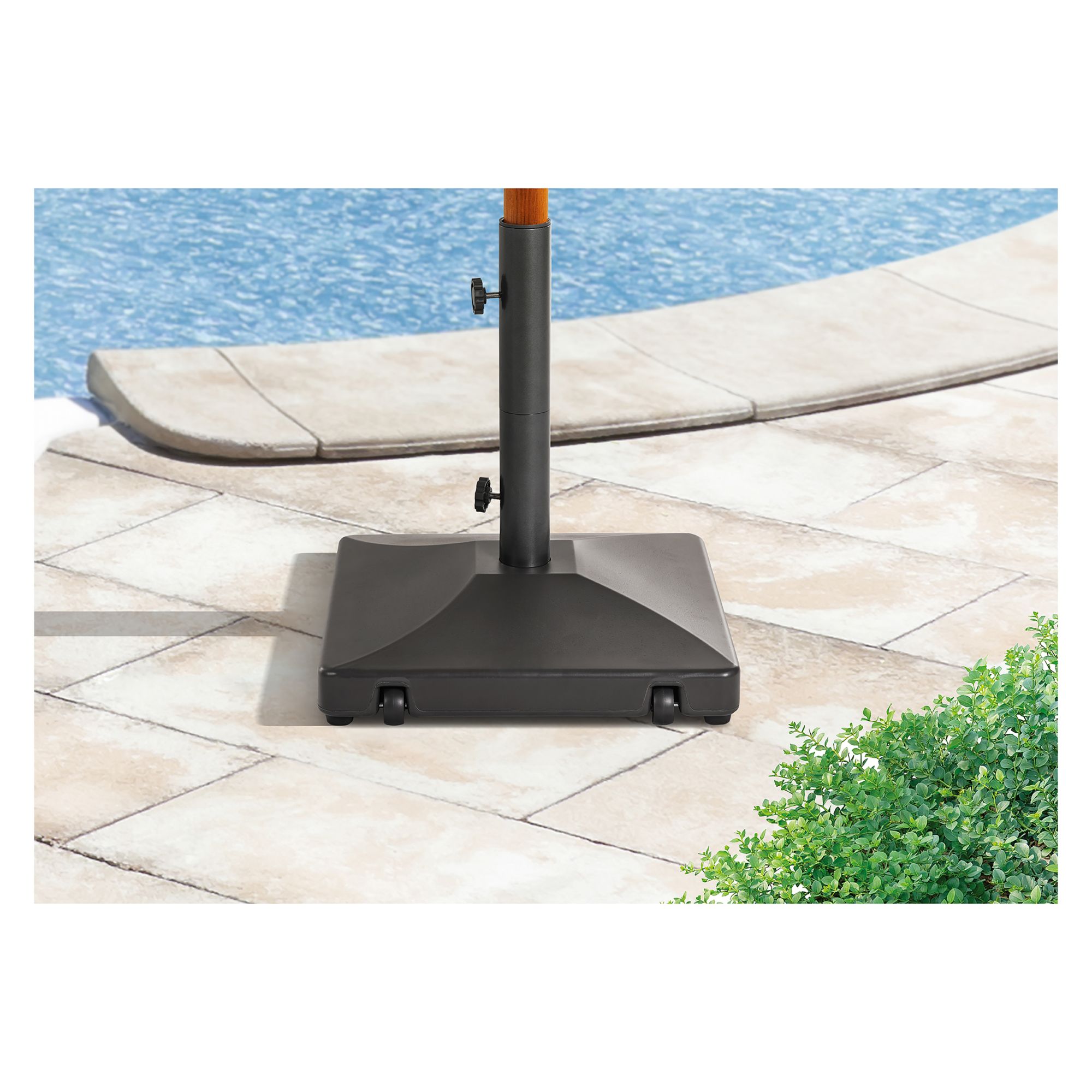 Provide stability for all your summer fun-in-the-shade with the Berkley Jensen Concrete Umbrella Base. With wheels for easy transport, you can get shade just where you need it and avoid getting too hot. The poles are located in two sections, so you can either use the stand on its own or under a table. It's also heavy-duty to allow for more stability in your outdoor space.