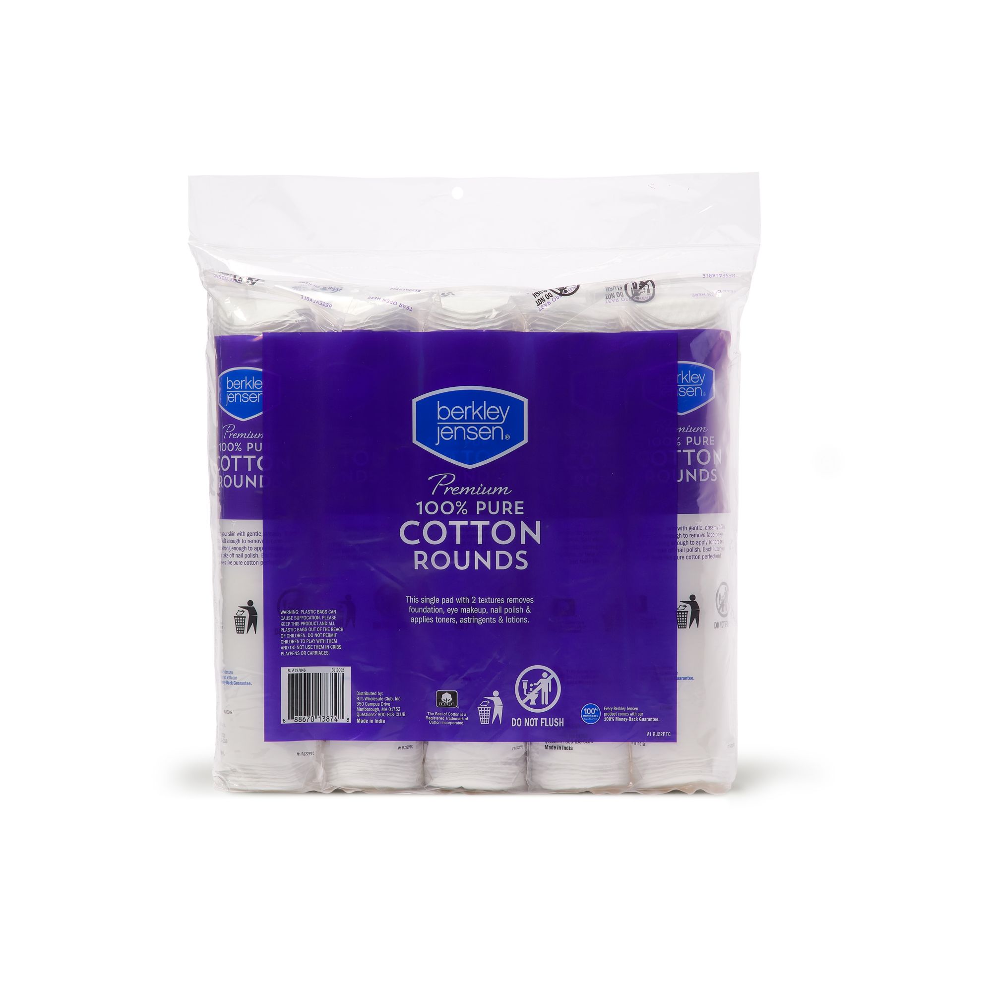 Be kind to your skin with Berkley Jensen Cotton Rounds. These premium cotton rounds are made from 100% cotton, are hypoallergenic, and lint free. This single pad with two textures is a beauty and skincare staple. Starting with an embossed layer of cotton that is quilted for strength, it also helps to reduce linting. A plush cotton core provides softness, absorbency, and thickness. A smooth layer of spun lace delivers added strength creating an ideal cotton round for cleansing and removal of cosmetics and nail polish. You can expect premium quality with the patented stitched edge design that binds all cotton layers together to ensure a durable, lint-free pad that will not separate during use. Soft enough to remove face or eye makeup, strong enough to apply toners and lotions, or take off nail polish, this is a beauty and skincare must have!