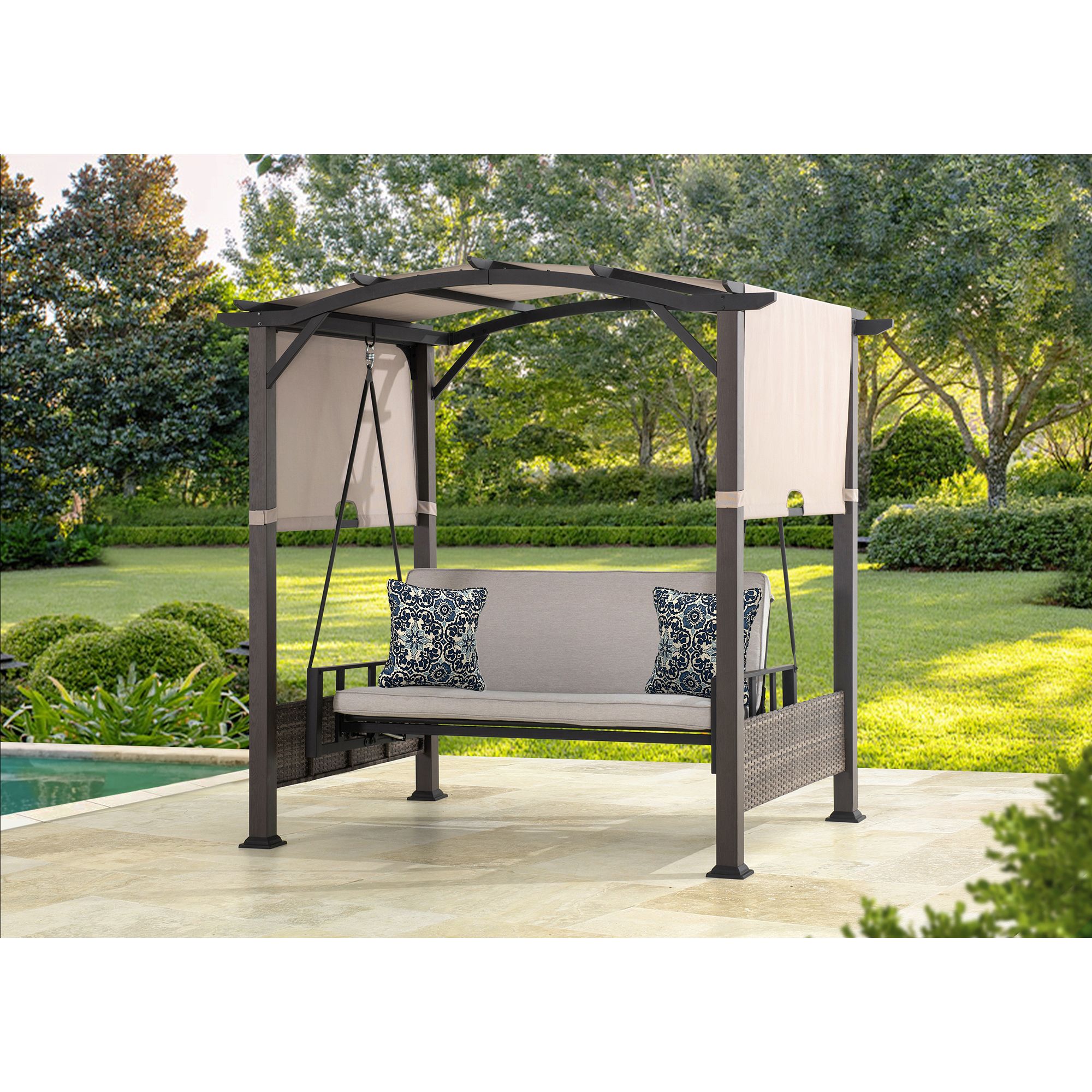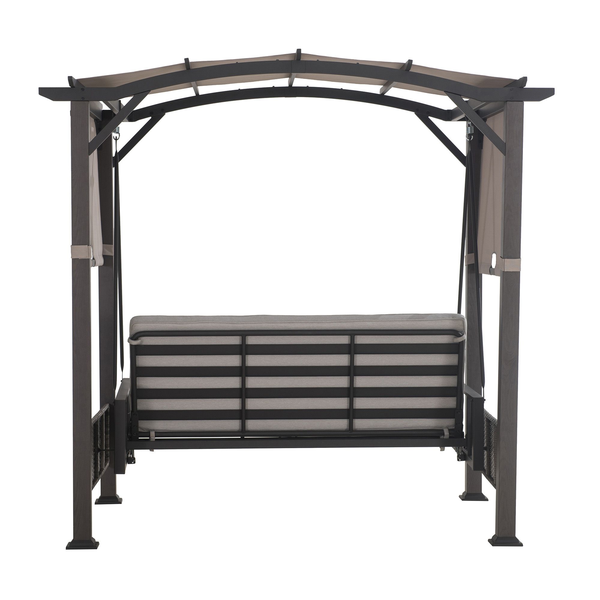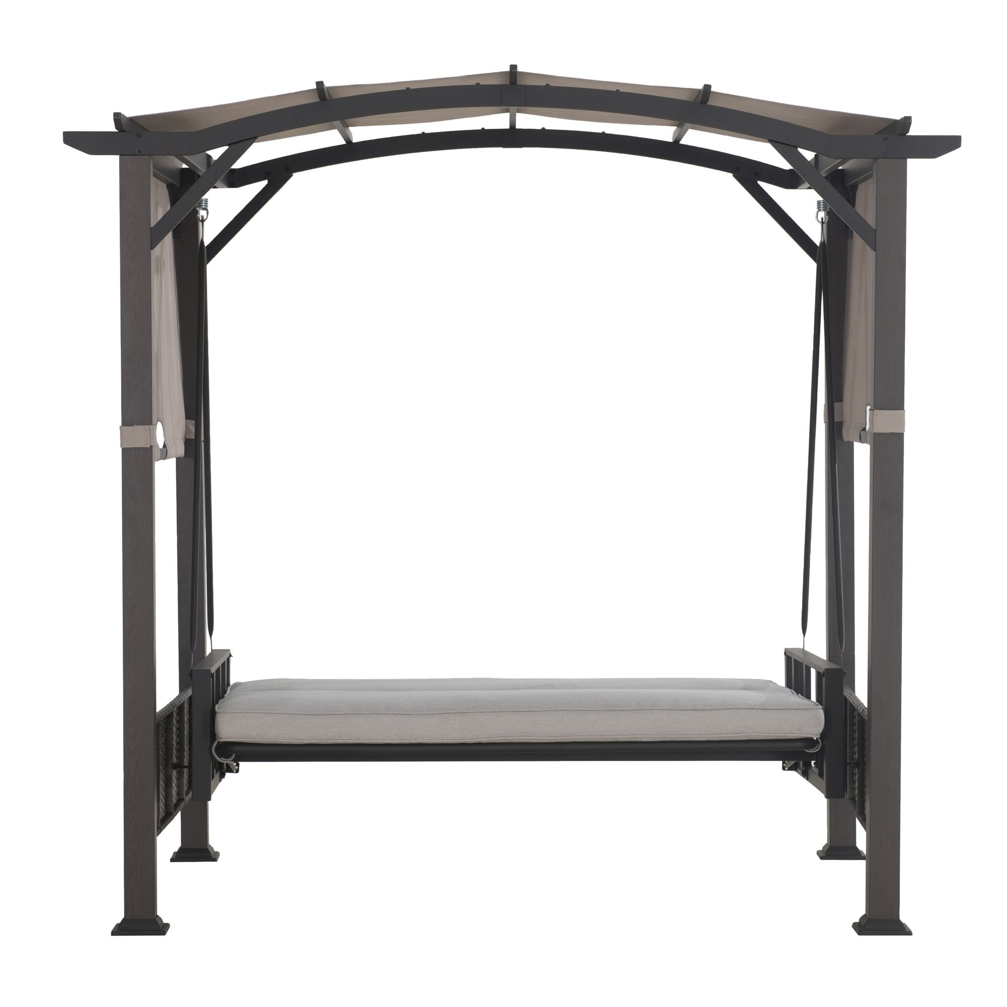 This item is exclusive, unique to BJ's Rust-resistant steel frame with gray polyester polyester canopy Contains seat and back cushion Frame is made of heavy-duty steel with a brown powder-coated finish Swing can be in relaxed seating position on converted into a bed Includes steel frame, swing, cushions, canopy