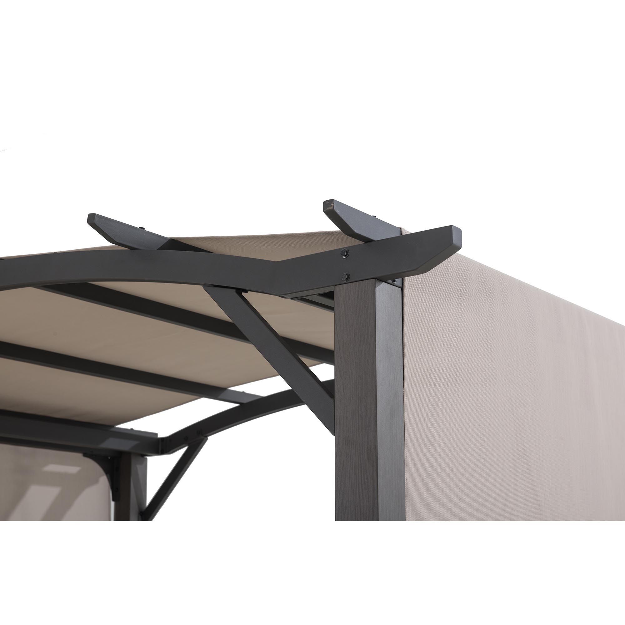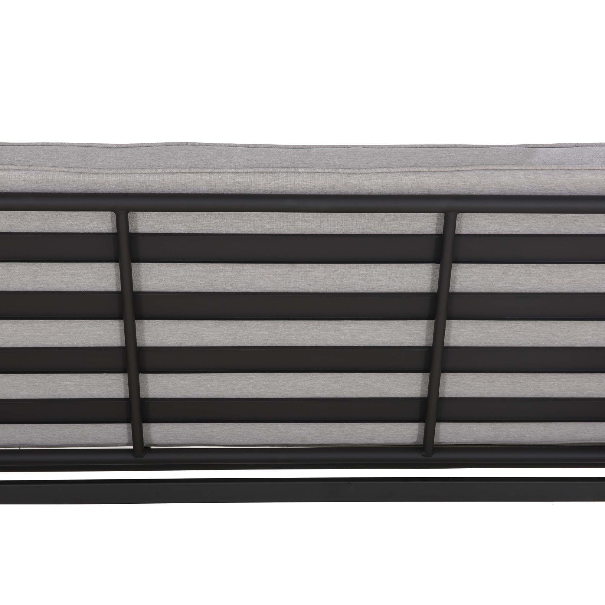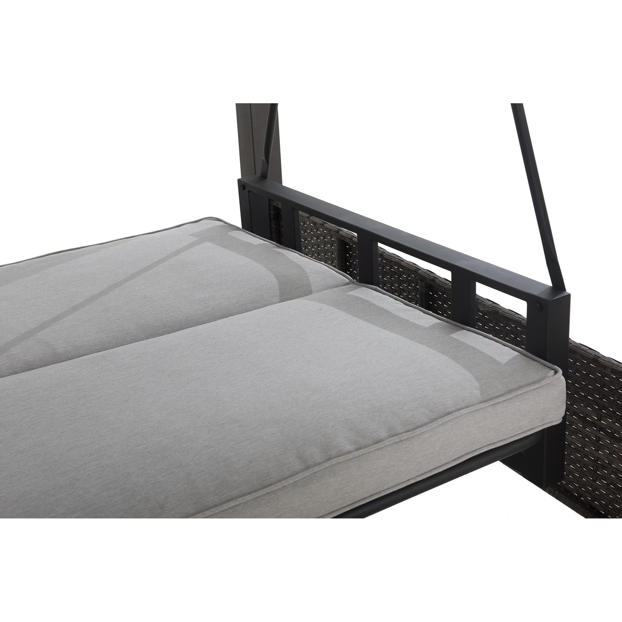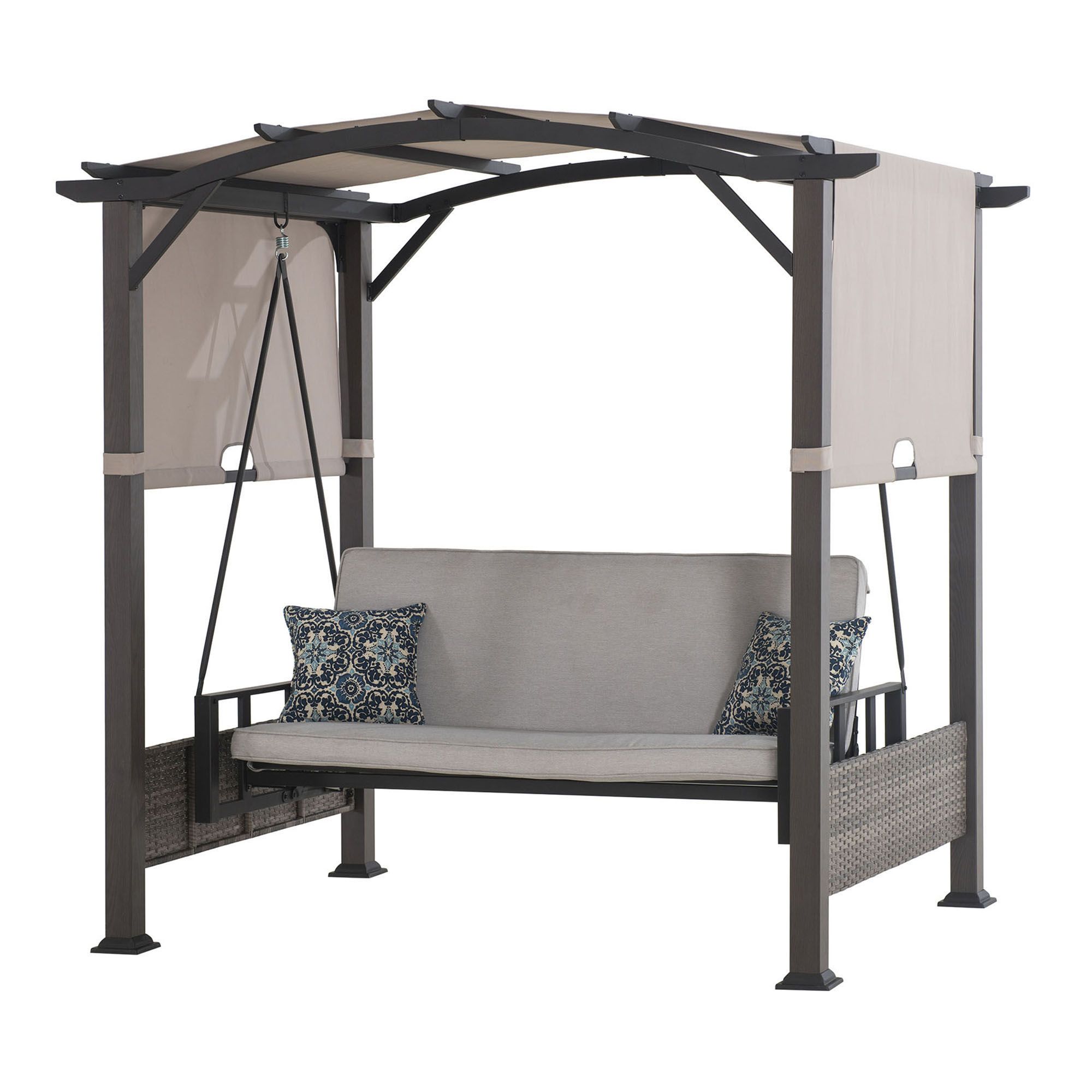 This item is exclusive, unique to BJ's Rust-resistant steel frame with gray polyester polyester canopy Contains seat and back cushion Frame is made of heavy-duty steel with a brown powder-coated finish Swing can be in relaxed seating position on converted into a bed Includes steel frame, swing, cushions, canopy