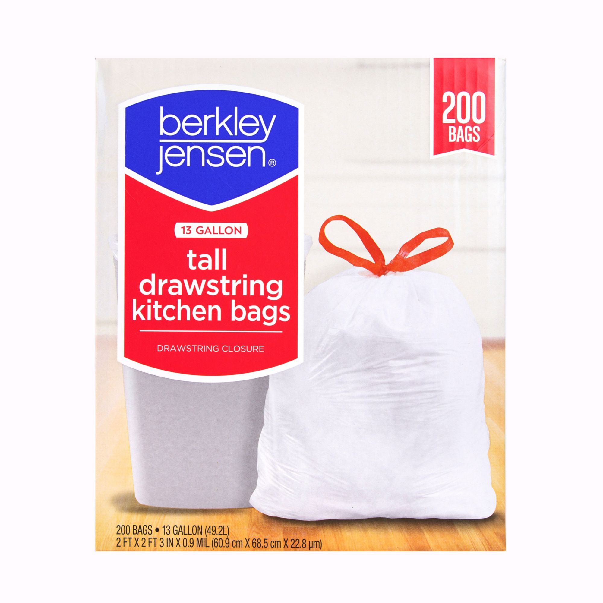 Berkley Jensen 13 gal. Drawstring Tall Kitchen Bags are ideal for kitchen garbage cans and recycling cans. White trash bag with red drawstring closure for easy tying and carrying. Strong construction made with 0.90 mil thick, durable, certified BPA-free plastic. Traps lock and neutralize odors to keep your kitchen smelling fresh. The durable drawstring ensures that the bag stays in place. Packaged in 100% recycled paperboard.
