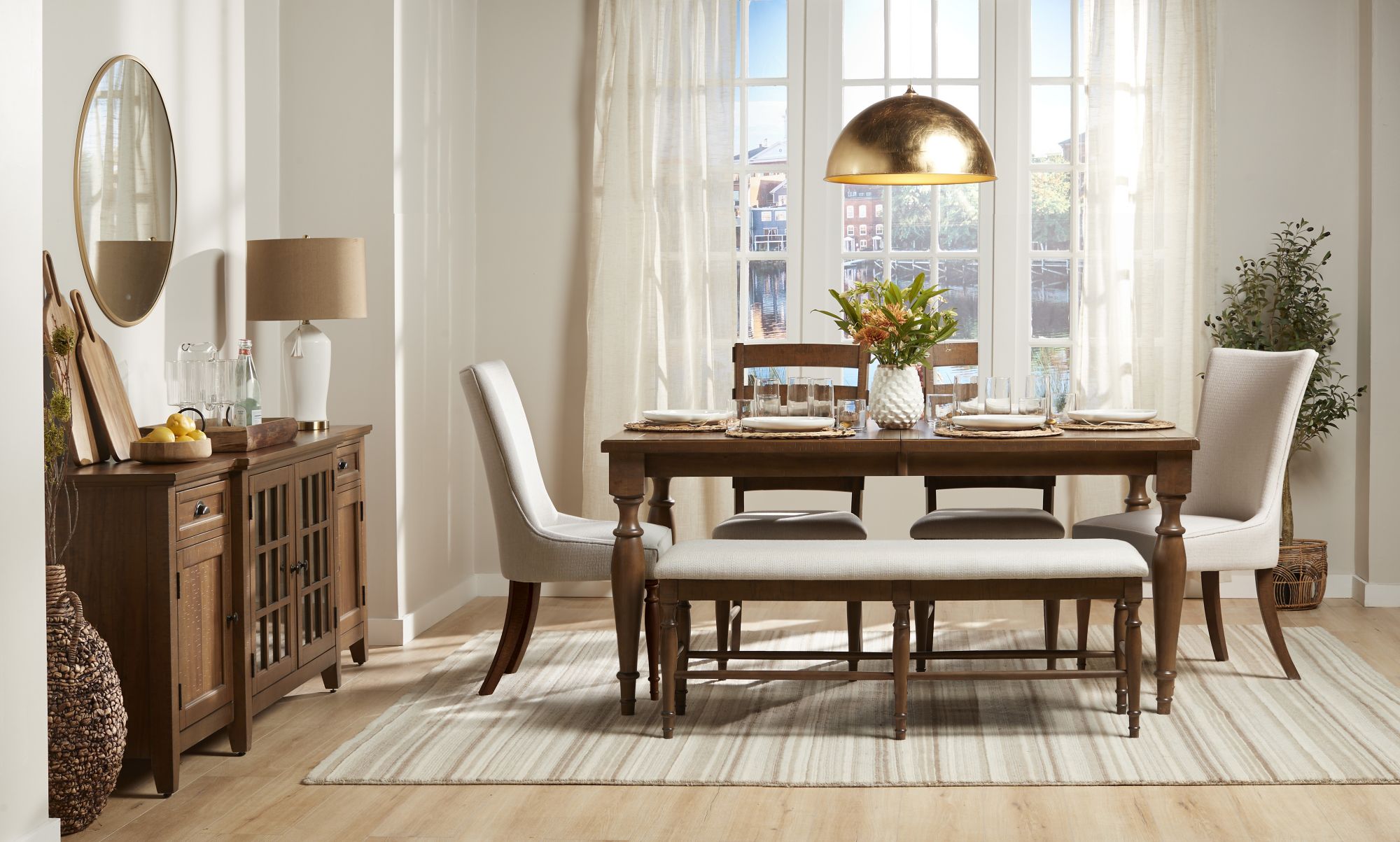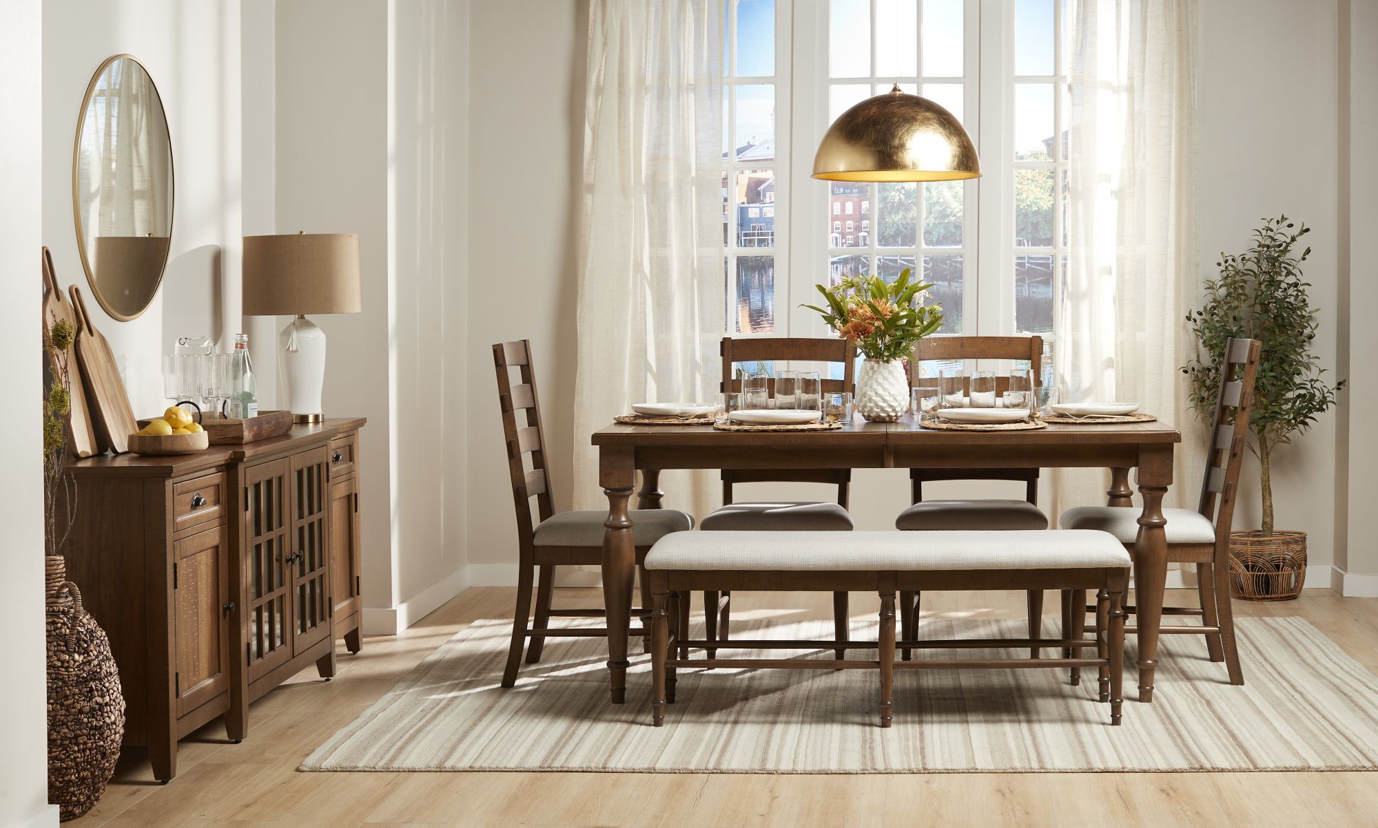 Includes dining table with leaf, bench, two side chairs and two upholstered chairs