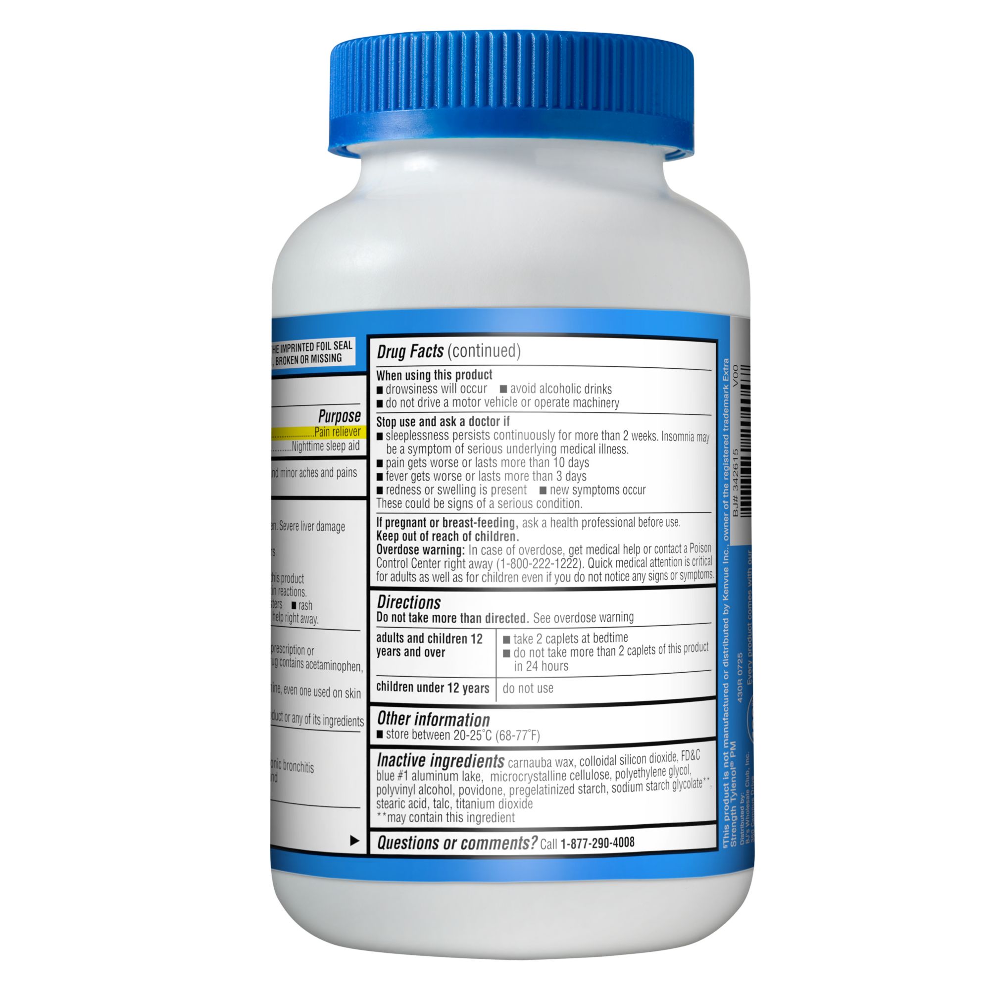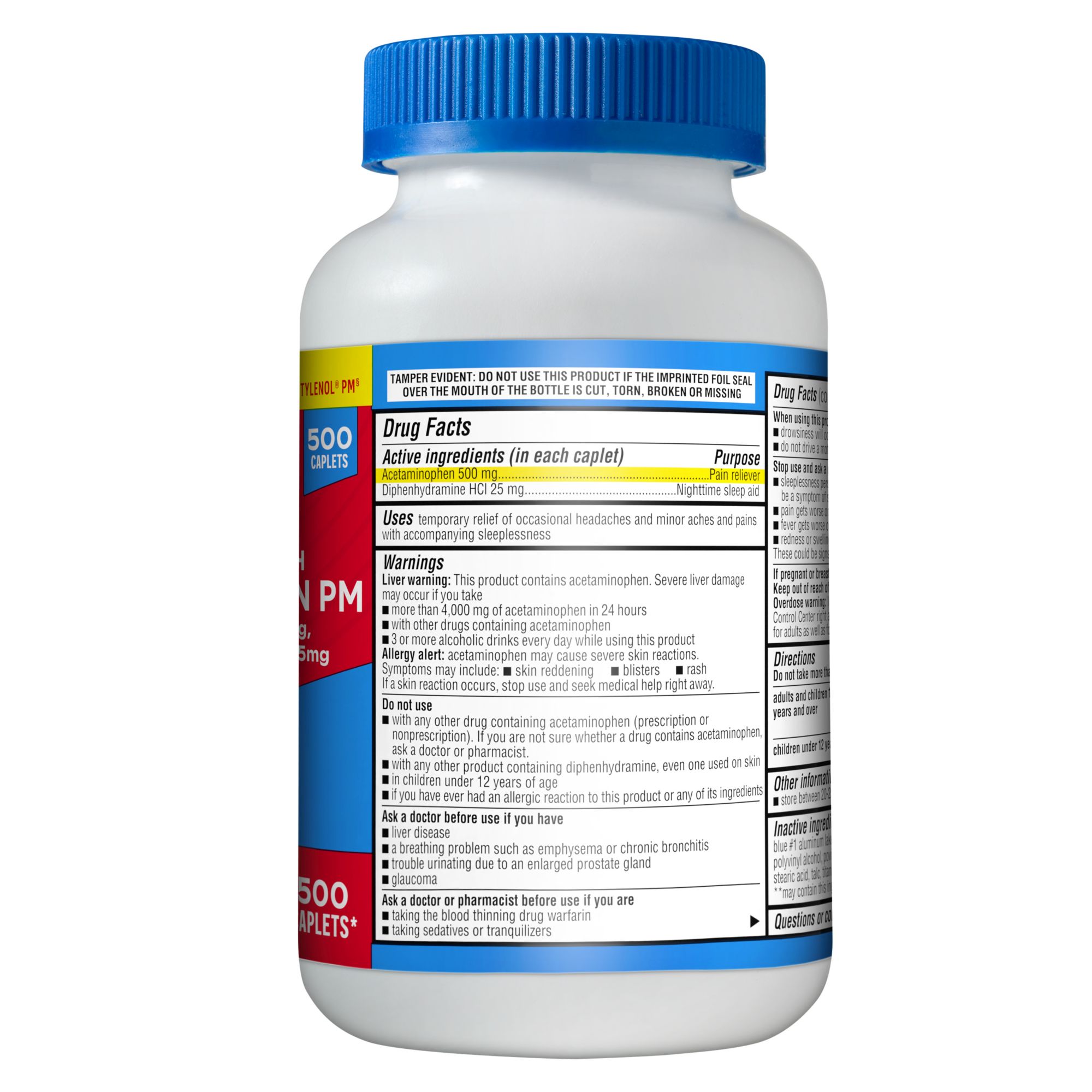 Product Warnings and Restrictions: Liver Warning: This Product Contains Acetaminophen. Severe Liver Damage May Occur If You Take • More Than 4,000 Mg Of Acetaminophen In 24 Hours • With Other Drugs Containing Acetaminophen • Three Or More Alcoholic Drinks Every Day While Using This Product. Allergy Alert: Acetaminophen May Cause Severe Skin Reactions. Symptoms May Include: • Skin Reddening • Blisters • Rash. If A Skin Reaction Occurs, Stop Use And Seek Medical Help Right Away. Do Not Use • With Any Other Drug Containing Acetaminophen (Prescription Or Nonprescription). If You Are Not Sure Whether A Drug Contains Acetaminophen, Ask A Doctor Or Pharmacist • With Any Other Product Containing Diphenhydramine, Even One Used On Skin • In Children Under 12 Years Of Age • If You Have Ever Had An Allergic Reaction To This Product Or Any Of Its Ingredients Ask A Doctor Before Use If You Have • Liver Disease • A Breathing Problem Such As Emphysema Or Chronic Bronchitis • Trouble Urinating Due To An Enlarged Prostate Gland • Glaucoma Ask A Doctor Or Pharmacist Before Use If You Are • Taking The Blood Thinning Drug Warfarin • Taking Sedatives Or Tranquilizers When Using This Product • Drowsiness Will Occur • Avoid Alcoholic Drinks • Do Not Drive A Motor Vehicle Or Operate Machinery Stop Use And Ask A Doctor If • Sleeplessness Persists Continuously For More Than Two Weeks. Insomnia May Be A Symptom Of A Serious Underlying Medical Illness. • Pain Gets Worse Or Lasts More Than 10 Days • Fever Gets Worse Or Lasts More Than Three Days • Redness Or Swelling Is Present • New Symptoms Occur. These Could Be Signs Of A Serious Condition. If Pregnant Or Breastfeeding, Ask A Health Professional Before Use. Keep Out Of Reach Of Children. Overdose Warning: In Case Of Overdose, Get Medical Help Or Contact A Poison Control Center Right Away (1-800-222-1222). Quick Medical Attention Is Critical For Adults As Well As For Children Even If You Do Not Notice Any Signs Or Symptoms.