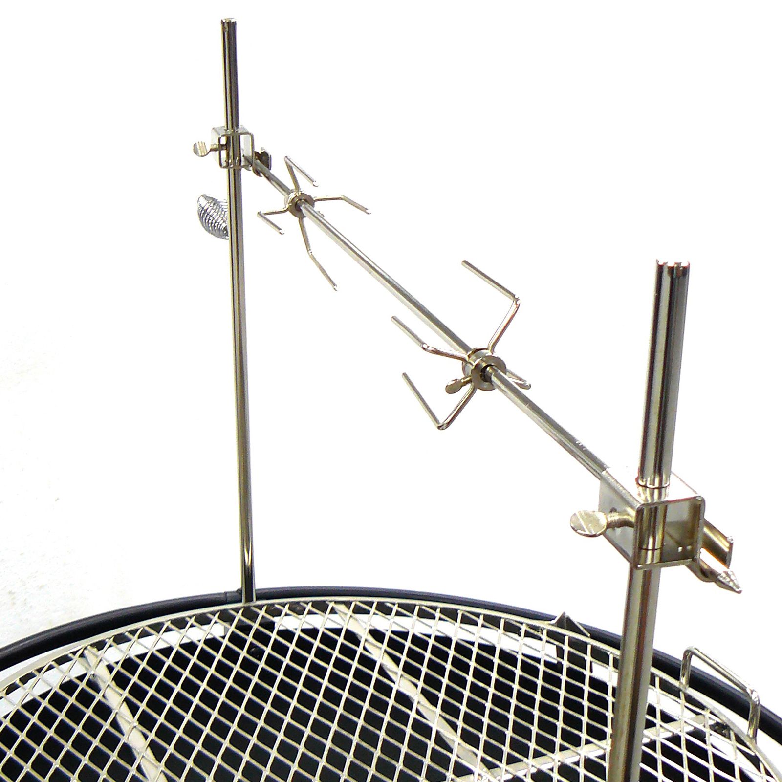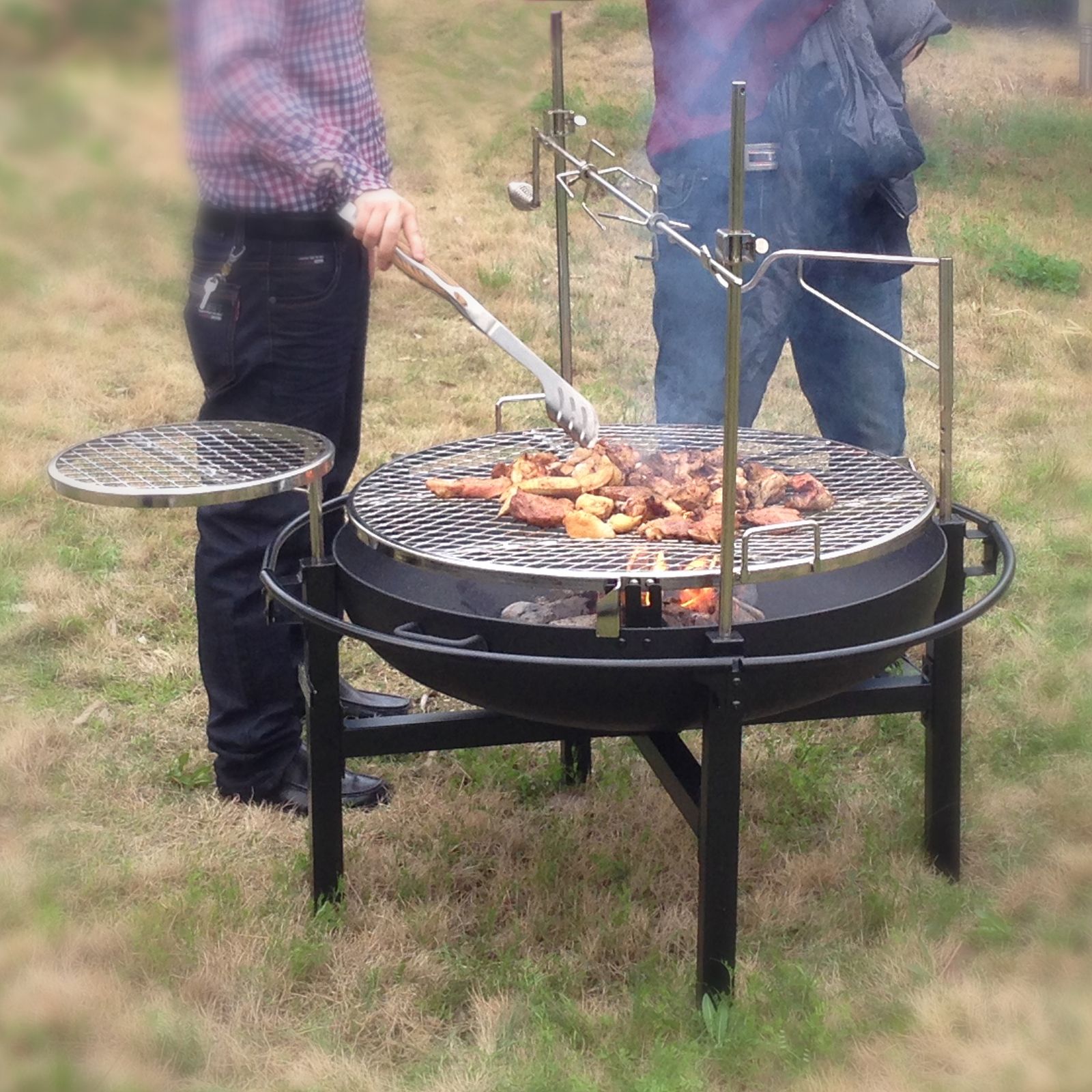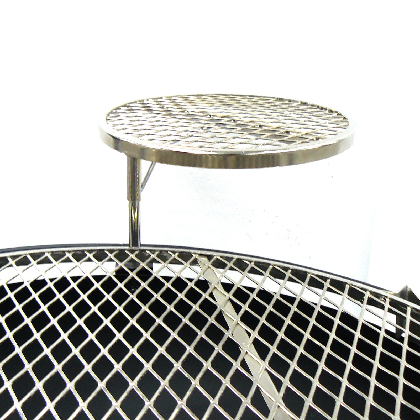 This 30" diameter heavy duty steel bowl firepit is a perfect size for all kinds of gatherings with family and friends. No matter if you are a professional cook, a weekend griller or outdoor enthusiast, you will appreciate the stylish and sturdiness of the chrome-plated mesh grate and the versatility of the swivel worktable and large pot hook which are standard features. A height-adjustable rotisserie set is a bonus and great for roasting a whole chicken or a prime rib to complete the perfect meal for any special occasions. Removing all the chrome accessories above the fire bowl, this product converts into a firepit with a boot rail and instantly becomes a backyard centerpiece for any chilly gathering. For after-use maintenance, a drainpipe and a stopper located at the bottom of the fire bowl makes cleaning easy without the need to turn over the heavy firepit. A PVC grill cover is also included that protects the firepit from the elements during outdoor storage.