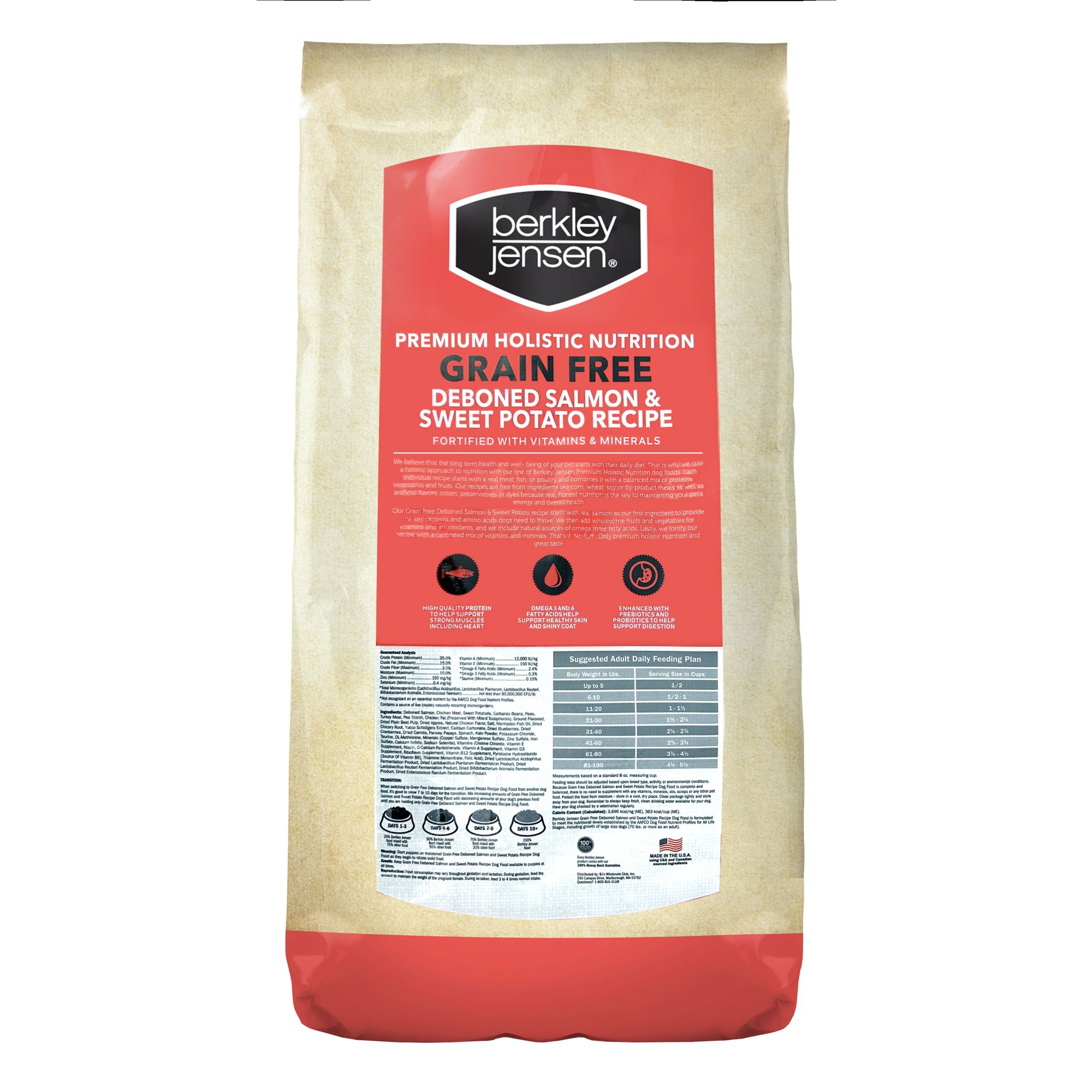 Berkley Jensen Grain Free Salmon and Sweet Potato Dry Dog Food starts with real salmon. Its first ingredient provides the key proteins and amino acids that your dogs need to thrive. Then wholesome fruits and vegetables are added for vitamins and antioxidants, and natural sources of omega three fatty acids are included. Lastly, this recipe is fortified with a calibrated mix of vitamins and minerals.