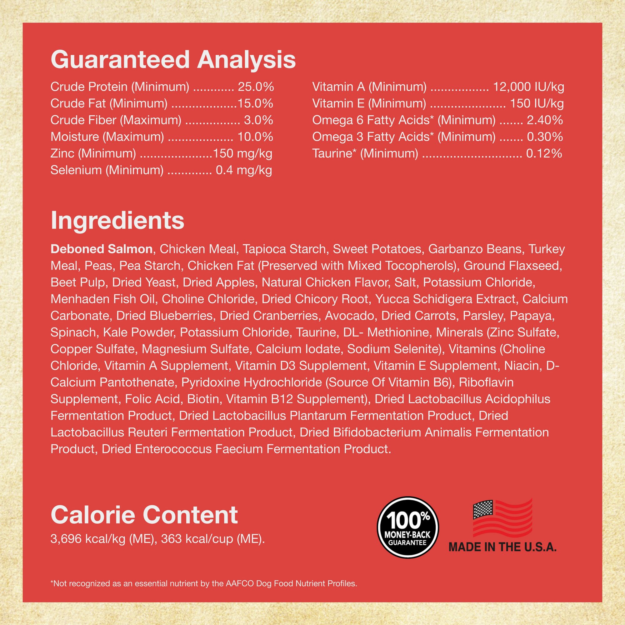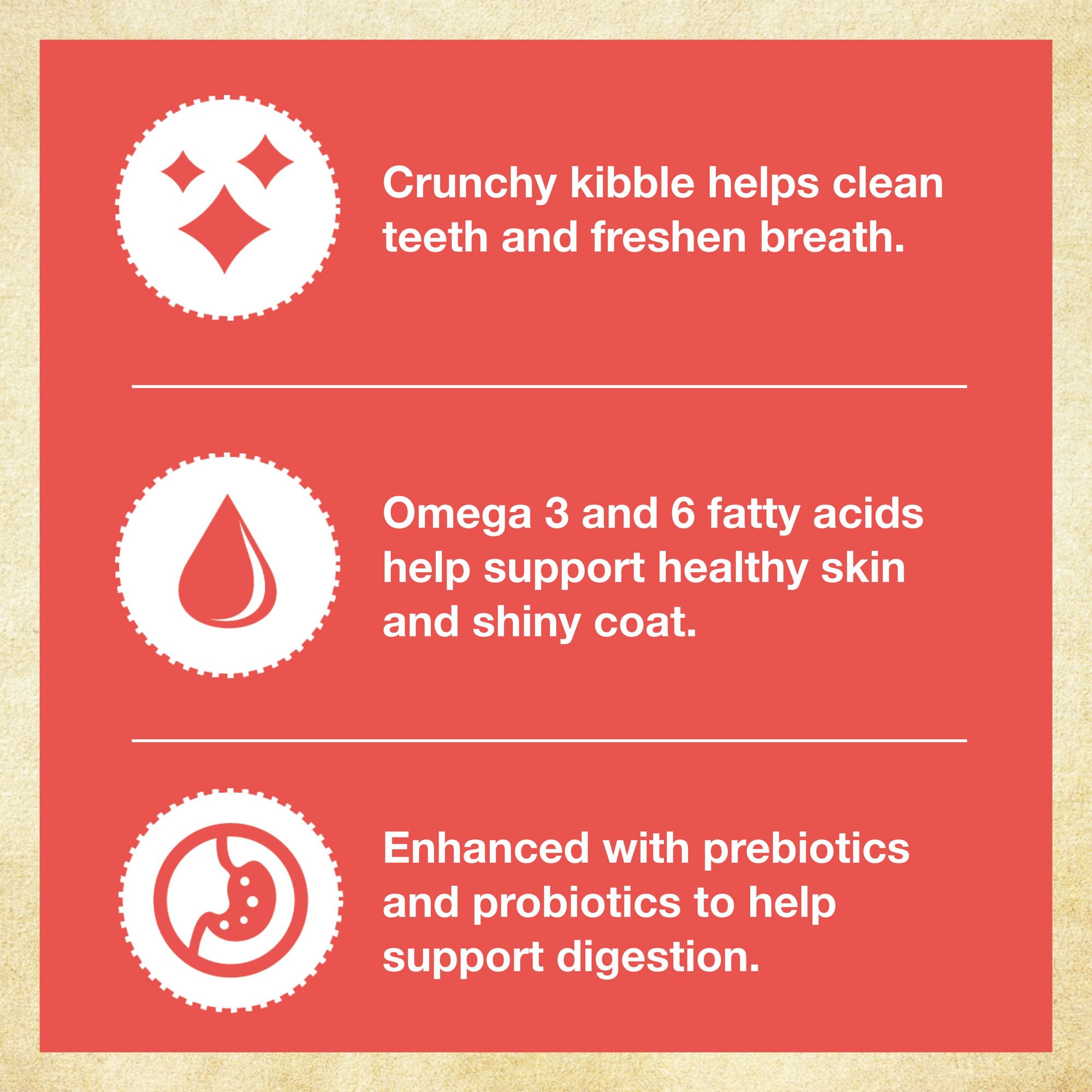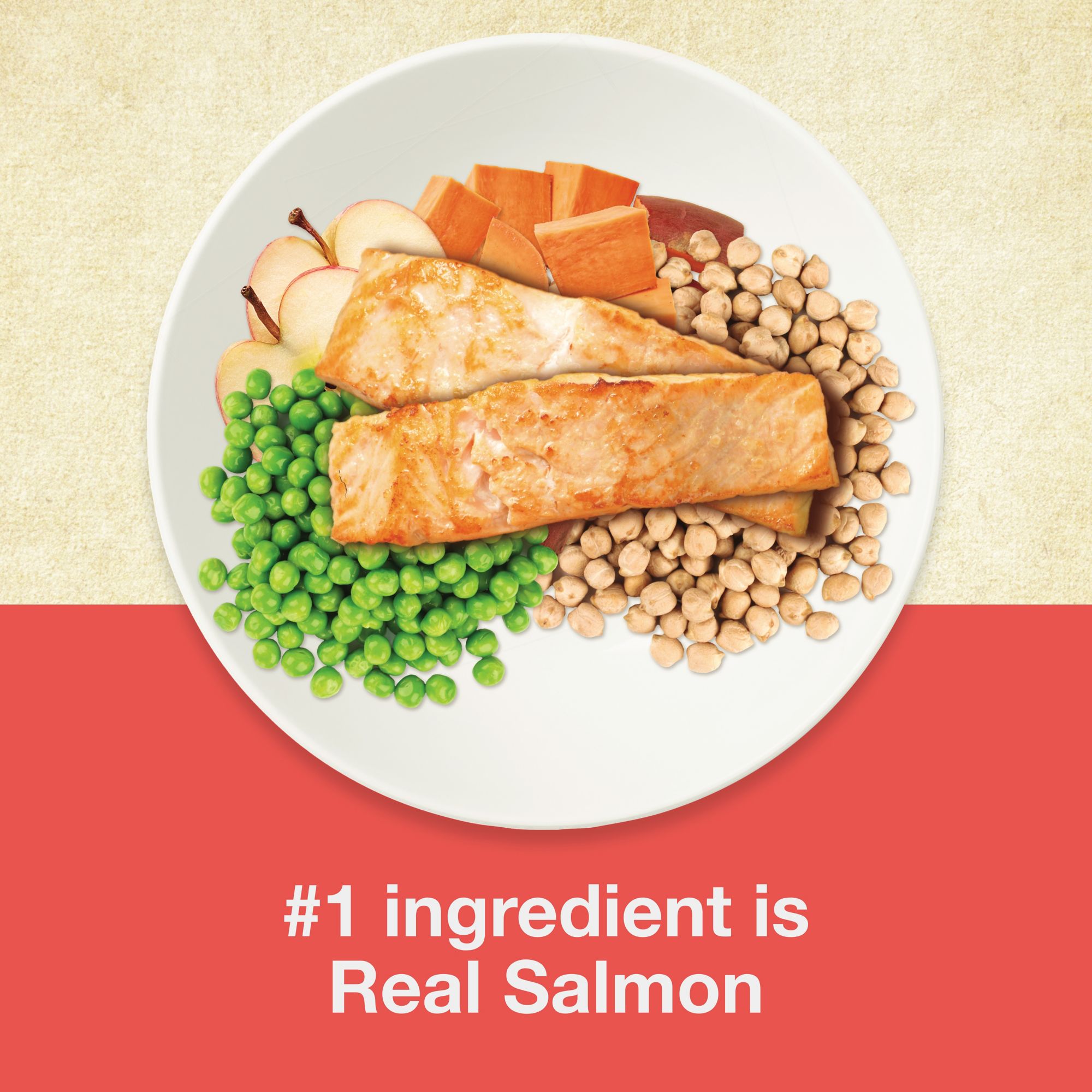 #1 ingredient is real salmon No corn, wheat, soy, by-product meals or fillers No artificial colors, flavors, or preservatives For all life stages Omega 3 and 6 fatty acids help support healthy skin and shiny coat Enhanced with prebiotics and probiotics to help support digestion Crunchy kibble helps clean teeth and freshen breath Dry dog food Includes 30-lb. grain free salmon and sweet potato recipe for dogs
