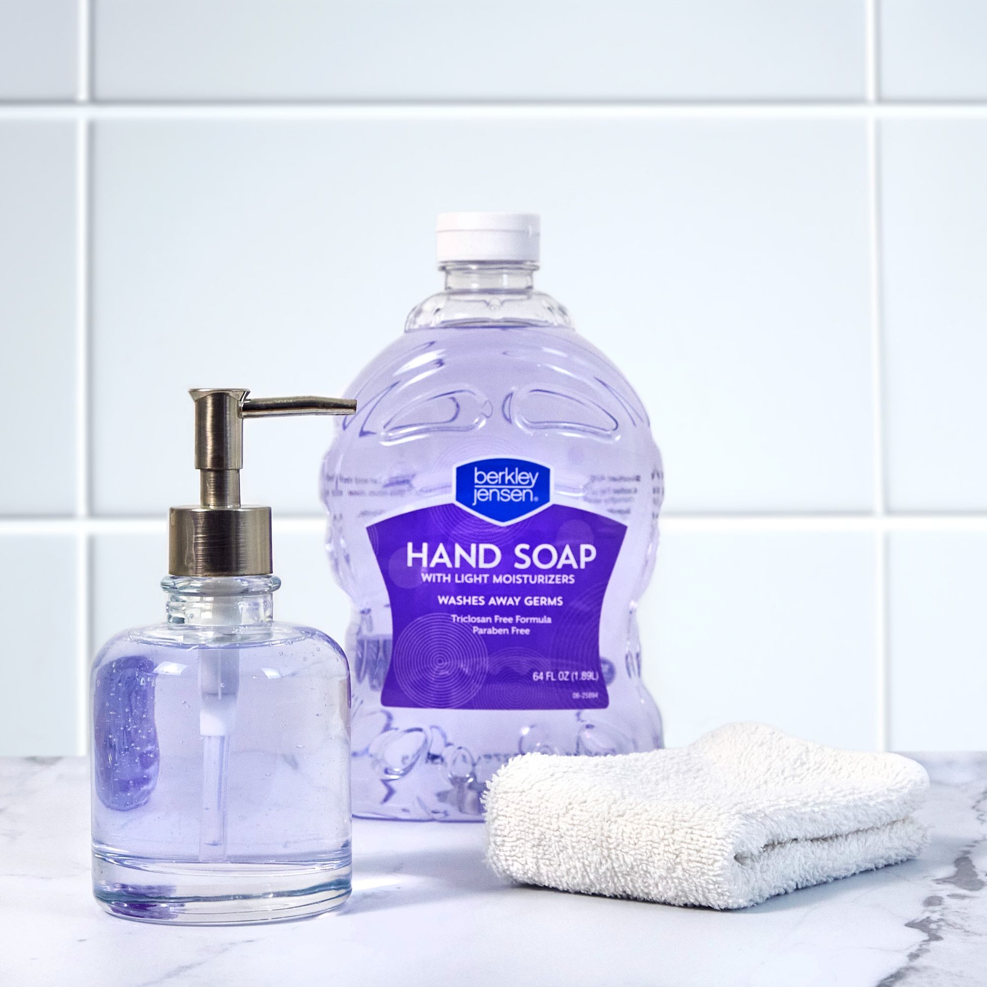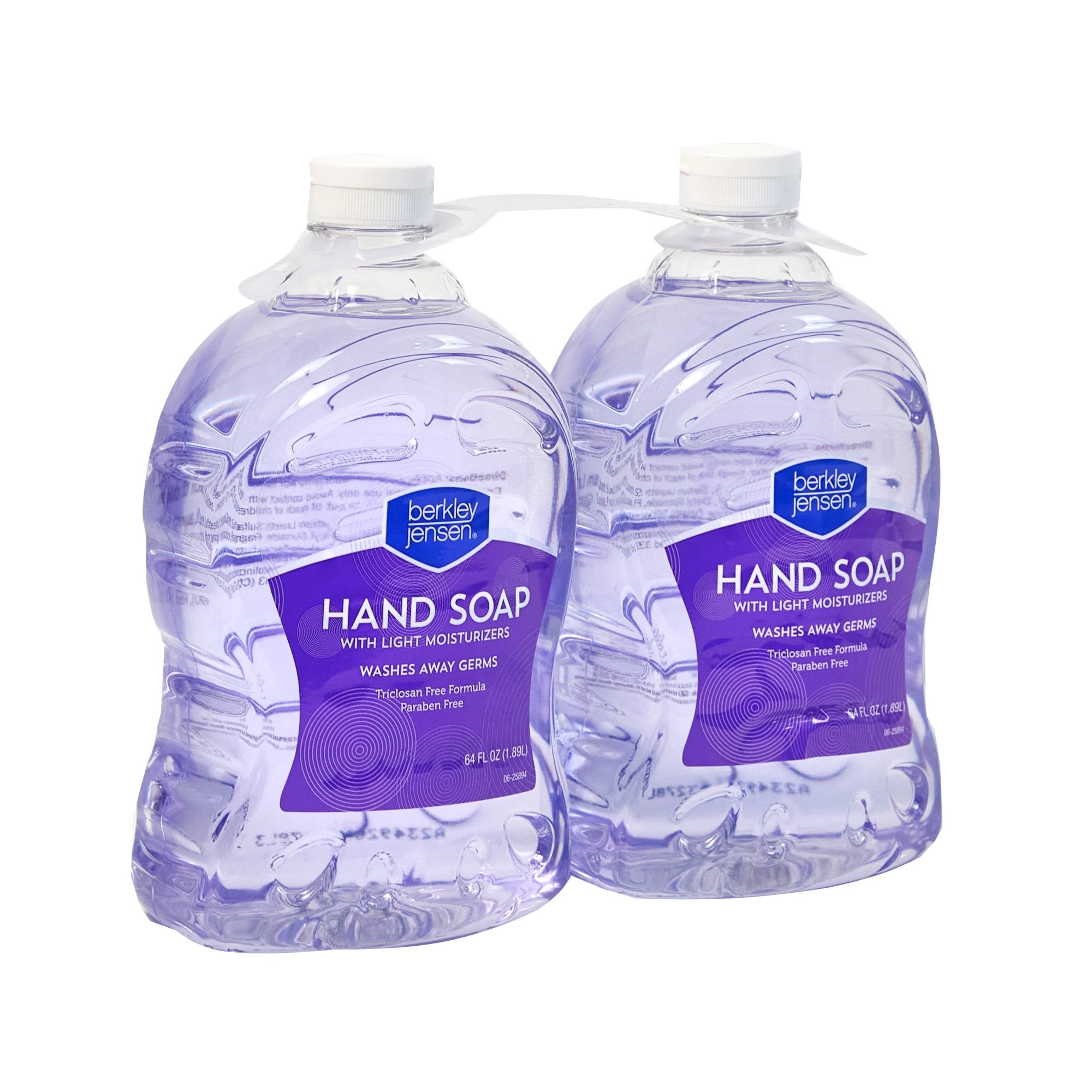Wash away germs with Berkley Jensen Hand Soap. This handwashing soap contains no harsh chemicals and is formulated with light moisturizers to leave hands feeling clean and soft.