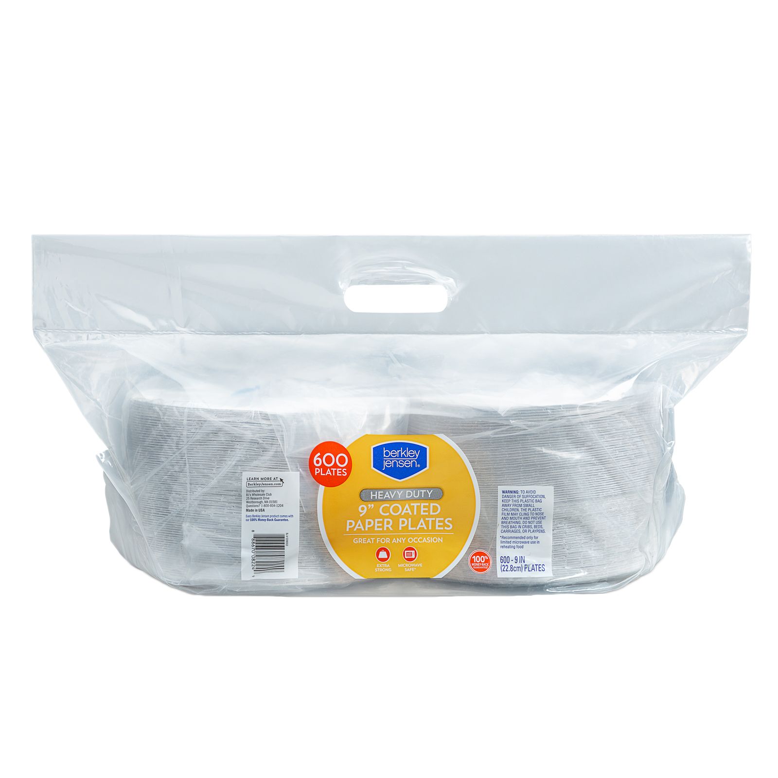 These Berkley Jensen 9" heavy duty coated paper plates are great for everyday use when you don’t want to dirty a hard plate. They are economical and lightweight without losing durability. This pack includes 600 9" paper plates