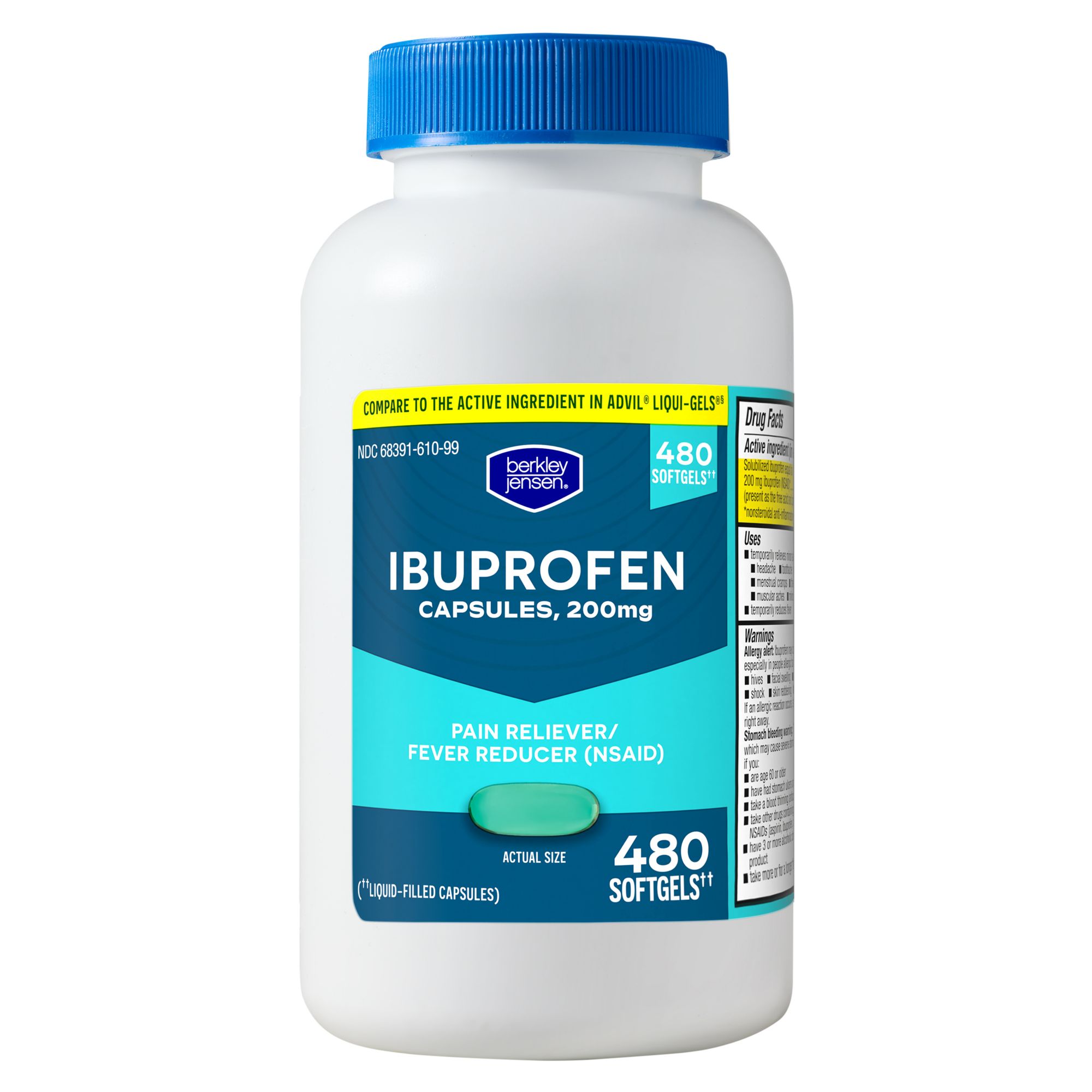 Berkley Jensen Ibuprofen 200mg Capsules are designed for the temporary relief of minor aches and pains. It is a fever reducer as well. These softgels contain the active ingredient Ibuprofen 200mg, which compares to the active ingredient in Advil Liquid-Gels. Helps to relieve headaches, toothaches, backache, menstrual cramps, common cold, muscular aches, and minor pain of arthritis. Pack of 480 softgels.