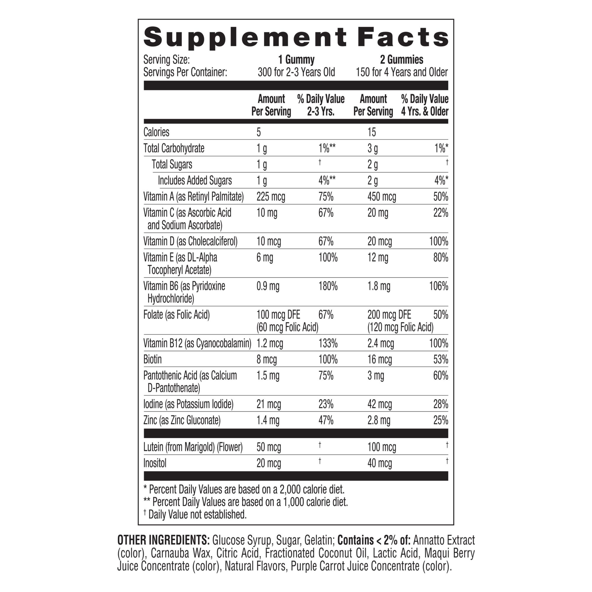 Ingredients: Active Ingredients: Vitamin A, Vitamin C, Vitamin D, Vitamin E, Vitamin B6, Folate, Vitamin B12, Biotin, Pantothenic Acid, Iodine, Zinc, Lutein, Inositol. Other Ingredients: Glucose Syrup, Sugar, Gelatin; Contains <2% Of: Annatto Extract (Color), Carnauba Wax, Citric Acid, Fractionated Coconut Oil, Lactic Acid, Maqui Berry Juice Concentrate, Natural Flavors, Purple Carrot Juice Concentrate (Color).