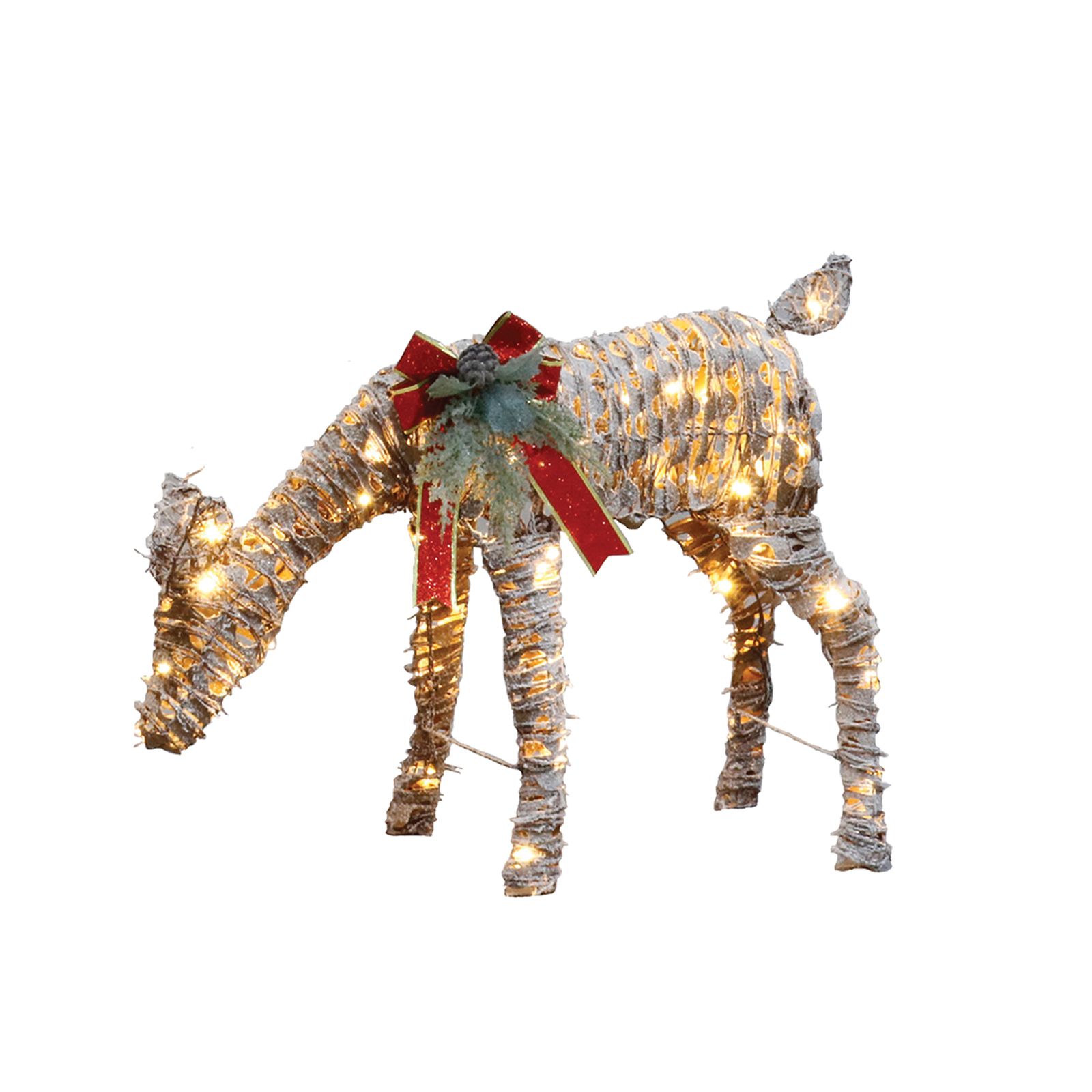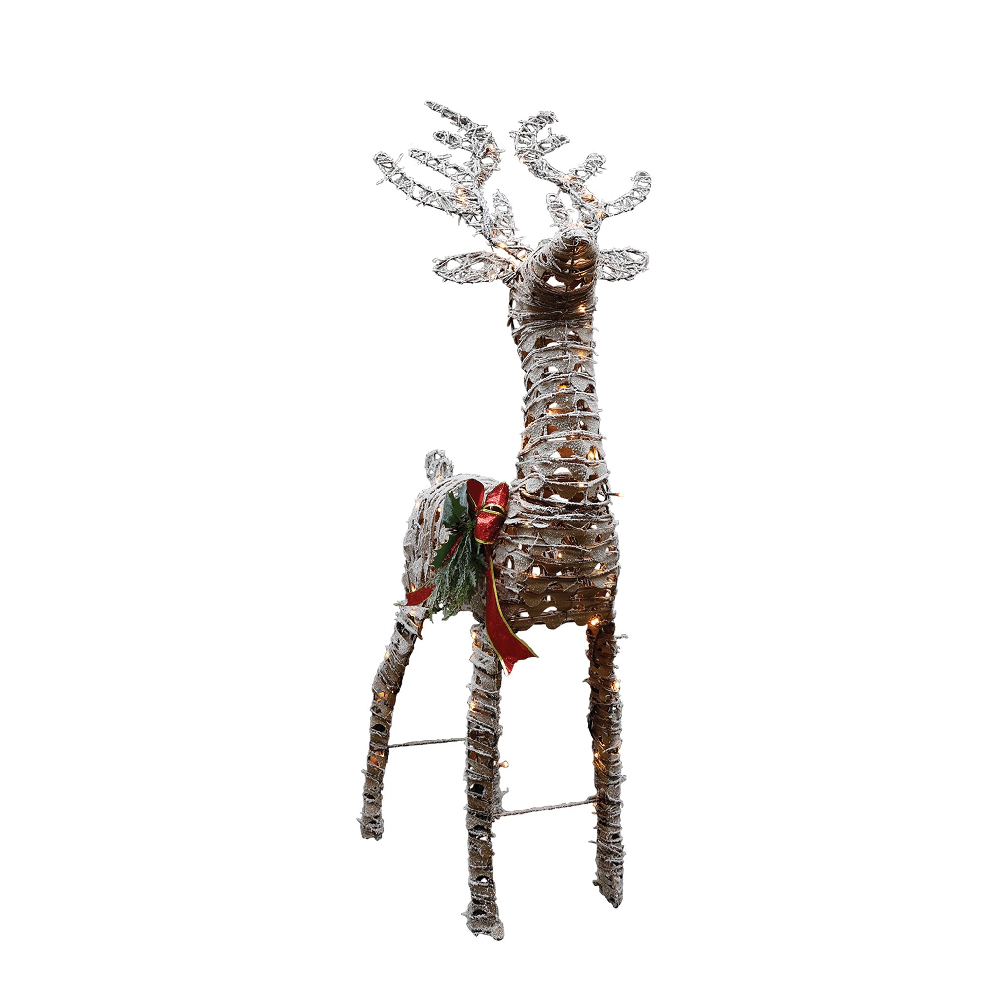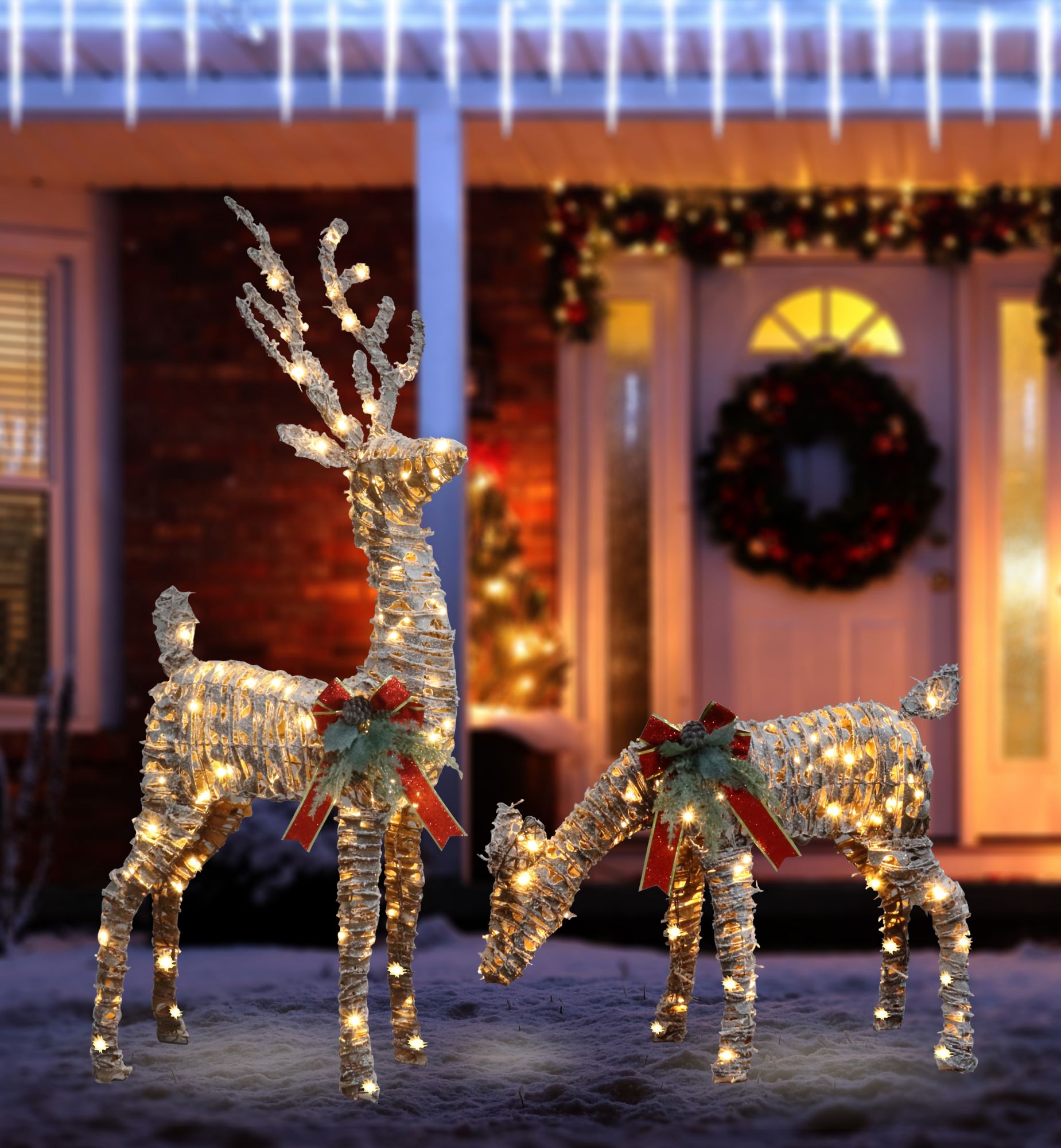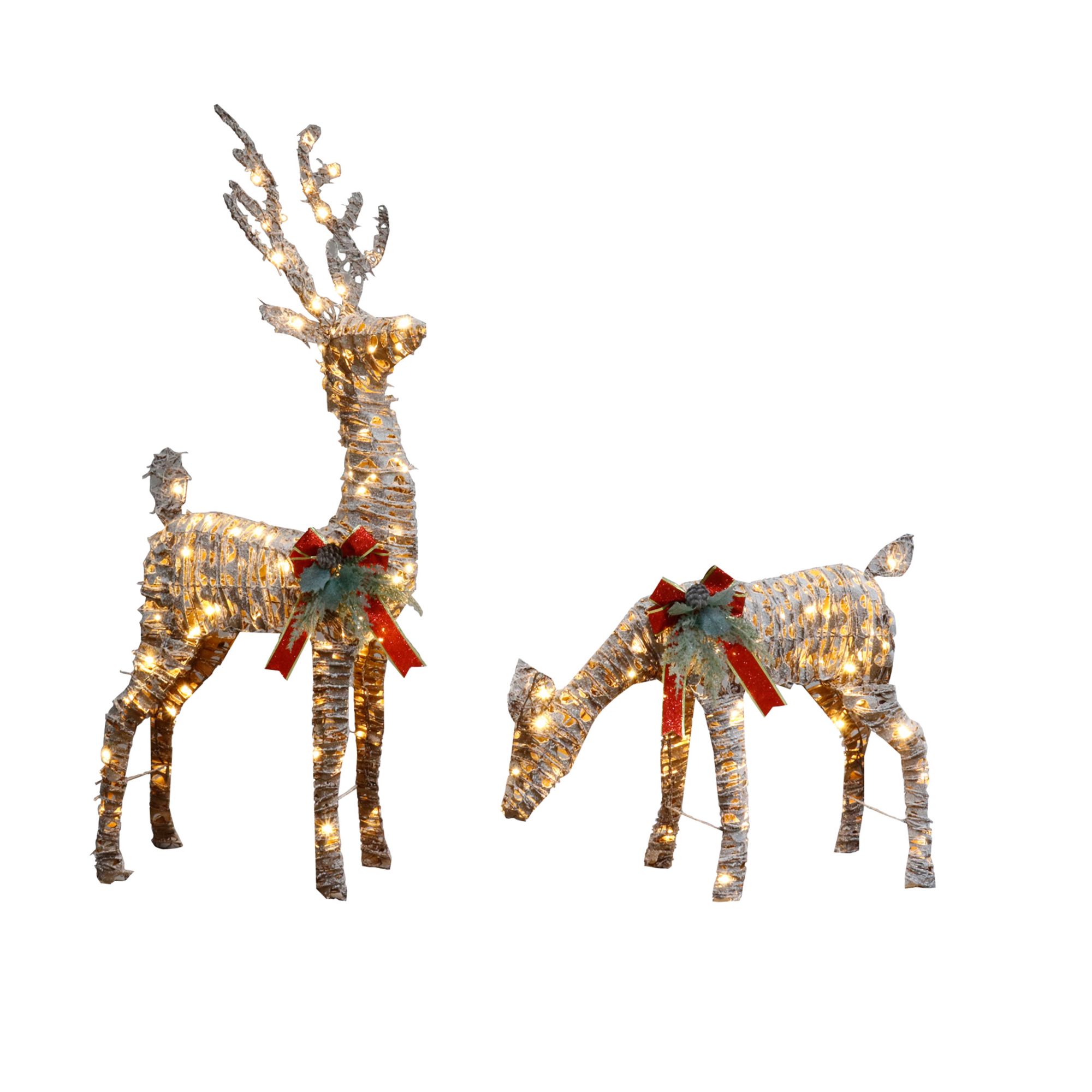 The Berkley Jensen set of two LED-lighted reindeer is the perfect addition to your holiday display this season. The reindeer are constructed of 3D metal frames and wrapped with an artificial vine with a wood-grain finish and covered with a snowy glitter effect. The 56” tall standing buck is equipped with 105 warm white low-voltage LEDs and the 25.5” tall feeding doe has 80 warm white low-voltage LEDs. This deer family is perfect to light up the yard, porch, entryway, or indoors. The set includes 20 zip ties and 8 metal stakes for easy setup and optimal presentation.