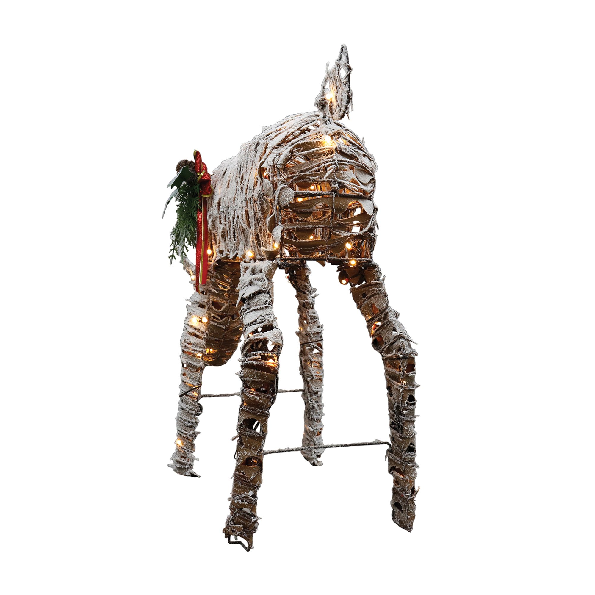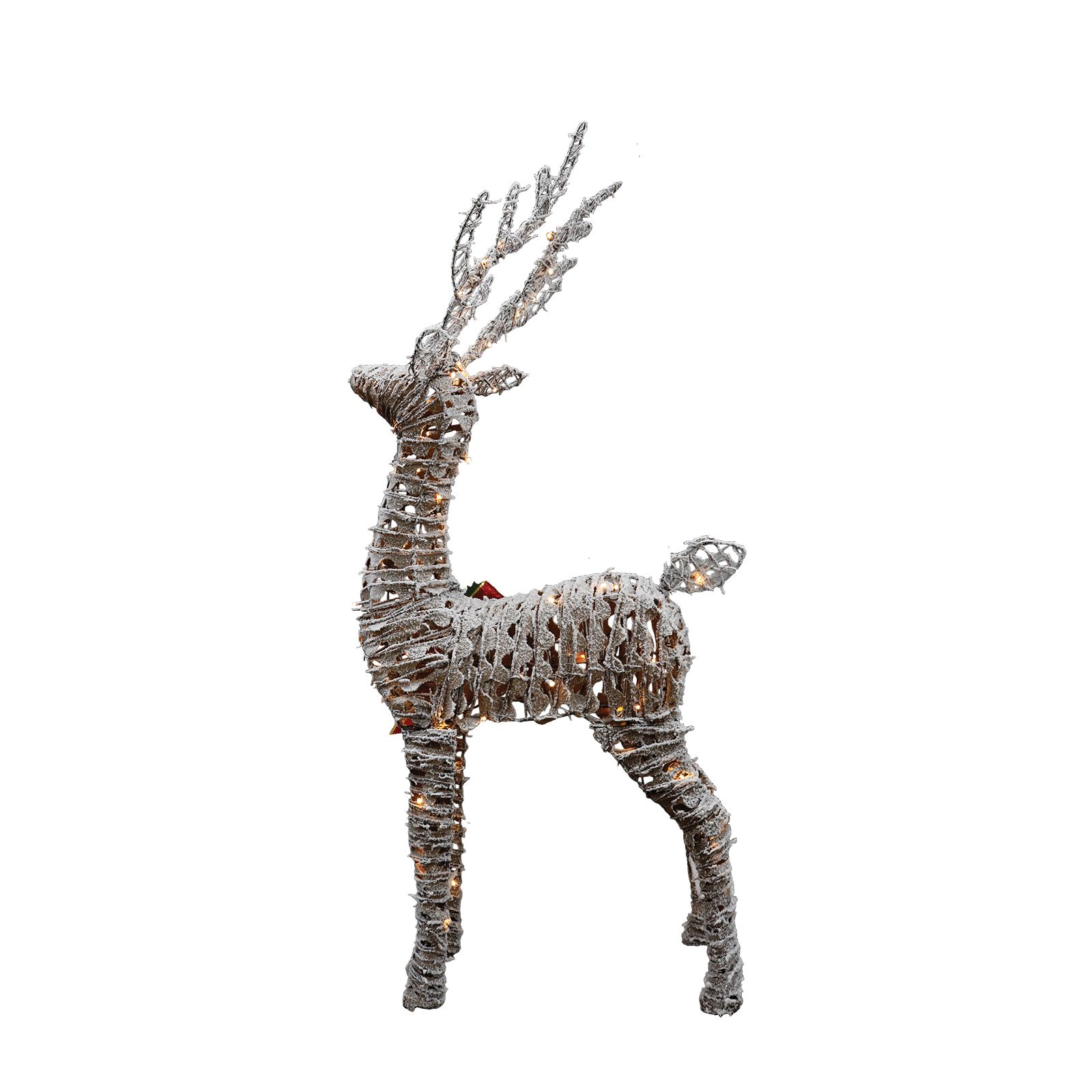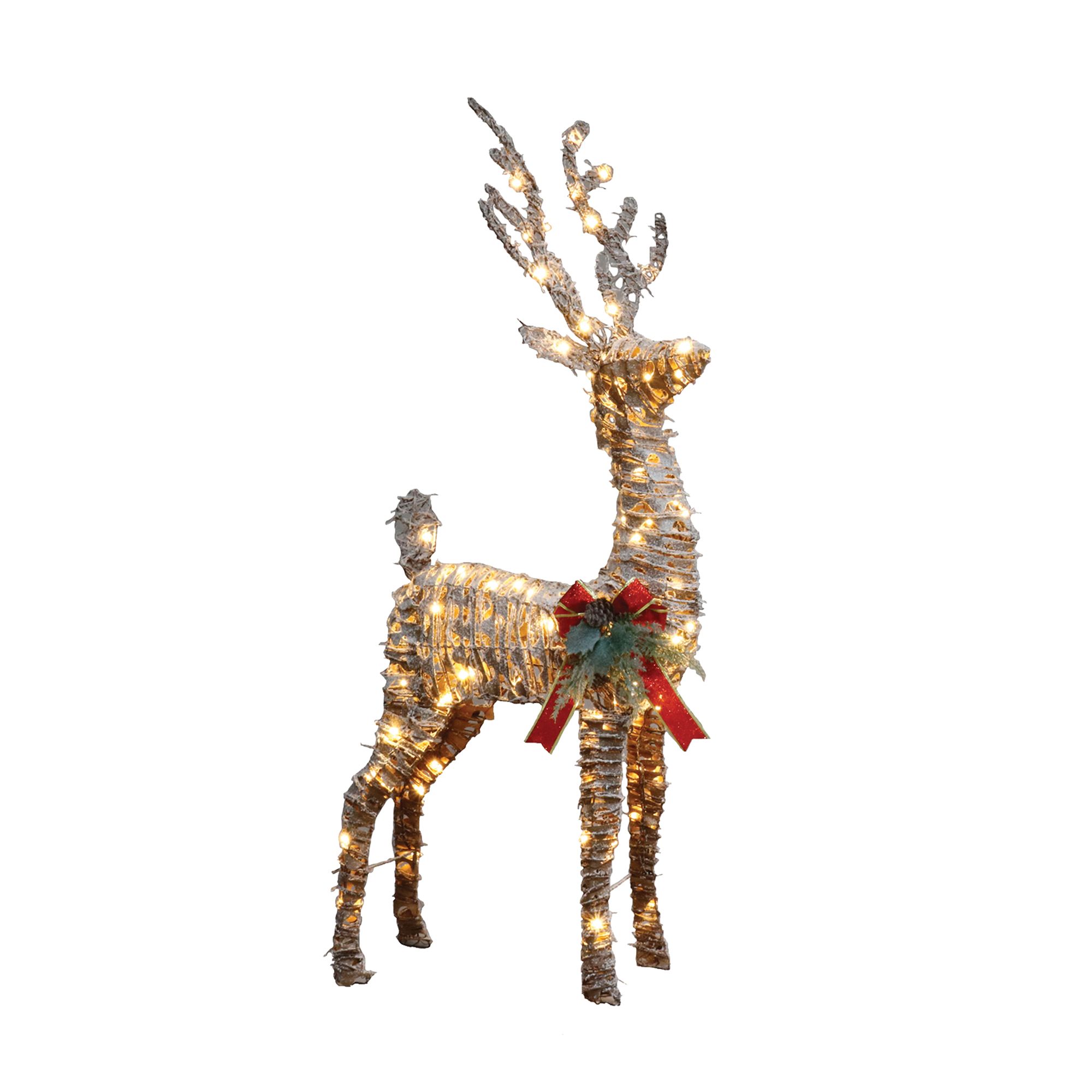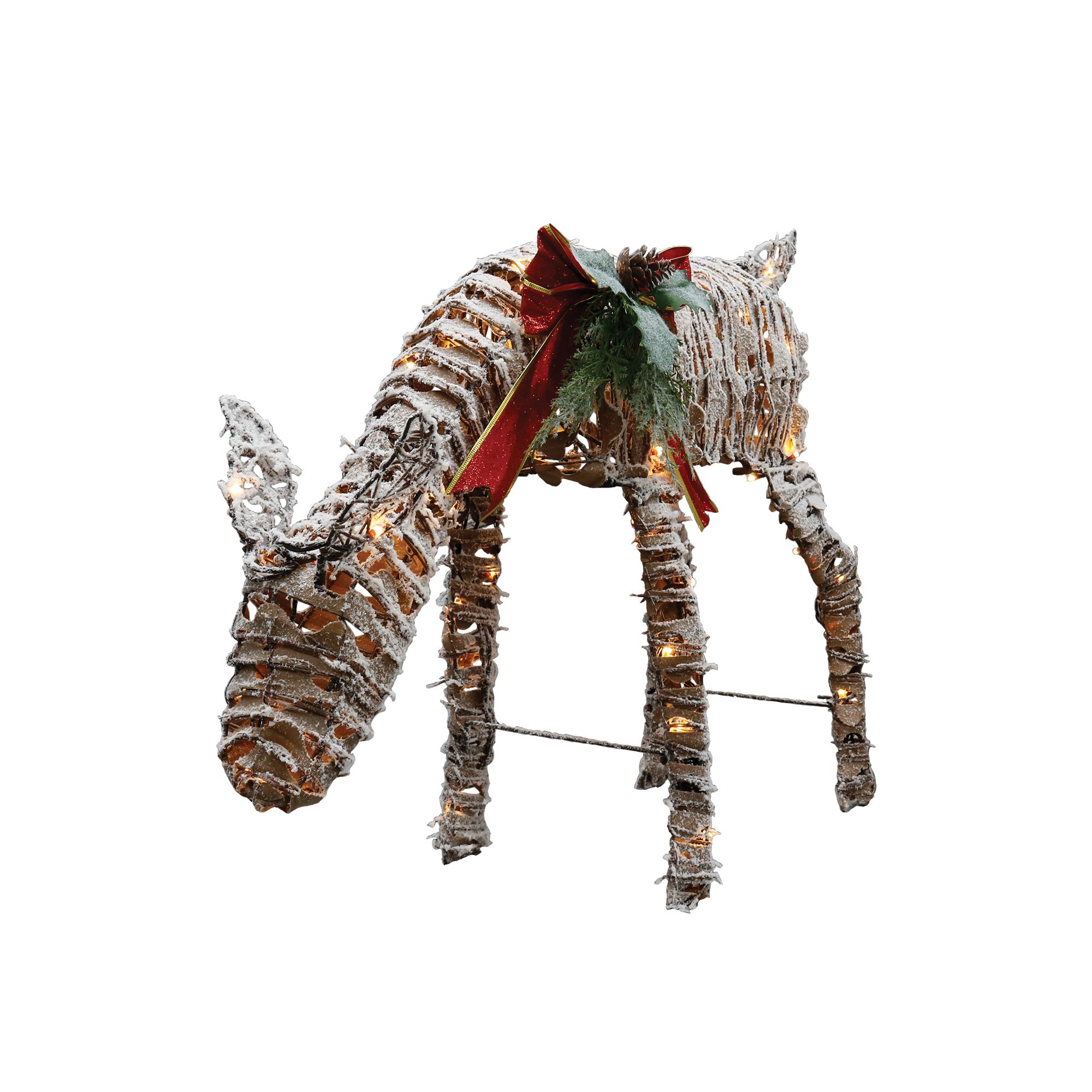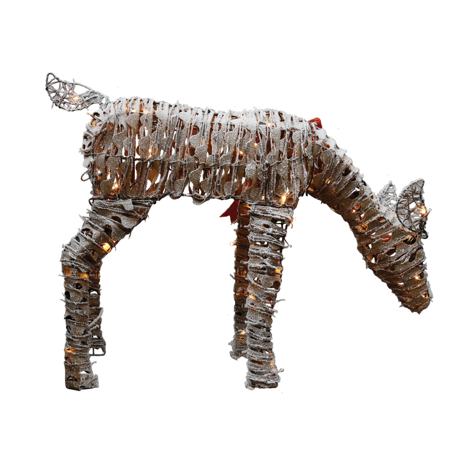The Berkley Jensen set of two LED-lighted reindeer is the perfect addition to your holiday display this season. The reindeer are constructed of 3D metal frames and wrapped with an artificial vine with a wood-grain finish and covered with a snowy glitter effect. The 56” tall standing buck is equipped with 105 warm white low-voltage LEDs and the 25.5” tall feeding doe has 80 warm white low-voltage LEDs. This deer family is perfect to light up the yard, porch, entryway, or indoors. The set includes 20 zip ties and 8 metal stakes for easy setup and optimal presentation.