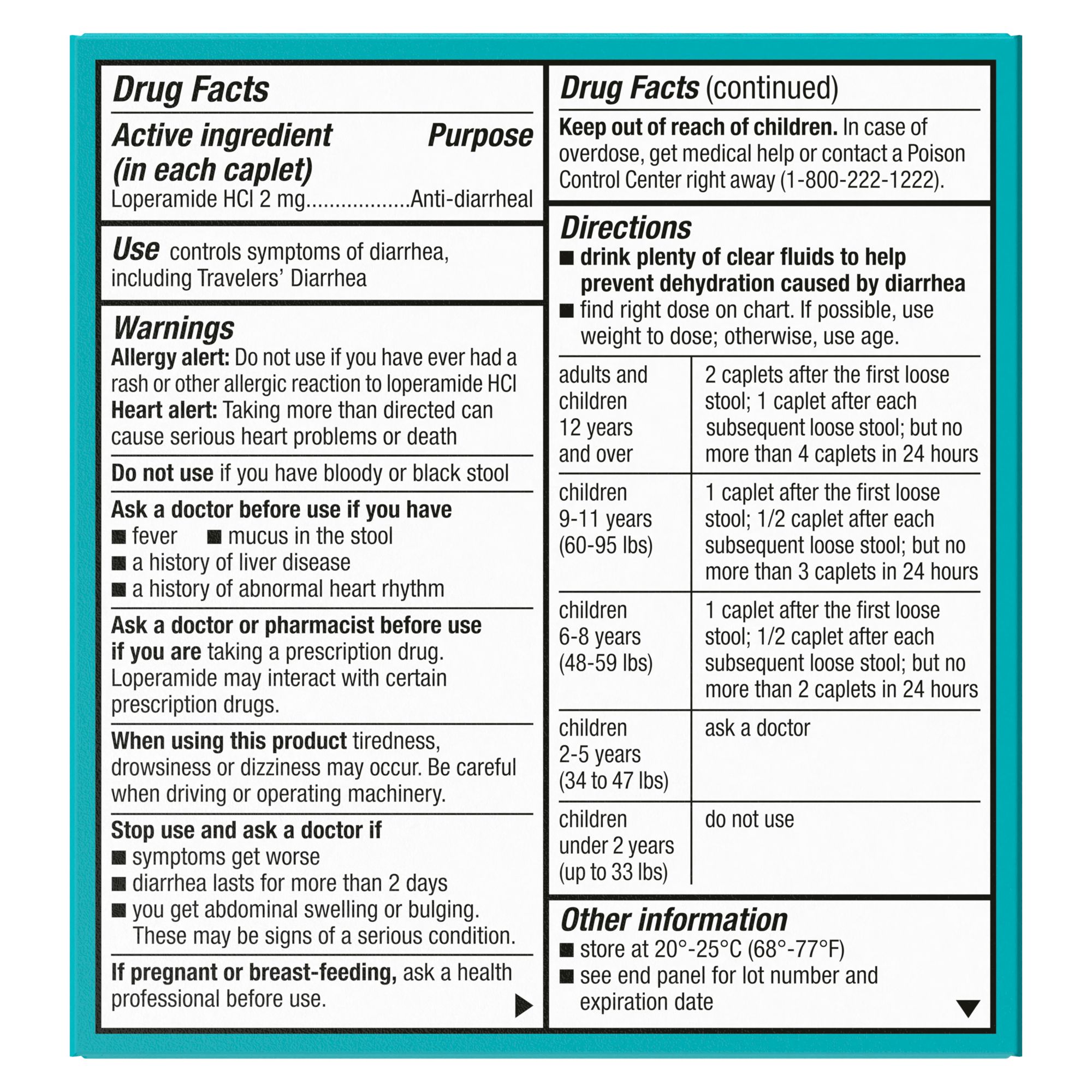 Ingredients: Active Ingredient (In Each Caplet): Loperamide HCl 2 mg. Inactive Ingredients: Anhydrous Lactose, Carnauba Wax, D&C Yellow No. 10 Aluminum Lake, FD&C Blue No. 1 Aluminum Lake, Hypromellose, Magnesium Stearate, Microcrystalline Cellulose, Polyethylene Glycol, Pregelatinized Starch.