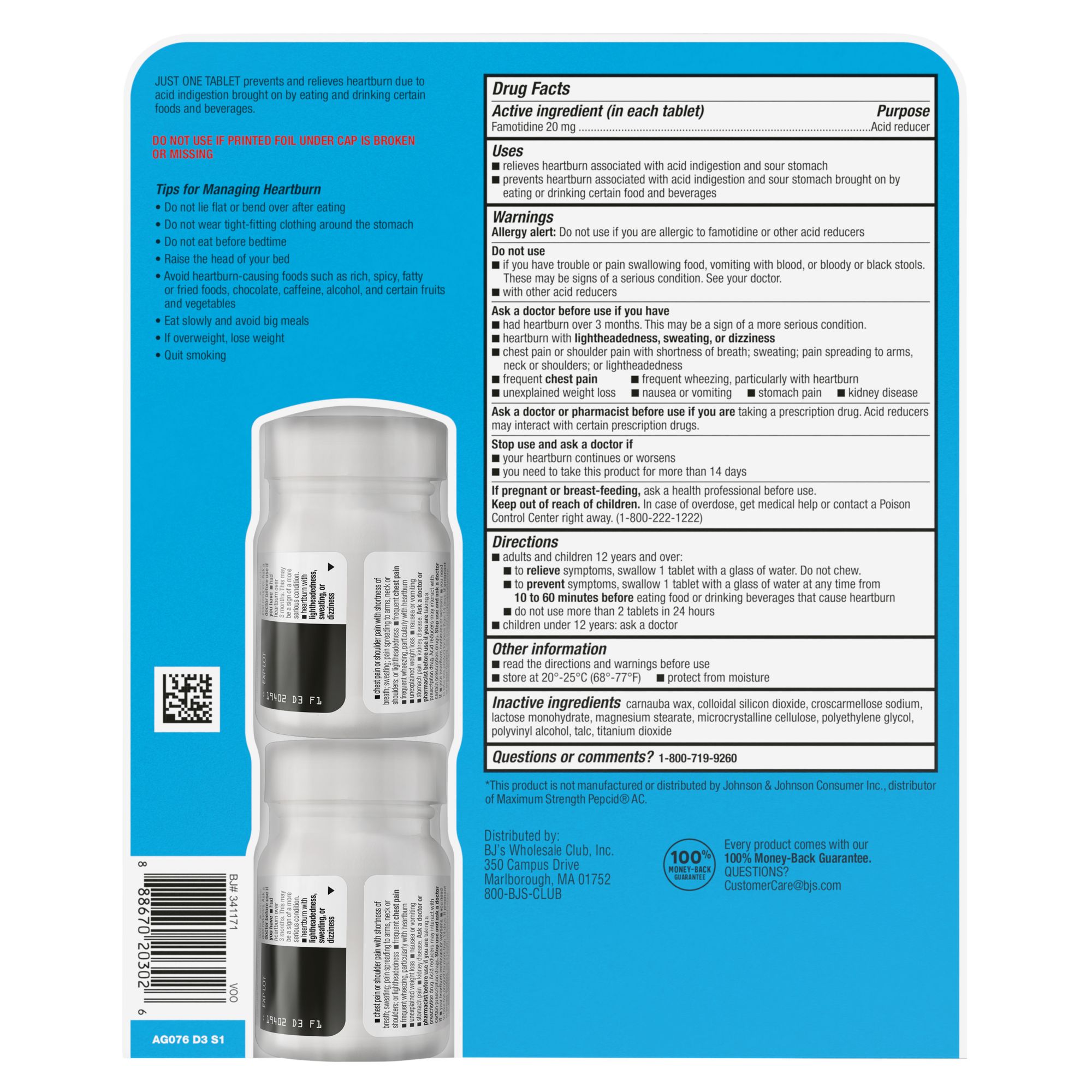 Compare to Maximum Strength Pepcid AC active ingredient. Just one tablet of Maximum Strength Famotidine Tablets, 20mg, prevents and relieves heartburn associated with acid indigestion brought on by eating and drinking certain foods and beverages. This gluten-free heartburn medicine is intended for adults and children 12 years and over. Maximum Strength Famotidine Tablets, 20mg helps prevent meal-induced heartburn when taken at least 10-60 minutes before eating. Lasts up to 12 hours.