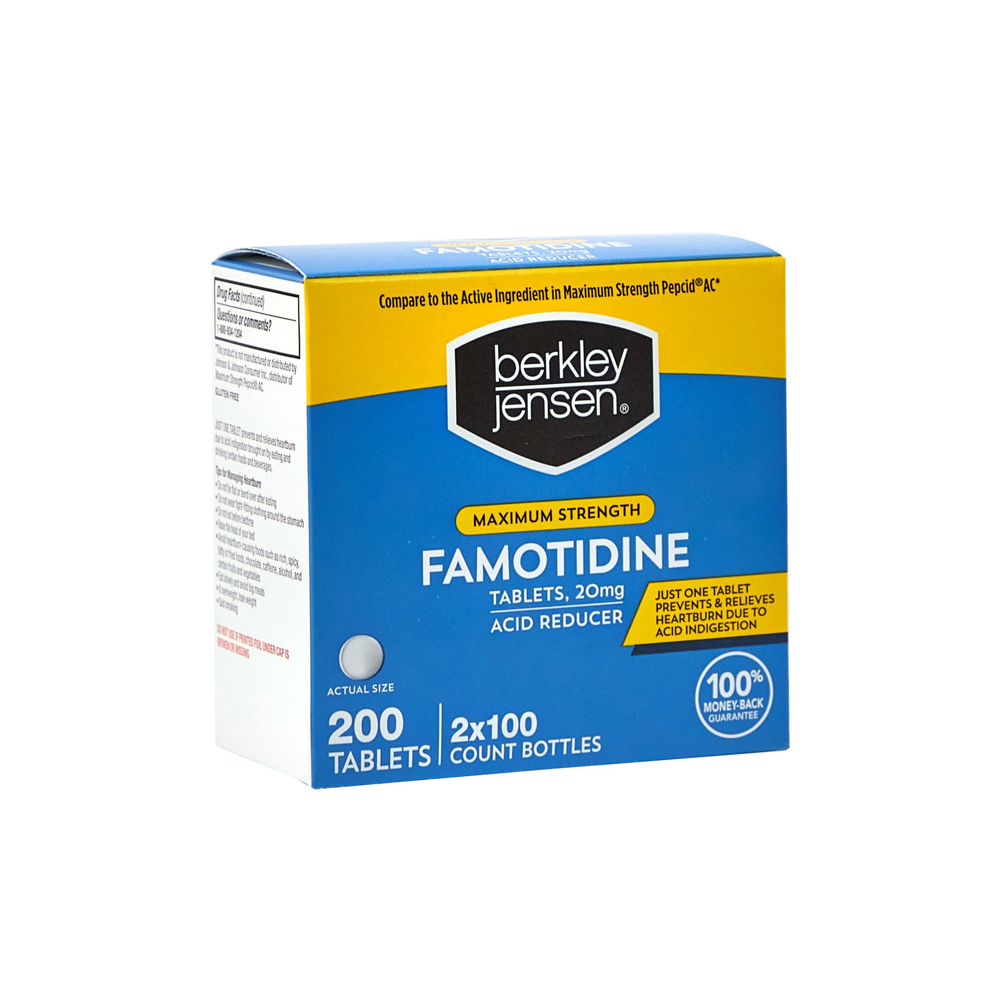 Berkley Jensen Maximum Strength Famotidine Tablets are a reliable and affordable option for preventing and relieving heartburn associated with acid indigestion. With just one tablet, this gluten-free medicine provides up to 12 hours of relief for adults and children 12 years and over.