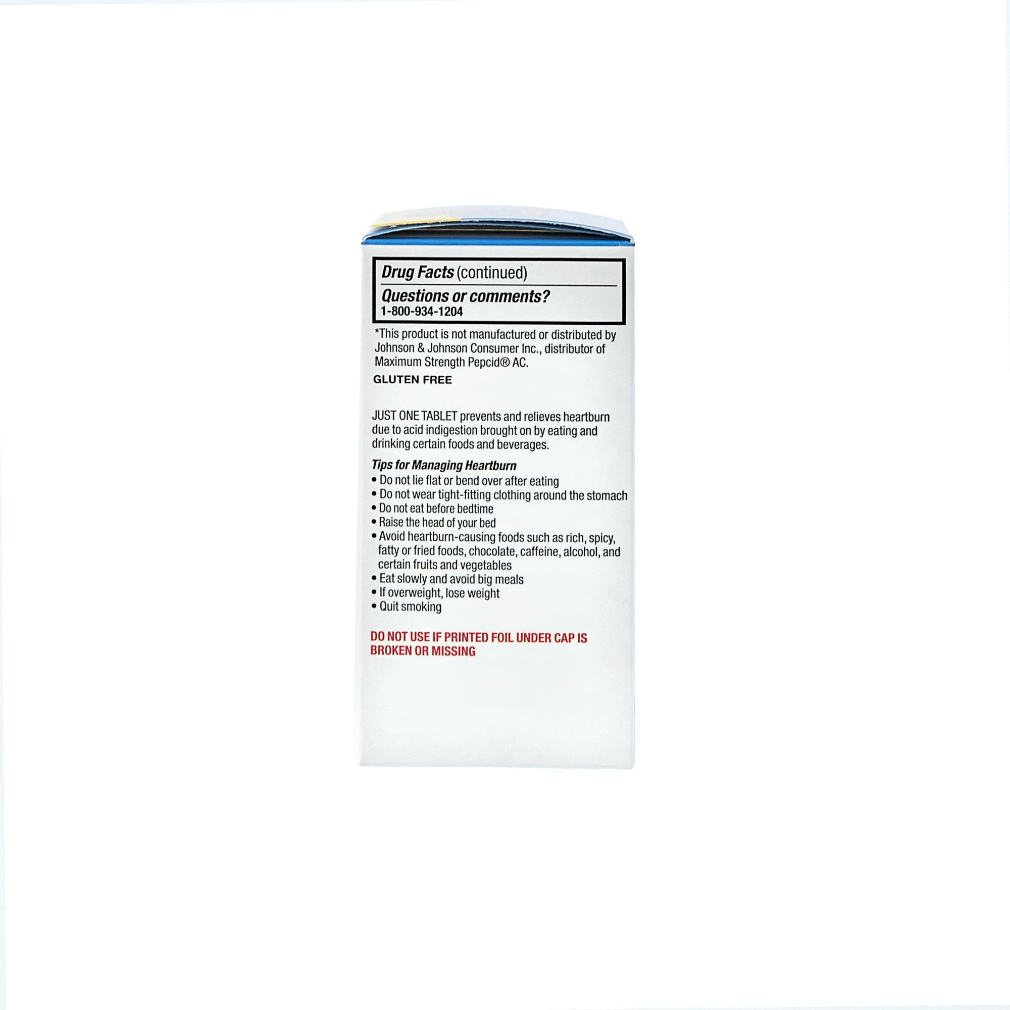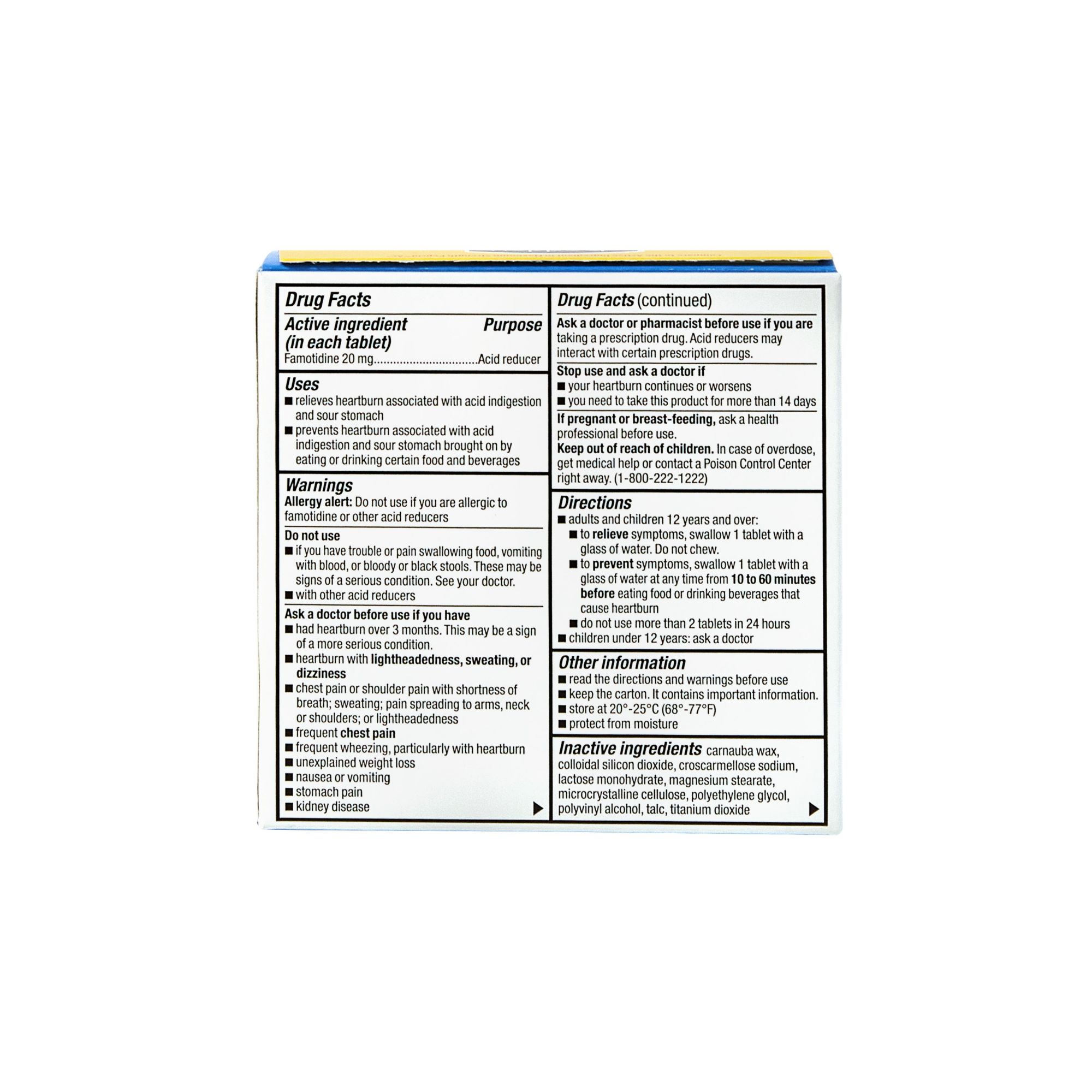 This product contains 20 mg of famotidine, an acid reducer for heartburn relief, which compares to the active ingredient in Maximum Strength Pepcid AC