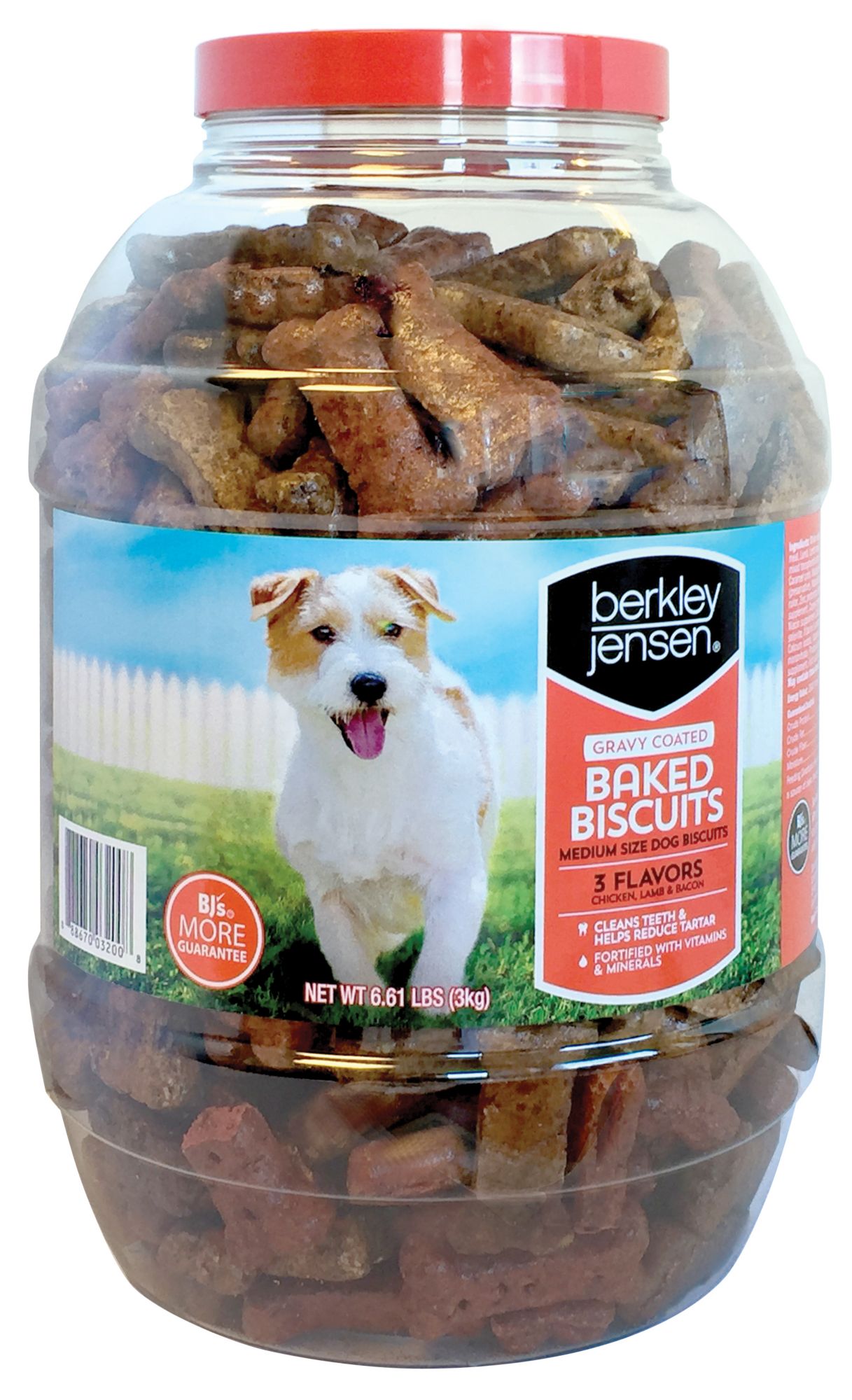 Gravy coated treat for your pet Cleans teeth and helps reduce tartar Fortified with vitamins and minerals Three flavors: chicken, bacon and lamb Includes 6.6 lbs. of dog biscuits