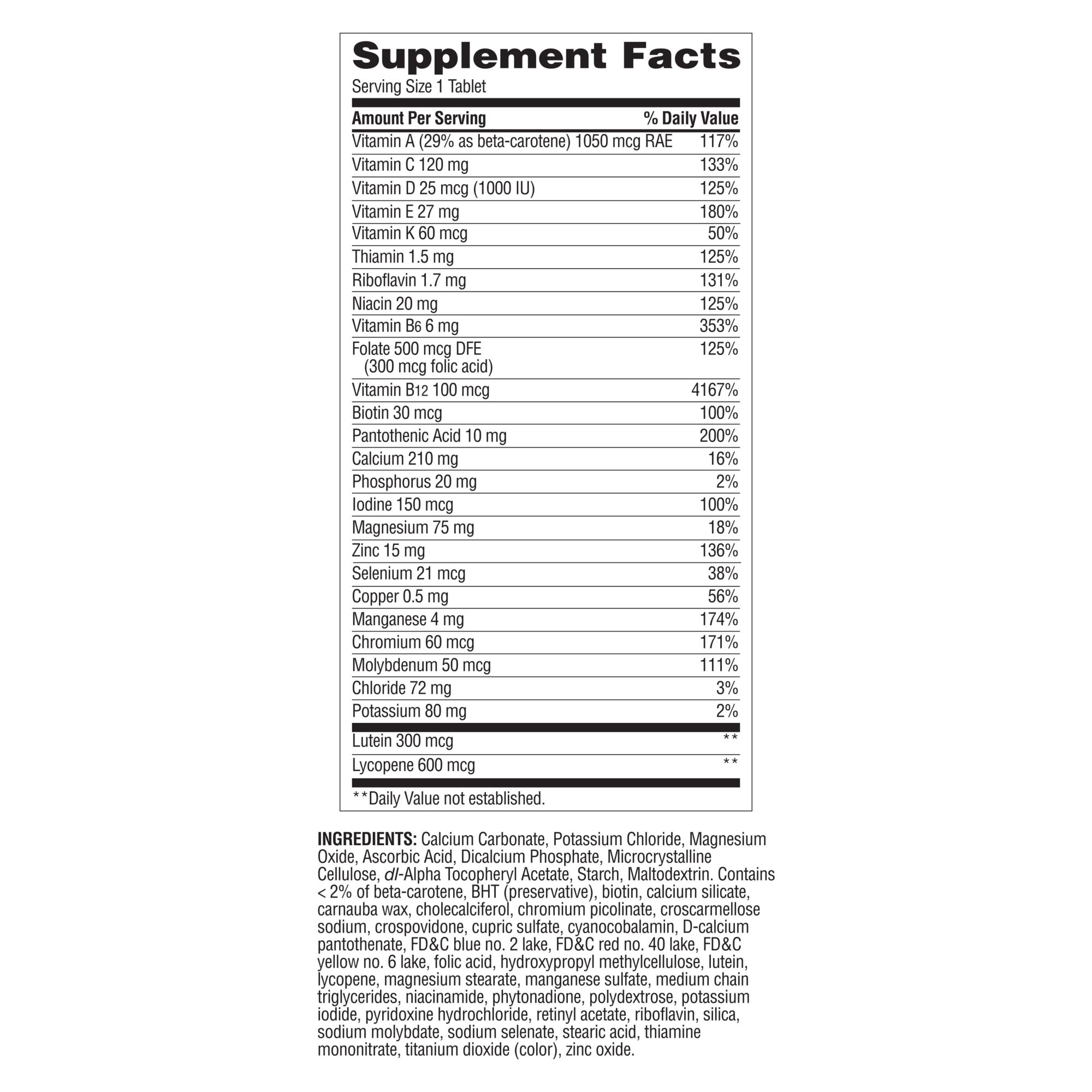Ingredients: Calcium Carbonate, Potassium Chloride, Magnesium Oxide, Ascorbic Acid, Dicalcium Phosphate, Microcrystalline Cellulose, Maltodextrin, Dl-Alpha Tocopheryl Acetate, Starch, Maltodextrin. Contains < 2% of Beta-Carotene, BHT (Preservative), Biotin, Calcium Silicate, Carnauba Wax, Cholecalciferol, Chromium Picolinate, Croscarmellose Sodium, Crospovidone, Cupric Sulfate, Cyanocobalamin, D-Calcium Pantothenate, FD&C Blue No. 2 Lake, FD&C Red No. 40 Lake, FD&C Yellow No. 6 Lake, Folic Acid, Hydroxypropyl Methylcellulose, Lutein, Lycopene, Magnesium Stearate, Manganese Sulfate, Medium Chain Triglycerides, Niacinamide, Phytonadione, Polydextrose, Potassium Iodide, Pyridoxine Hydrochloride, Retinyl Acetate, Riboflavin, Silica, Sodium Molybdate, Sodium Selenate, Stearic Acid, Thiamine Mononitrate, Titanium Dioxide (Color), Zinc Oxide.